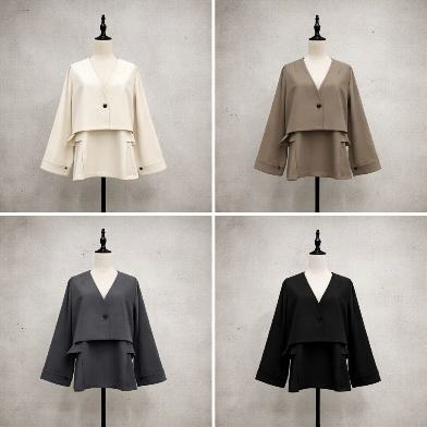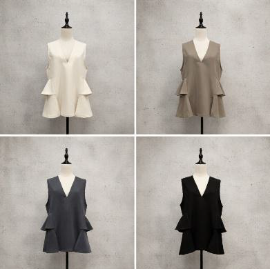 コンパクトな着丈のノーカラーショートジャケットとウエストから立体的なフリル切り替えを入れたペプラムシルエットのベストのセットです。