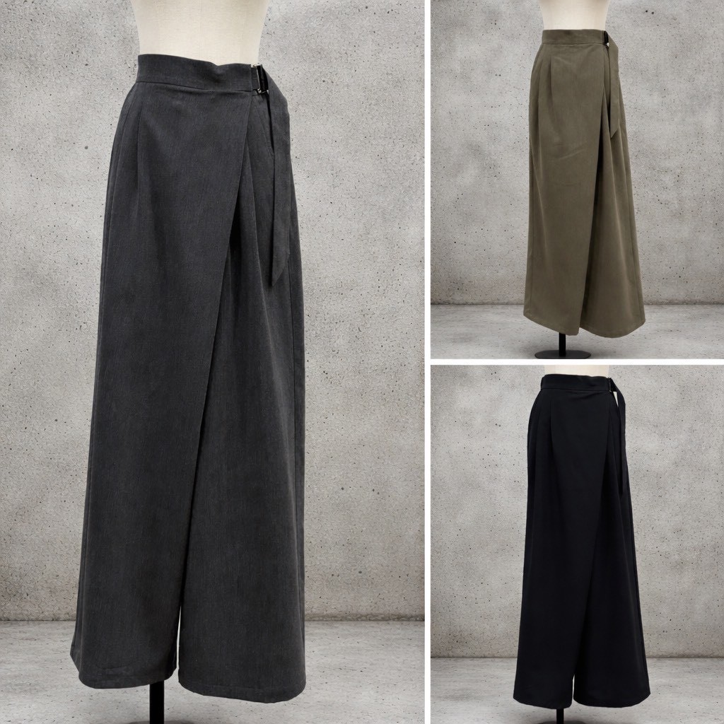 サイドのベルトデザインがアクセントになったラップパンツです。後ろウエストはゴムになっており、リラックスした着用感です。前の合わせ部分でボタンが三段階に調整できるのも嬉しいポイント。
