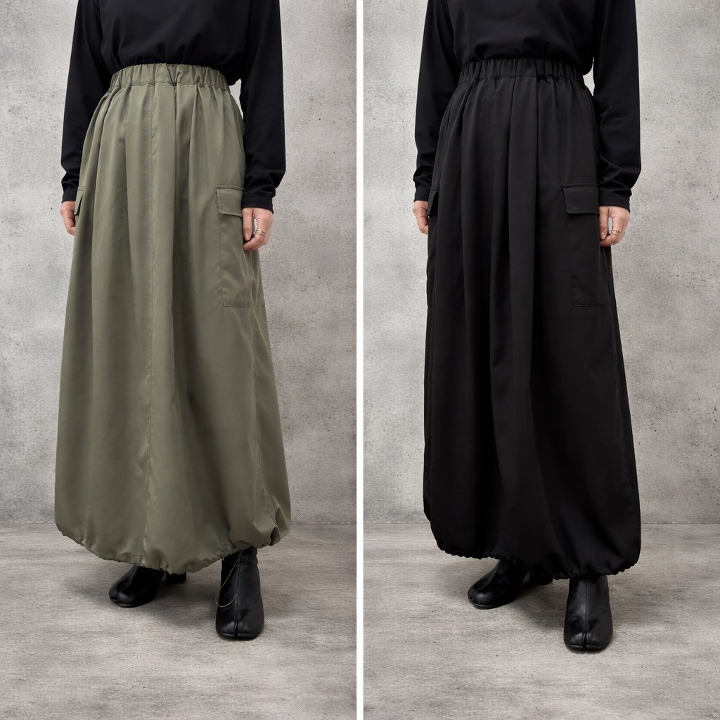 裾のドローコードでバルーンシルエット、裾を絞らずタックギャザースカートと様々なコーディネートを楽しめます。