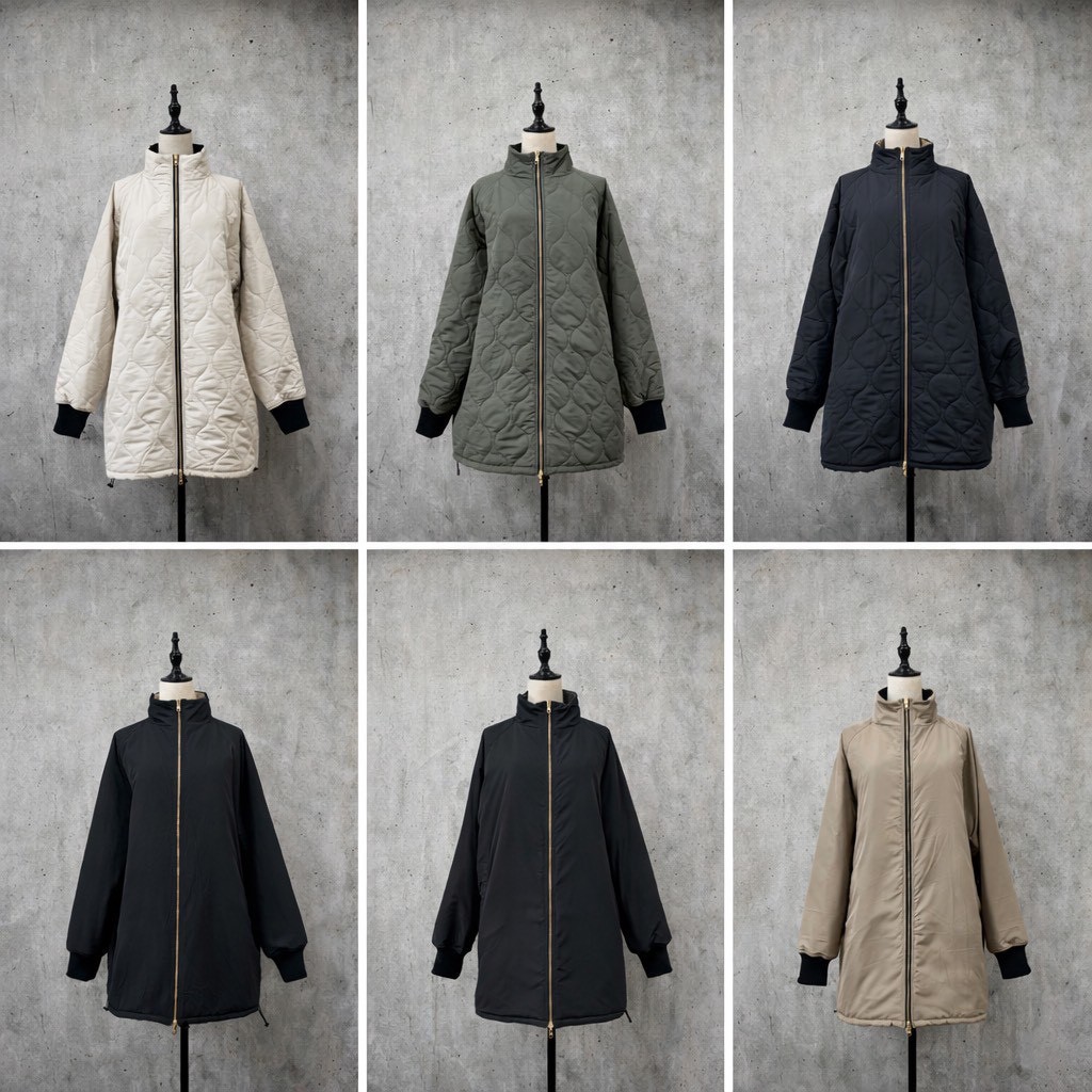 程よくルーズでオーバーサイズのシルエットのミドル丈の中綿入りコート。