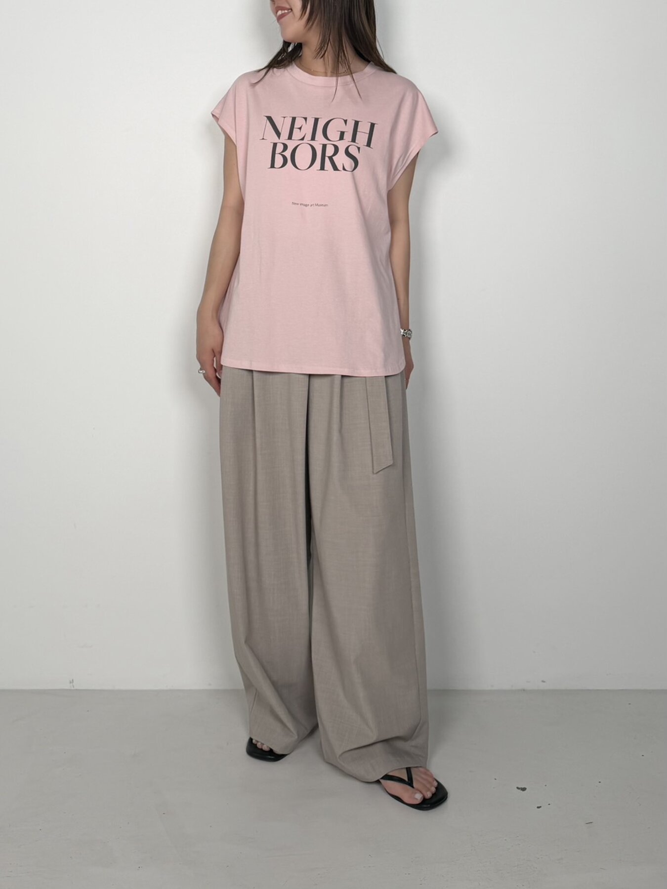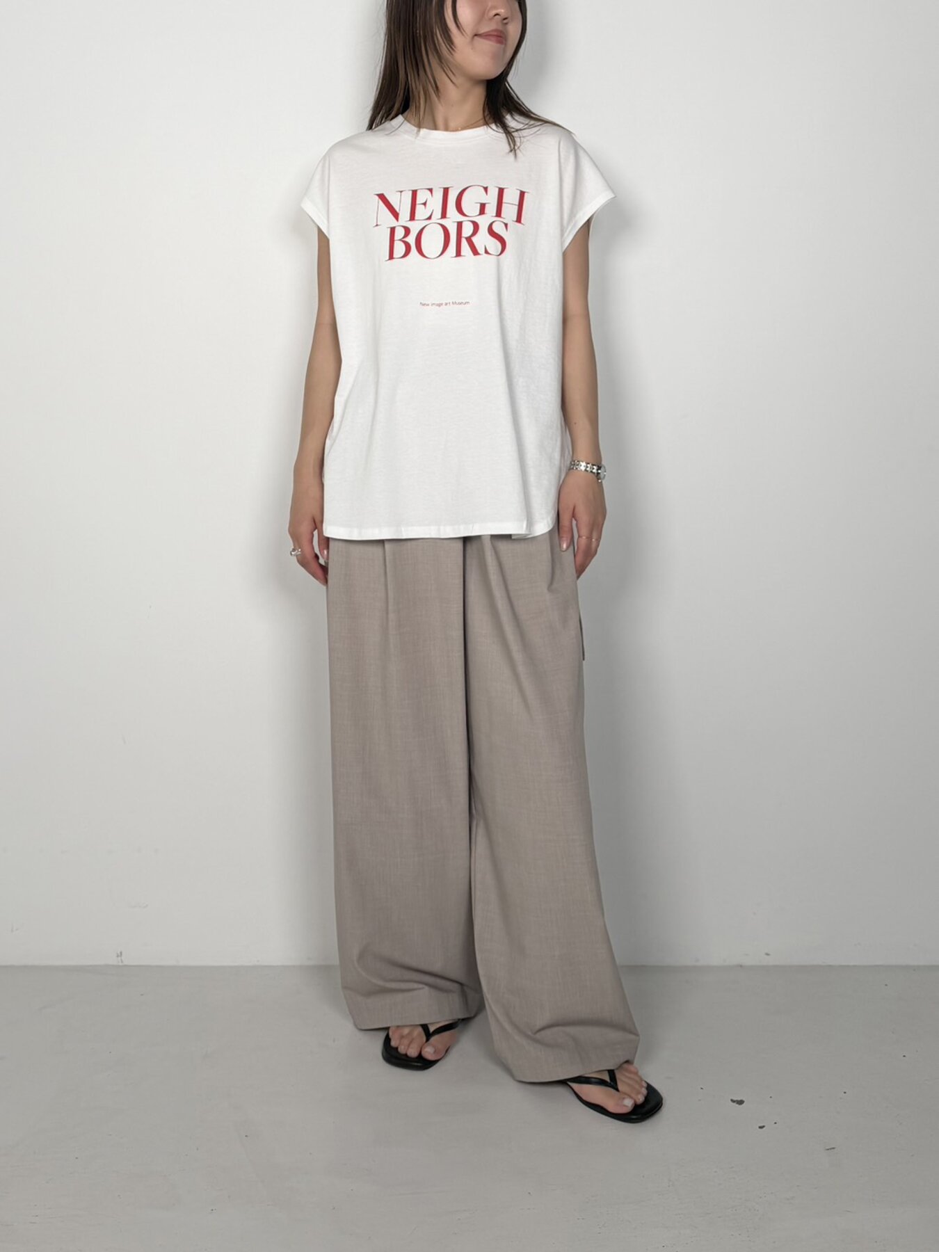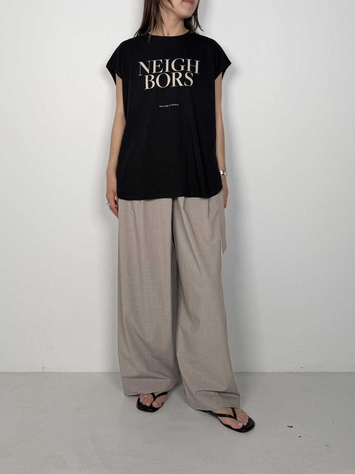 「NEIGHBORS」のロゴが、シンプルな中にほどよいアクセントをプラス。配色のコントラストで、スタイリングを一気に引き締めてくれます。