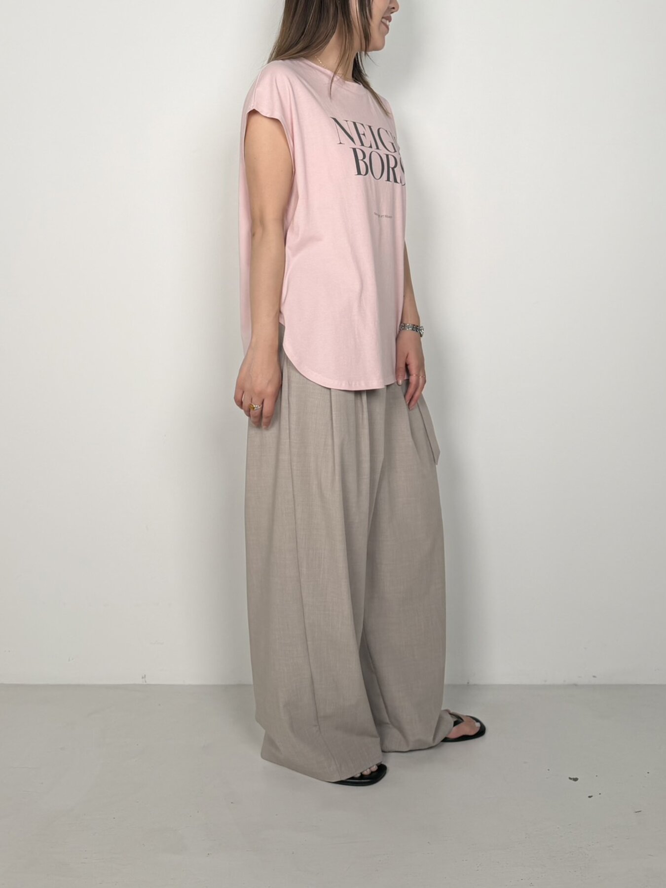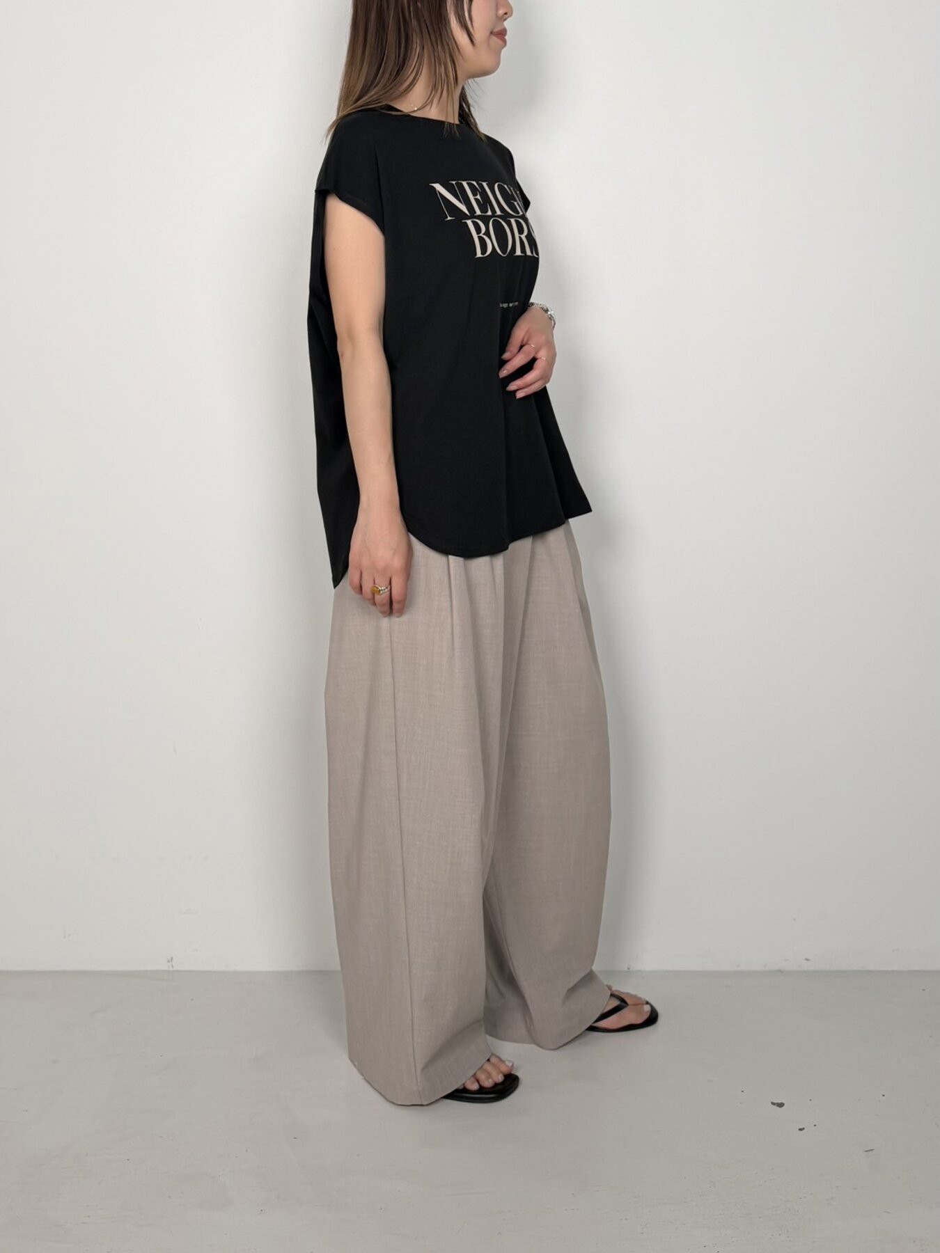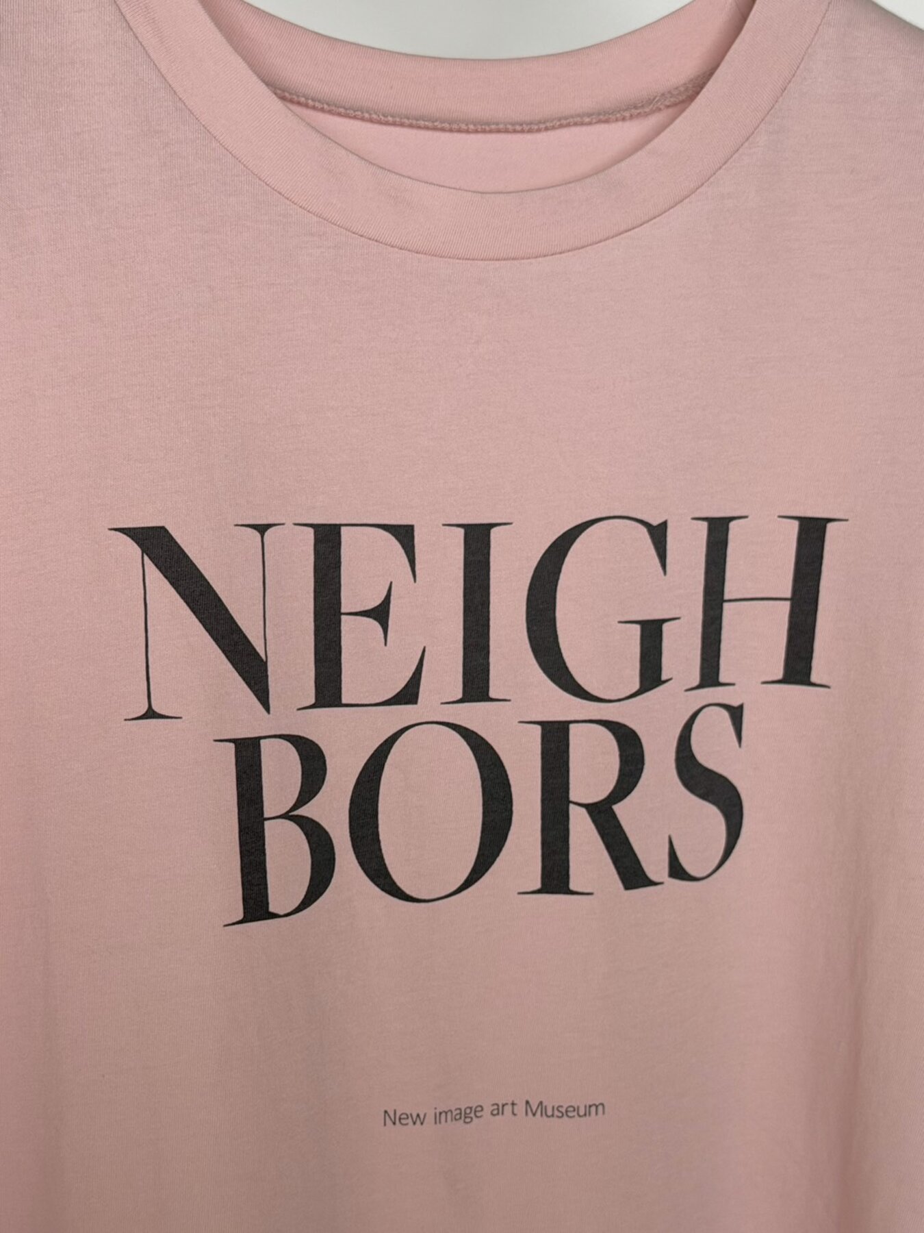 「NEIGHBORS」のロゴが、シンプルな中にほどよいアクセントをプラス。配色のコントラストで、スタイリングを一気に引き締めてくれます。