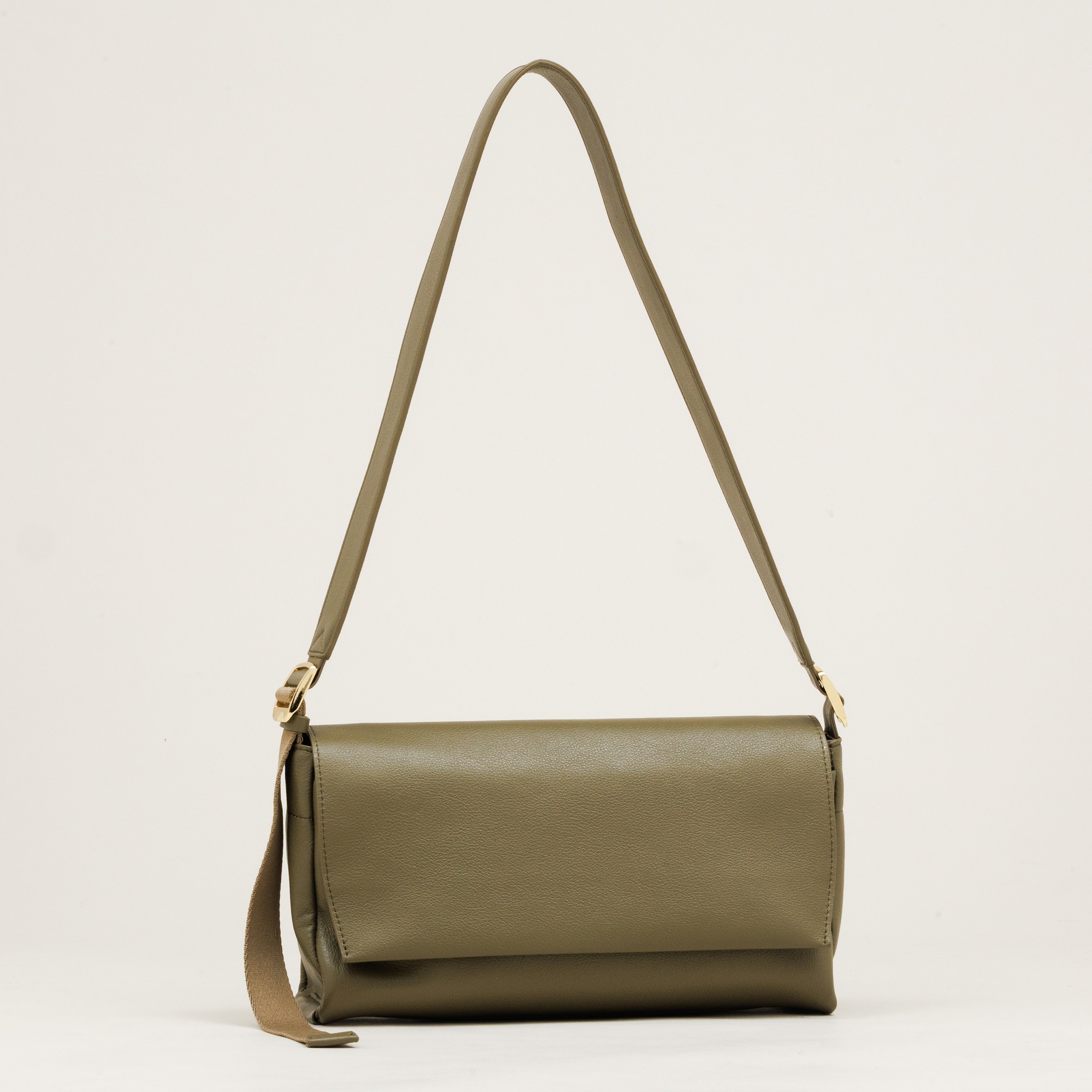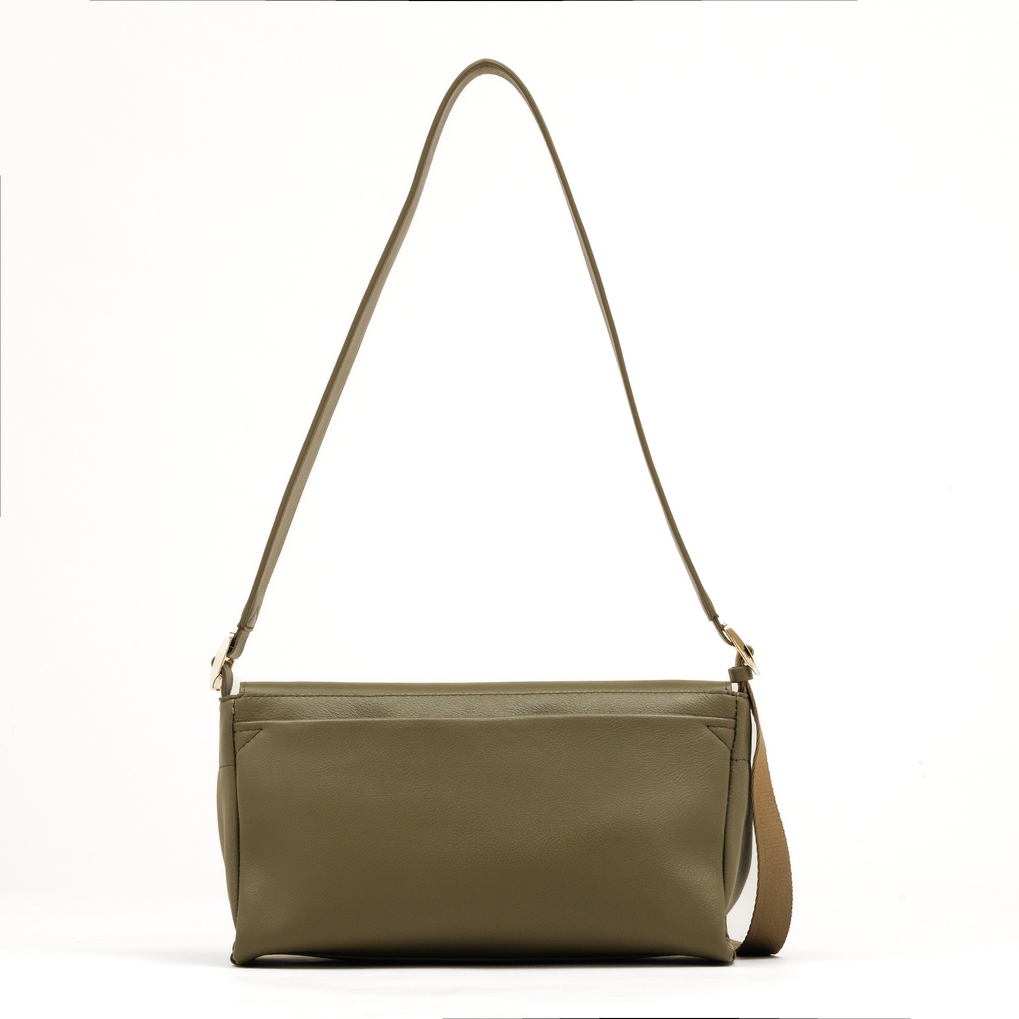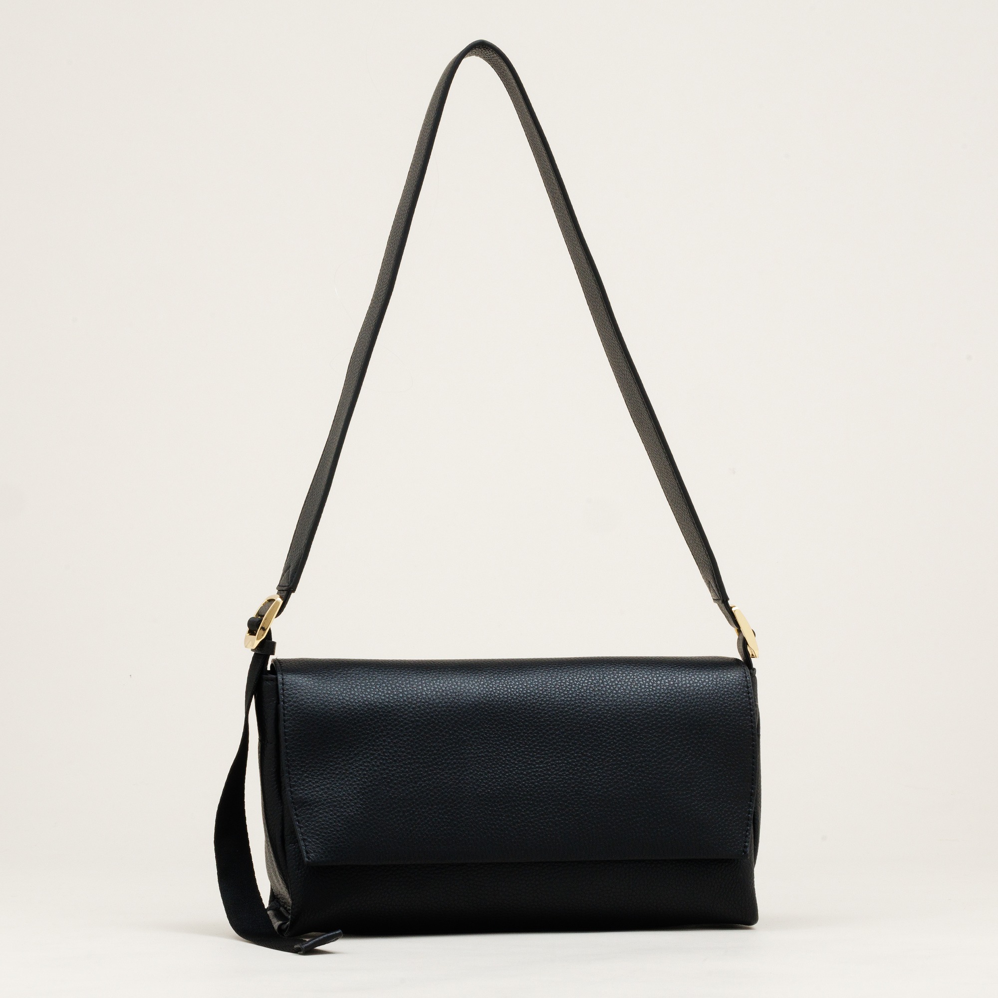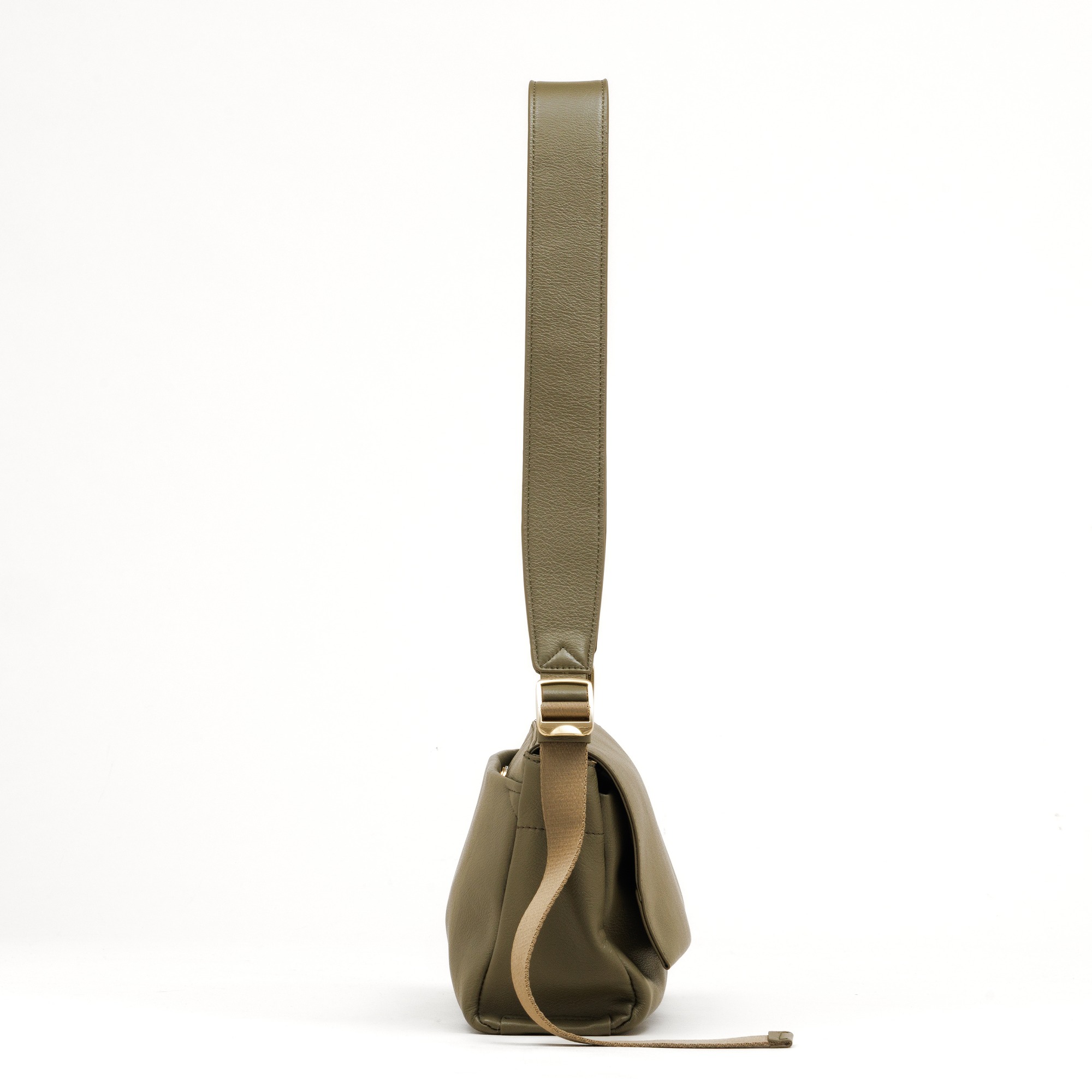 本革ならではの上品な風合いに金具のライトゴールドが映えるフラップボディバッグ。
