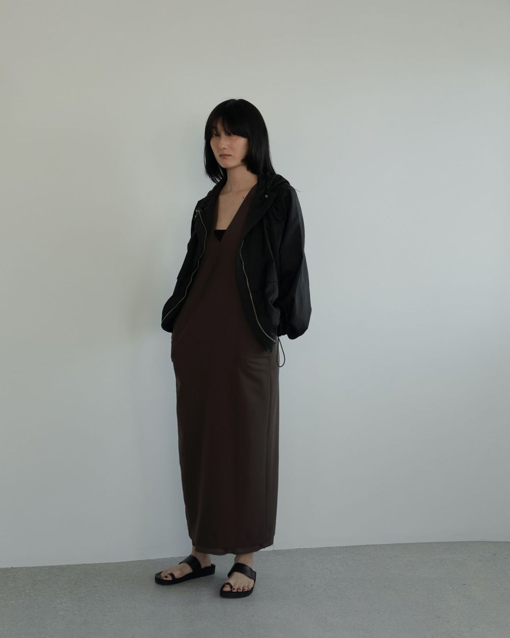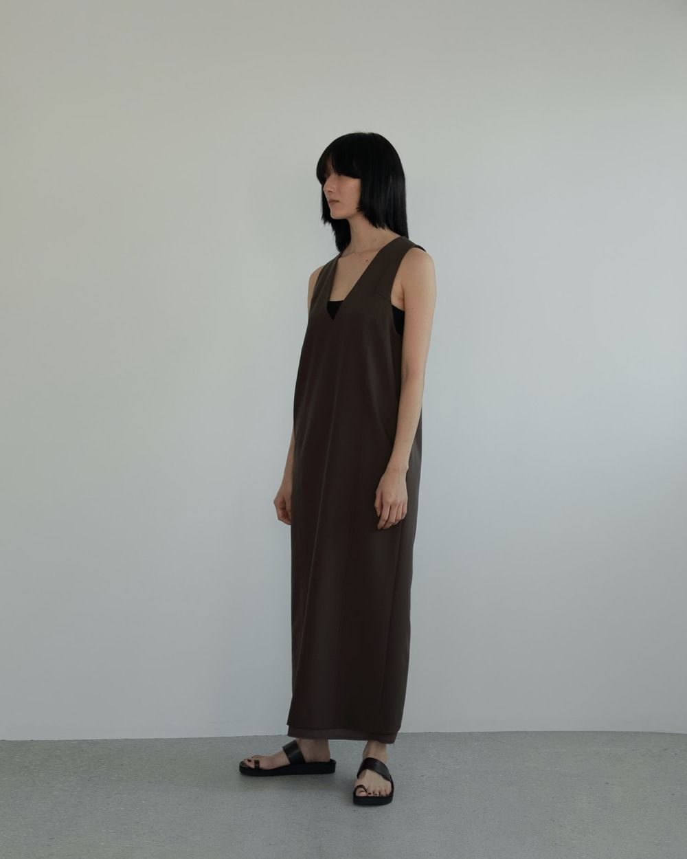 ON&OFF着回していただきやすい、綺麗目に仕上げたVネックワンピース。裾のカットオフと別生地のさりげないレイヤードデザインがポイント。ゆとりあるストンとしたシルエットで、コンパクトなトップスはもちろん、ブラウスをレイヤードしたり、キャミ等と合わせて一枚で着ていただくのもおすすめです。