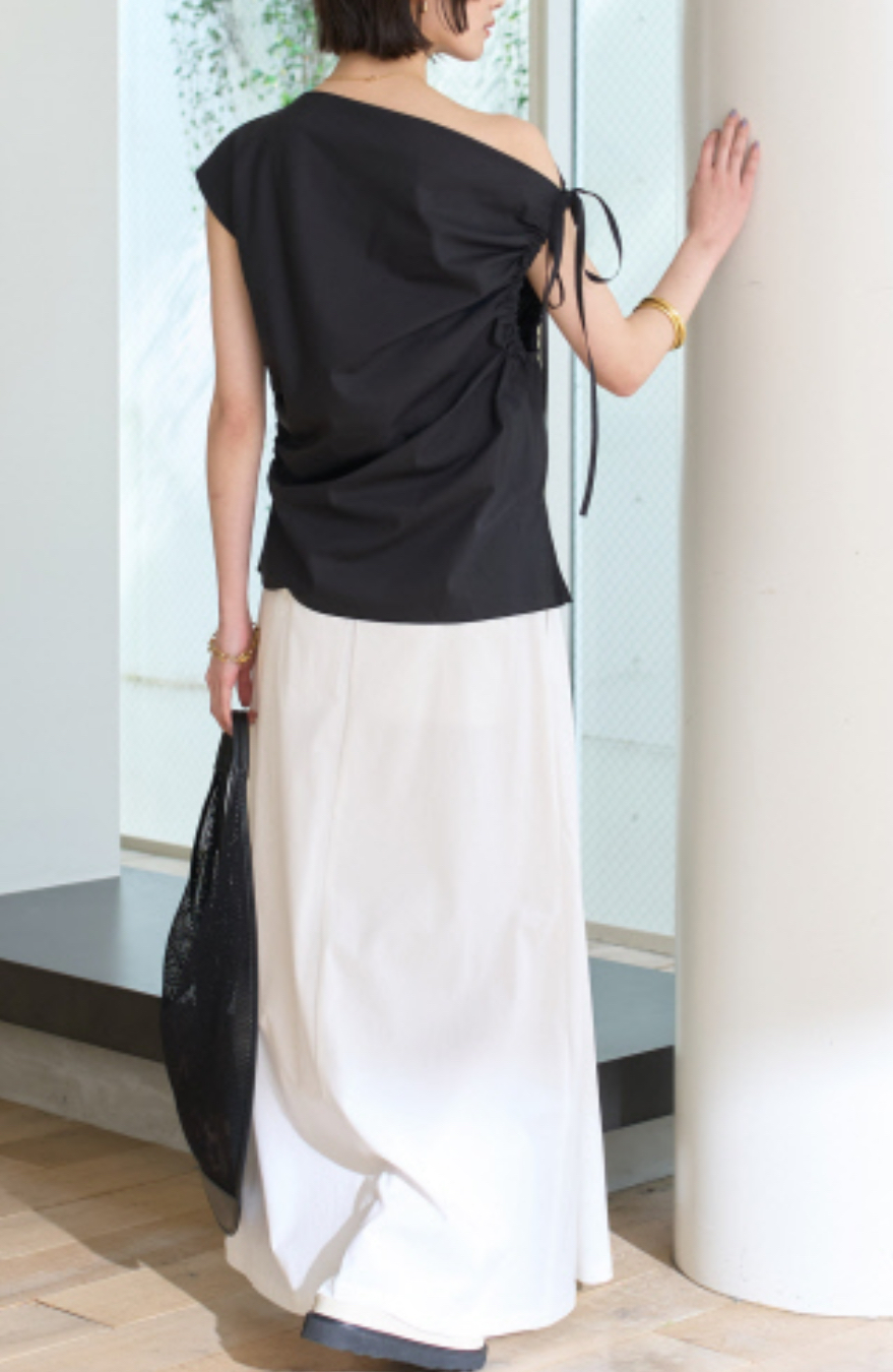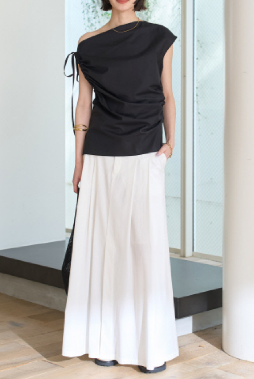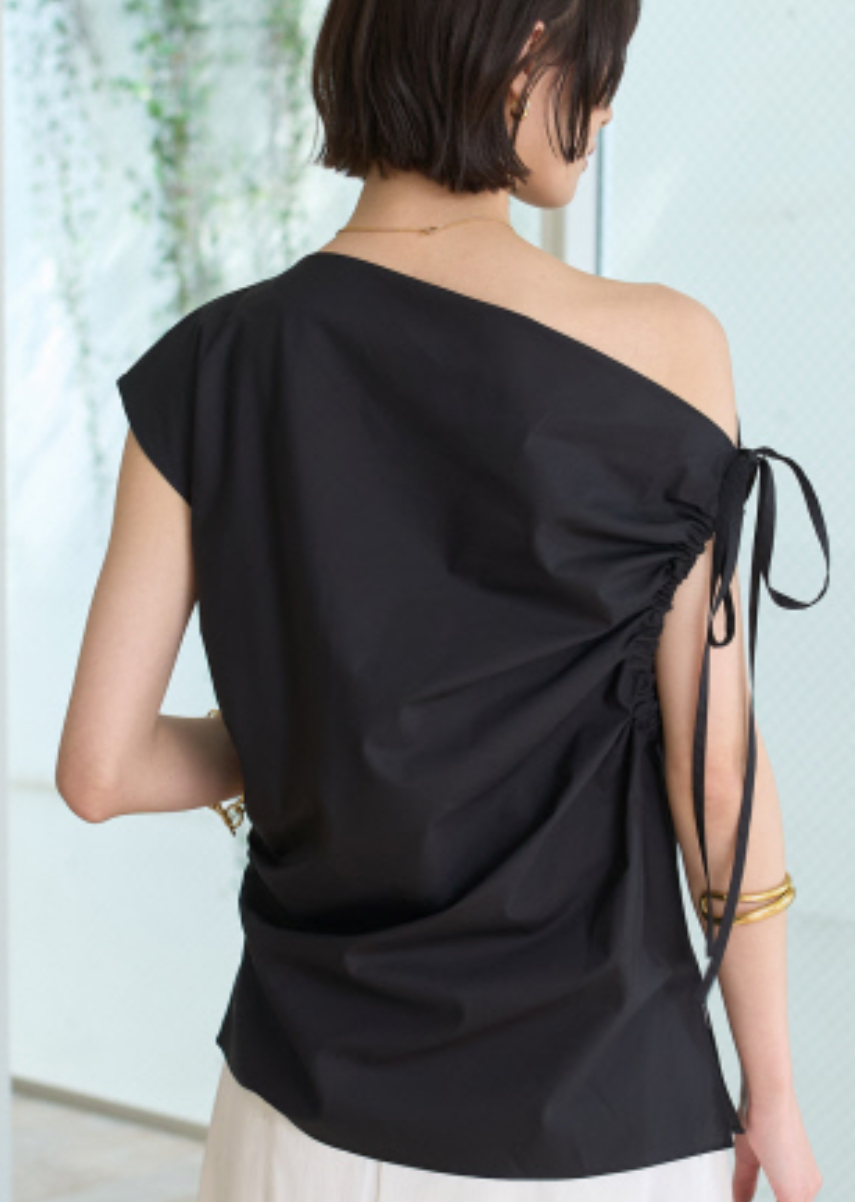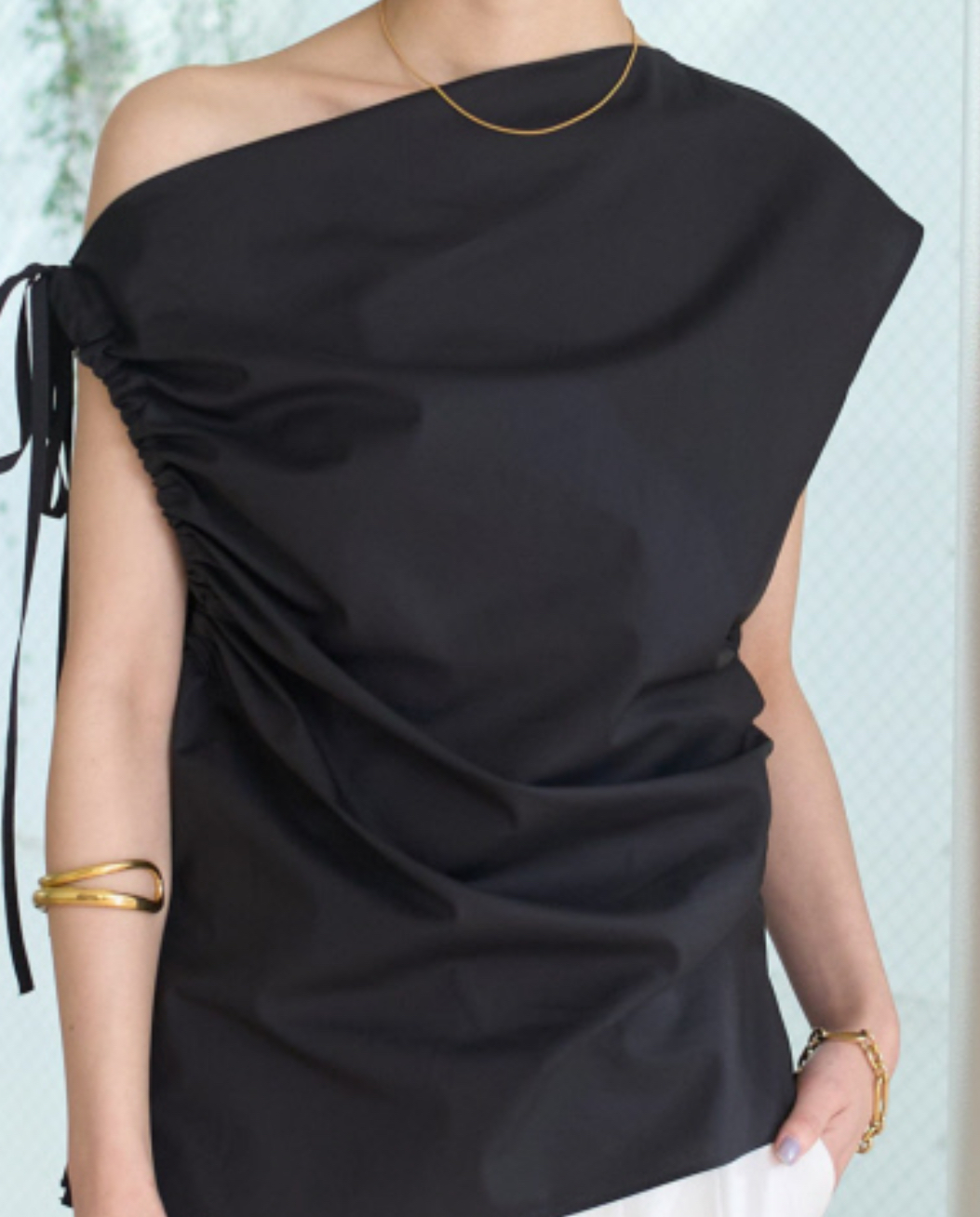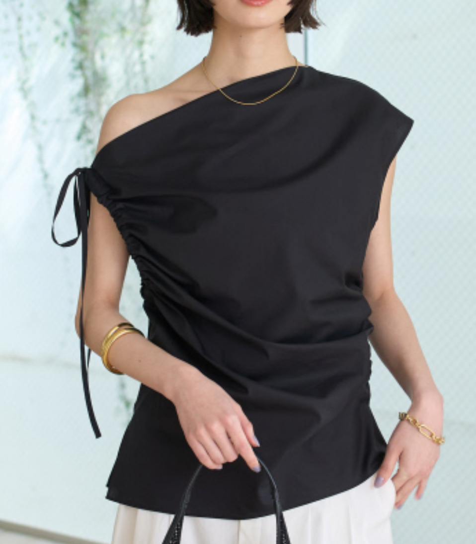 アシンメトリーに施されたギャザードレープが目を引くブラウス。