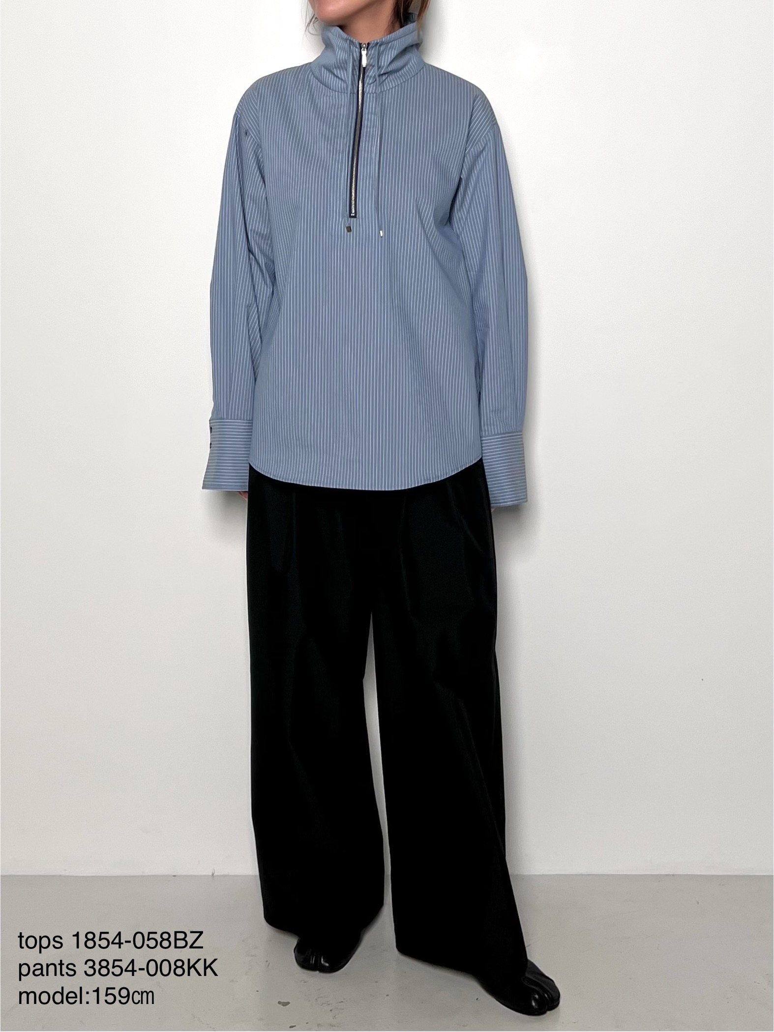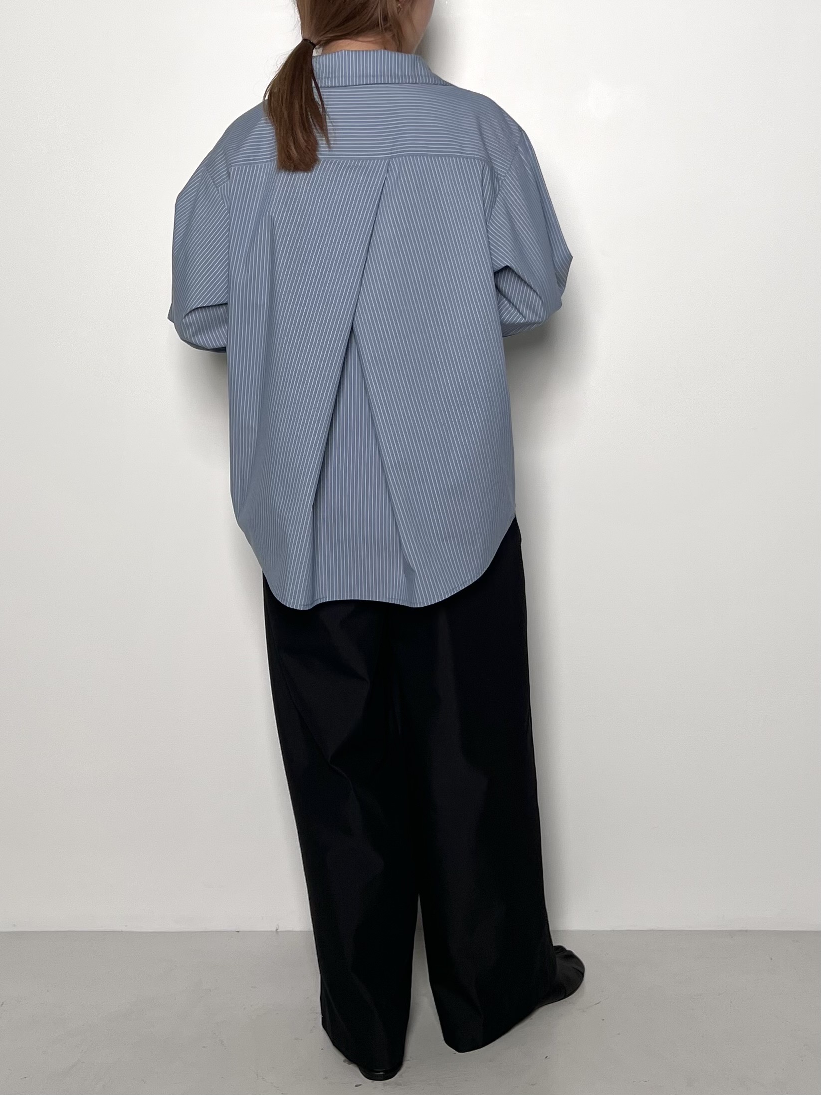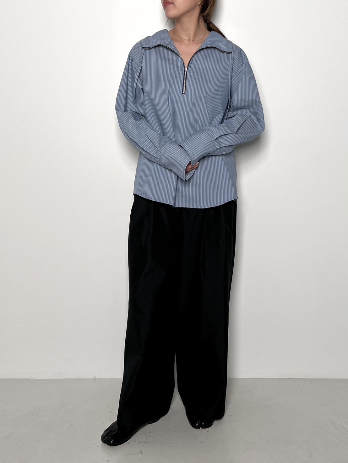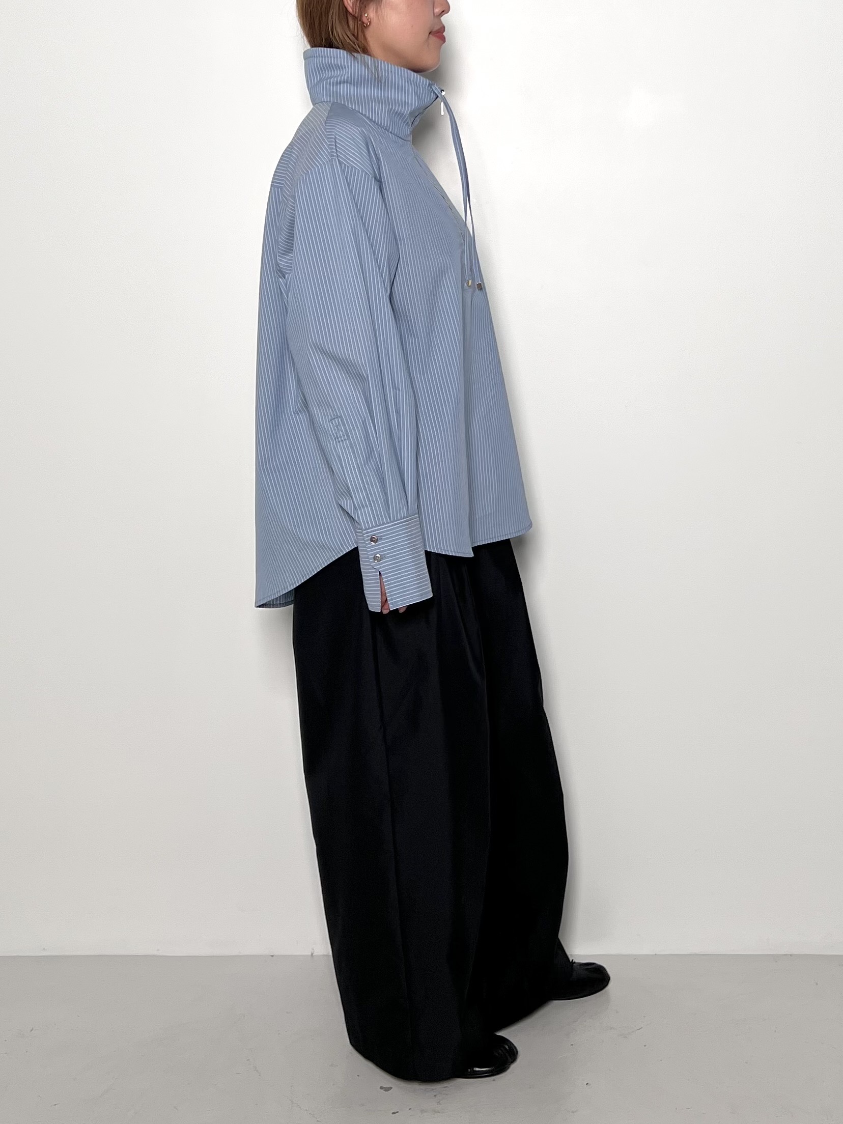 後身頃の斜めのタックや変形カフスなど、さりげないディティールに拘った1枚です。