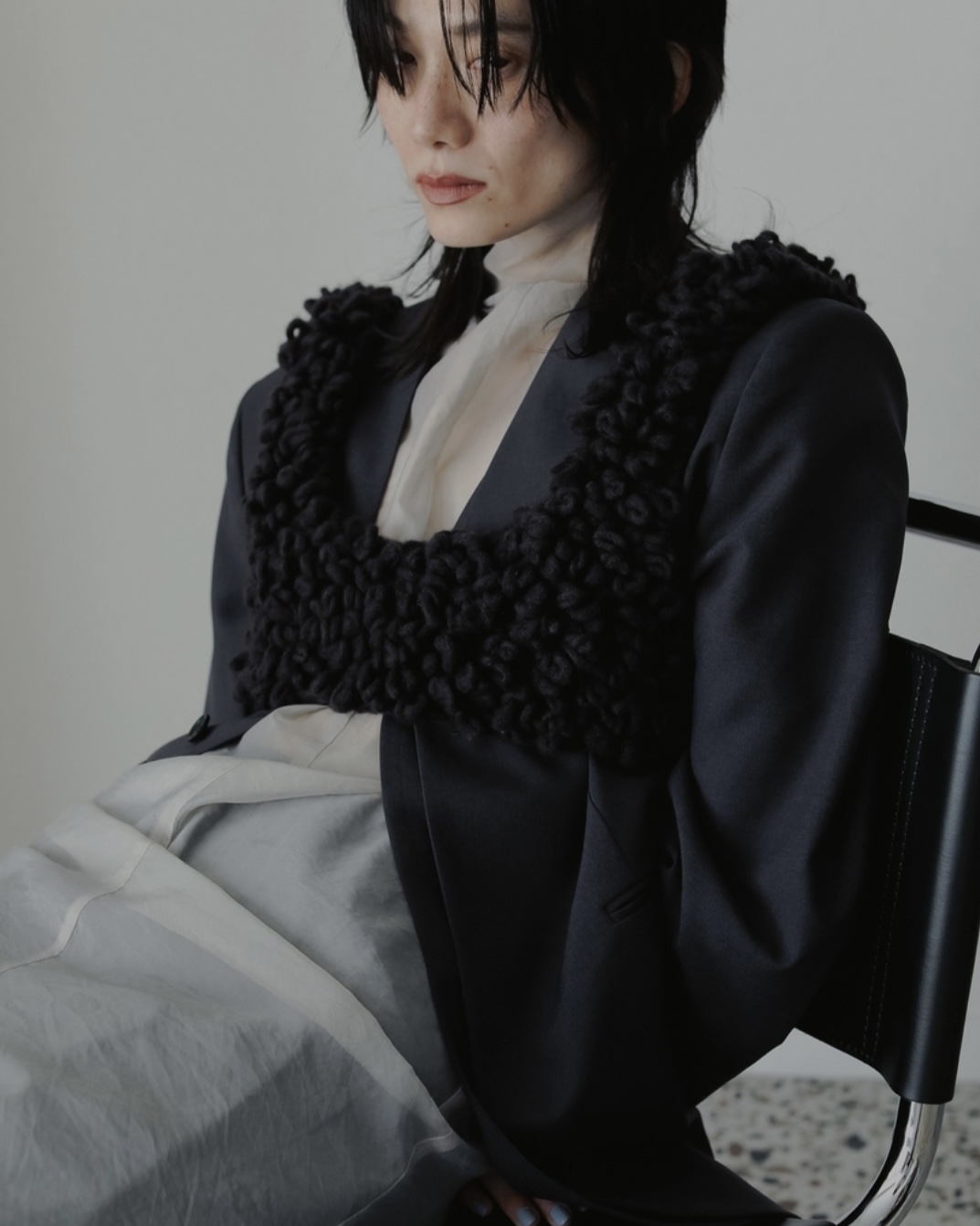 ジャケットのインナーとして合わせたり、ニットと合わせたり、重たくなりがちな秋冬のスタイリングに抜け感をプラスしてくれます。