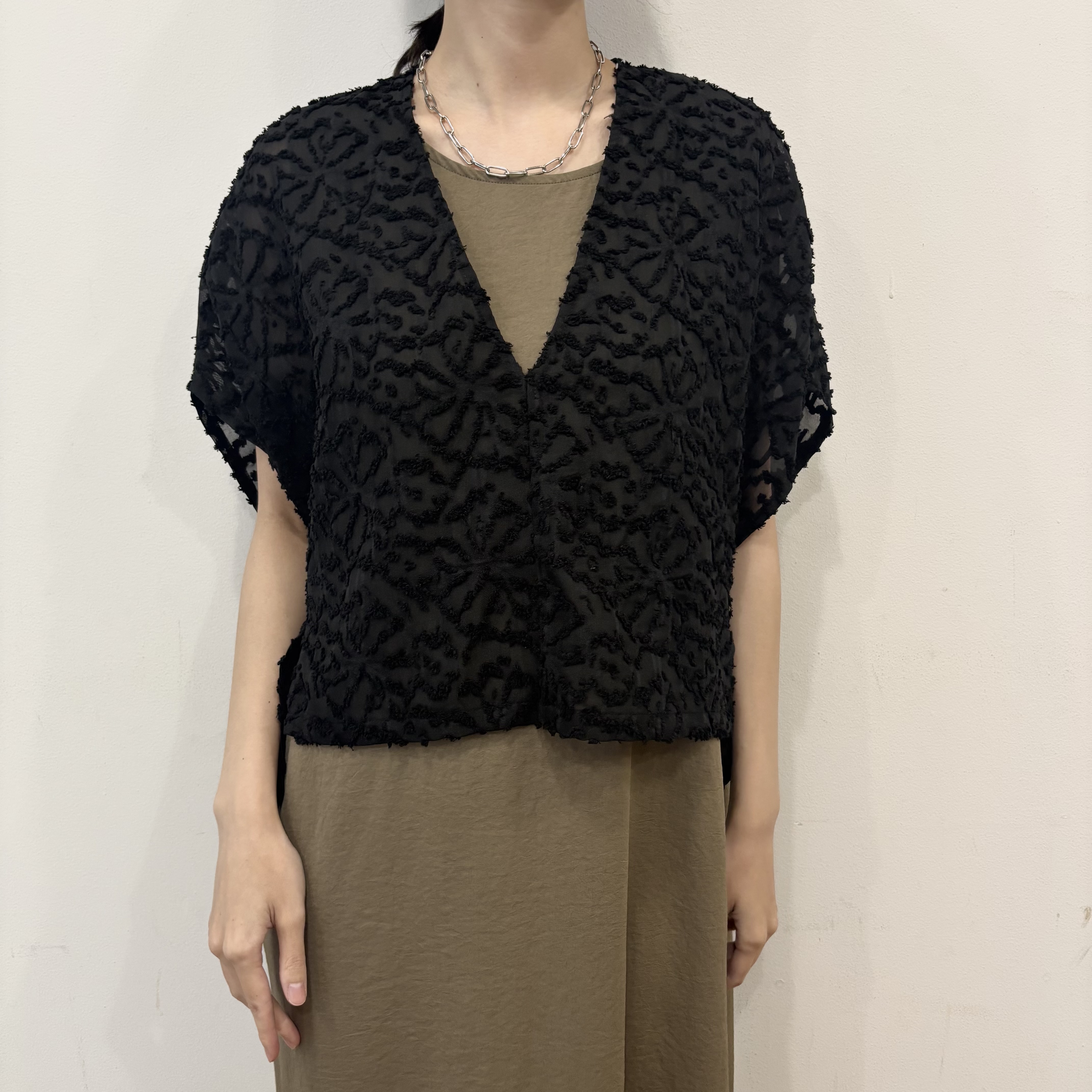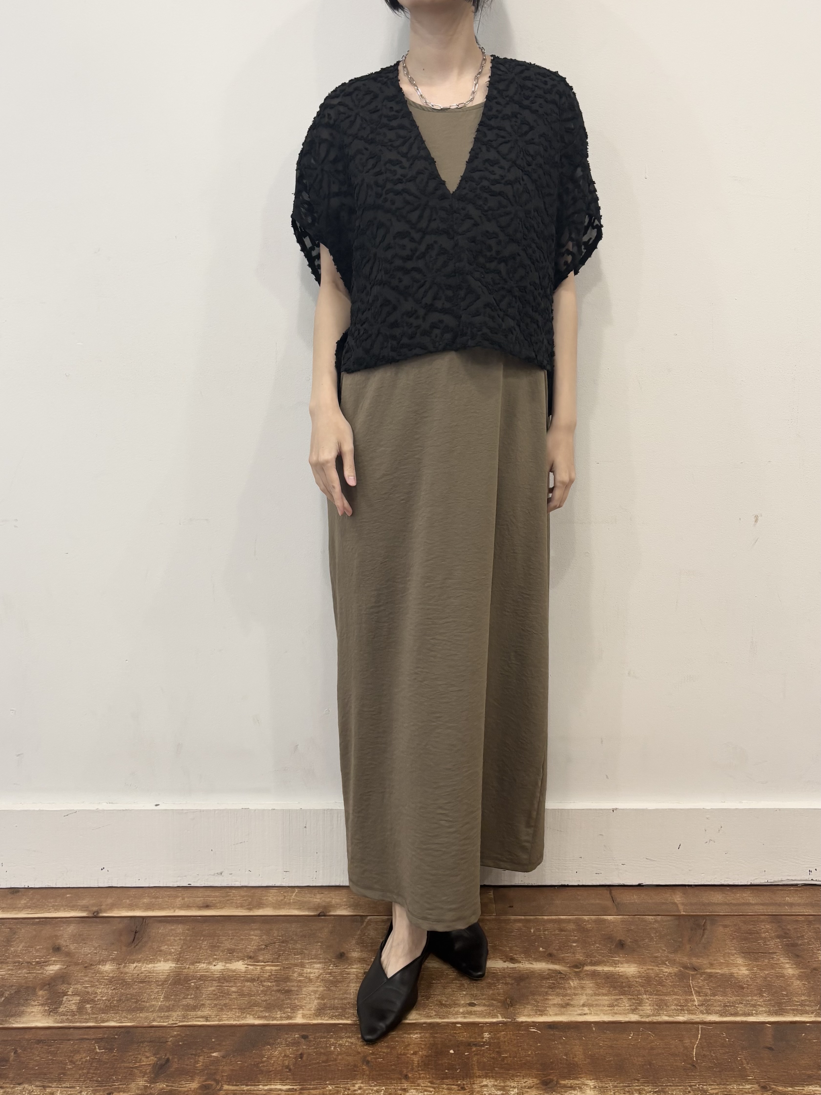 深いVネックがトレンド感があり首まわりをすっきり見せてくれます。