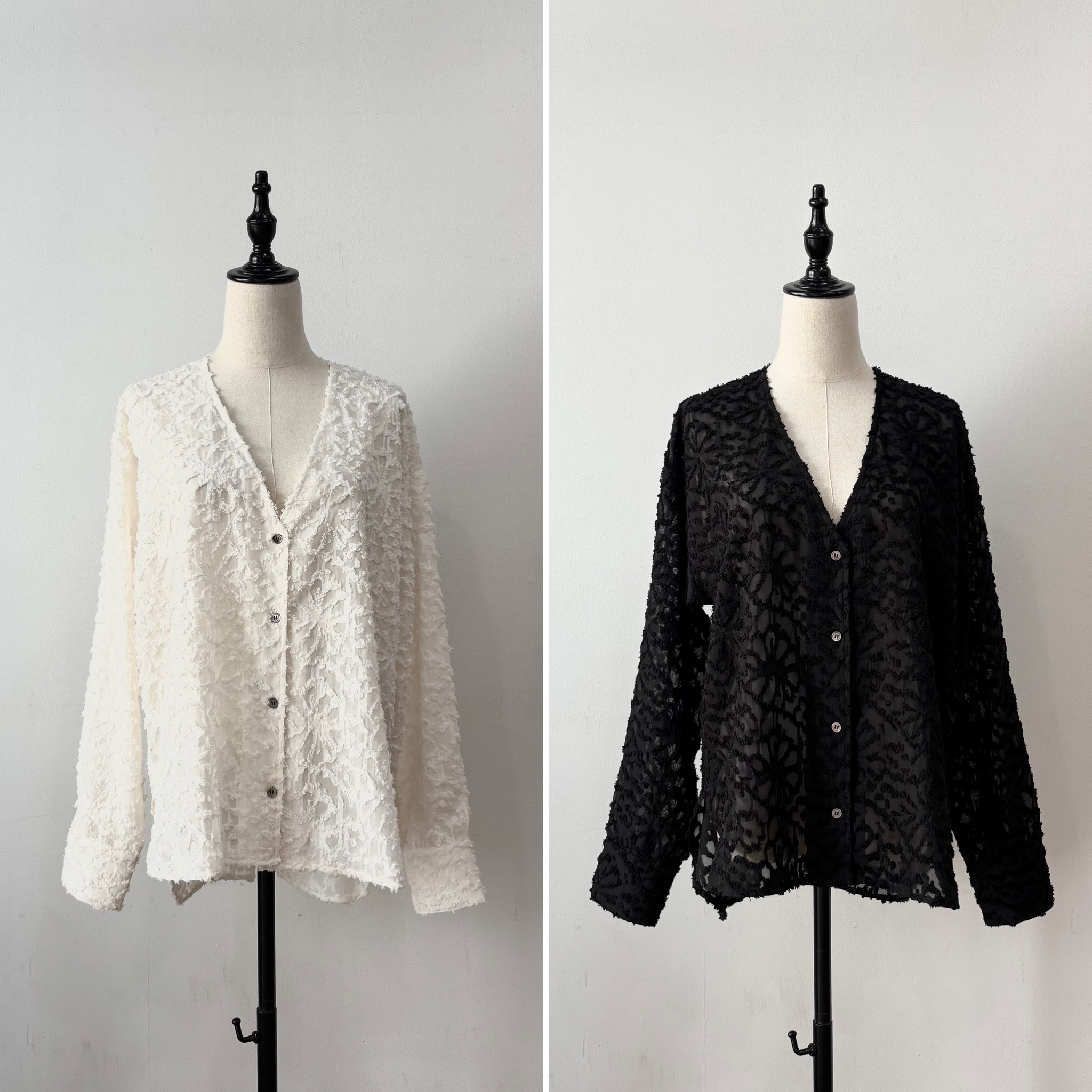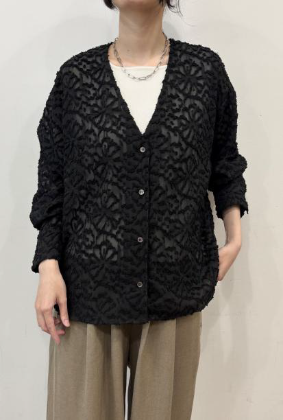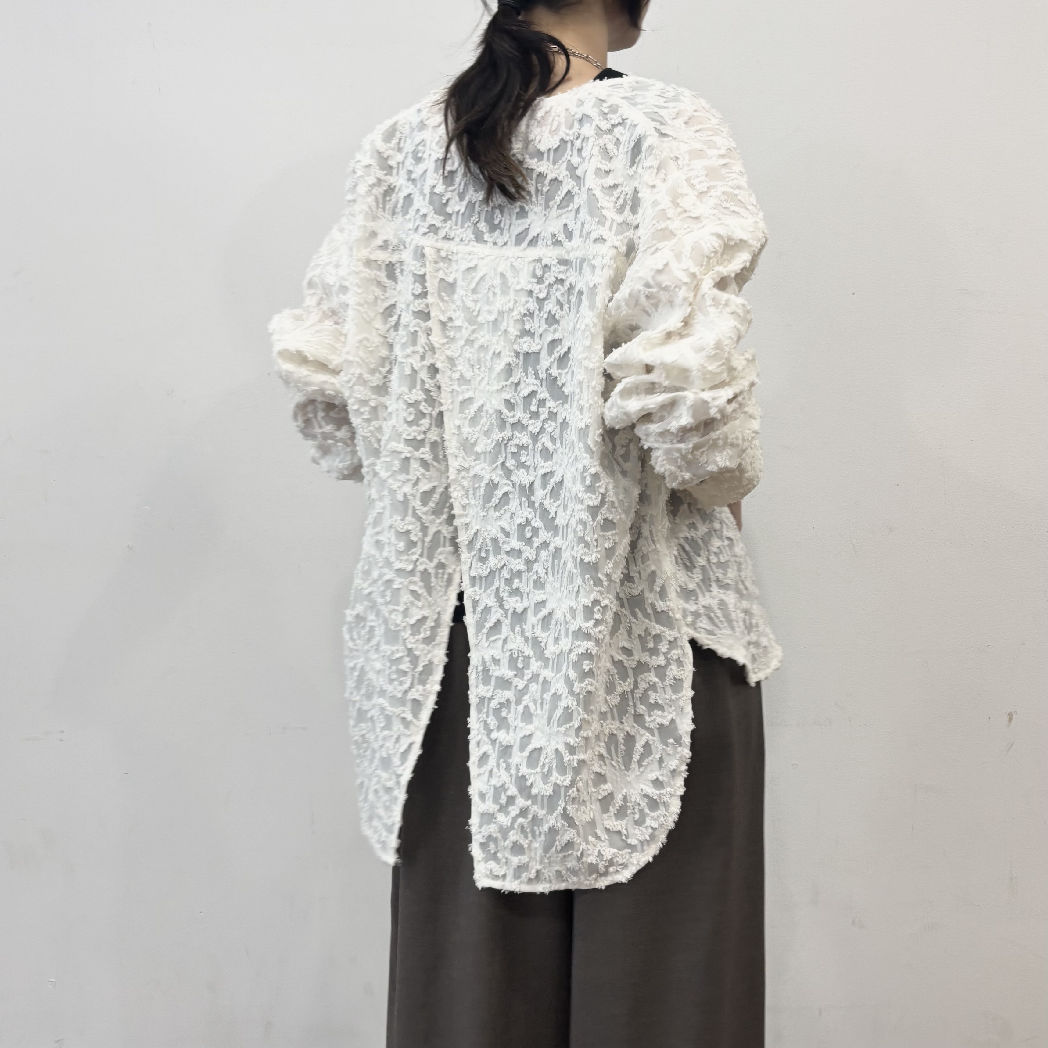 立体感のある表情豊かなカットジャガード素材を使用したノーカラーシャツ。