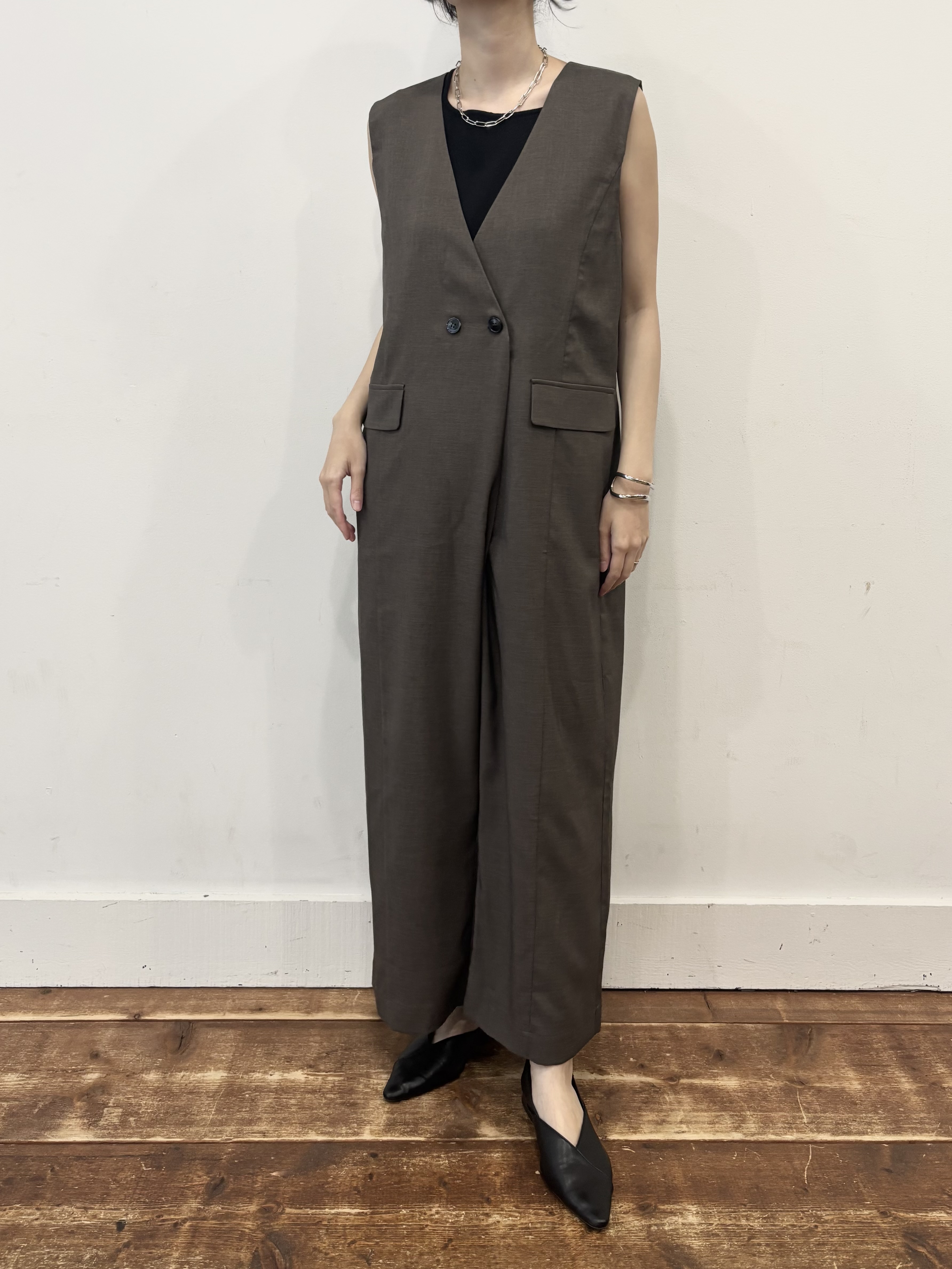 ダブルボタンやフラップポケットなどのジャケットのデザインを取り入れたオールインワン。