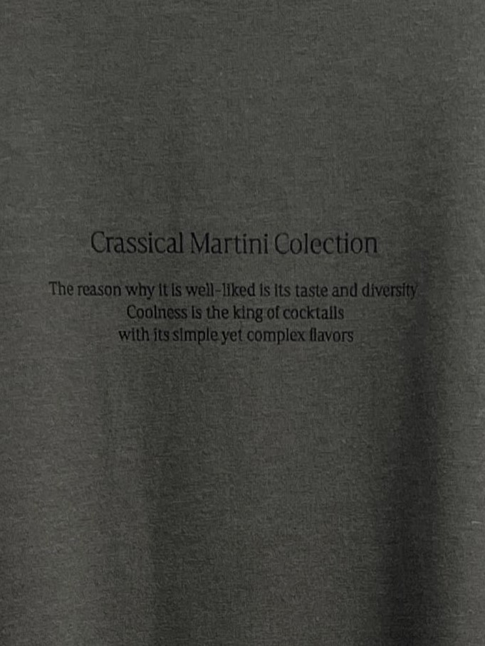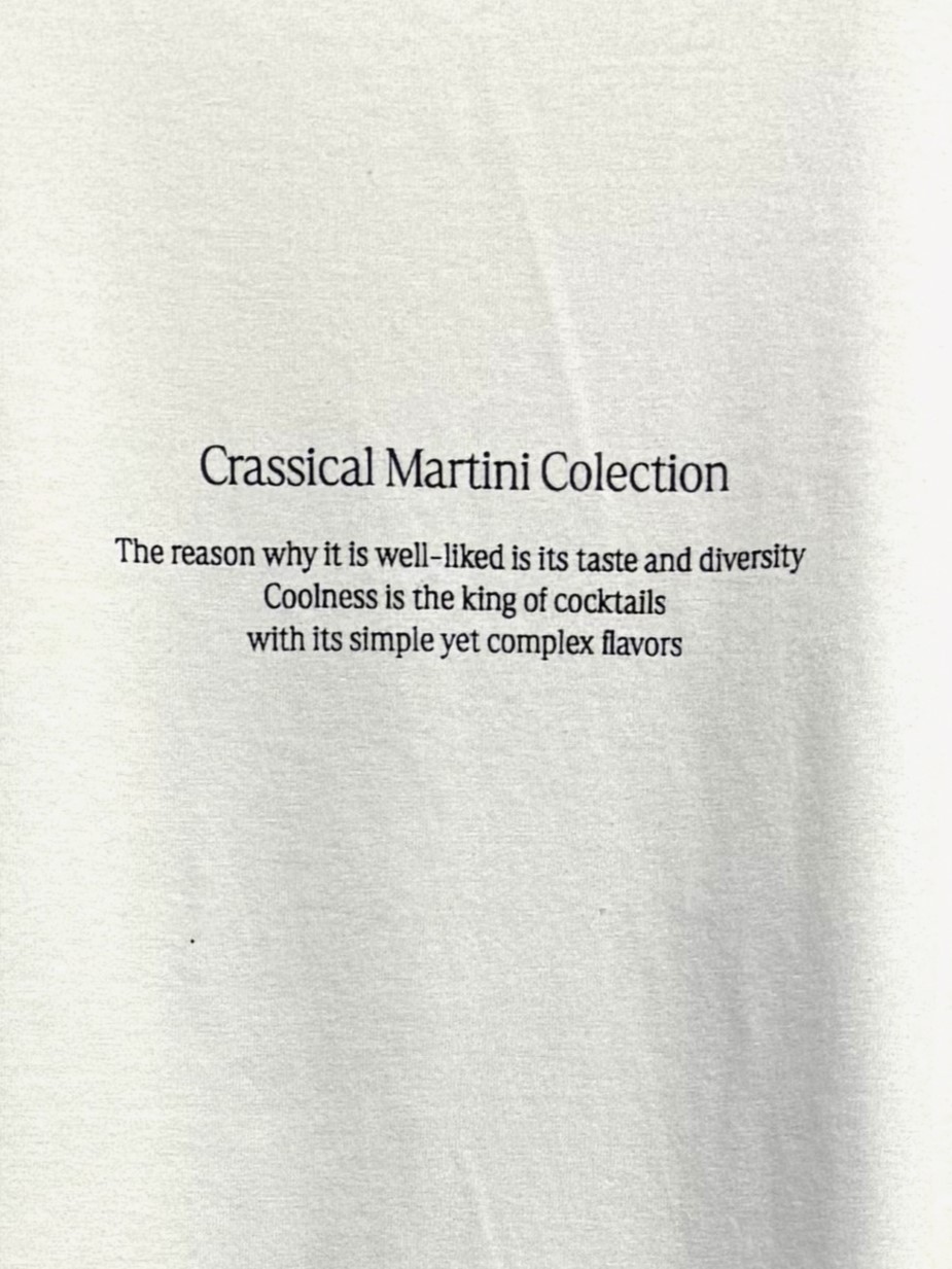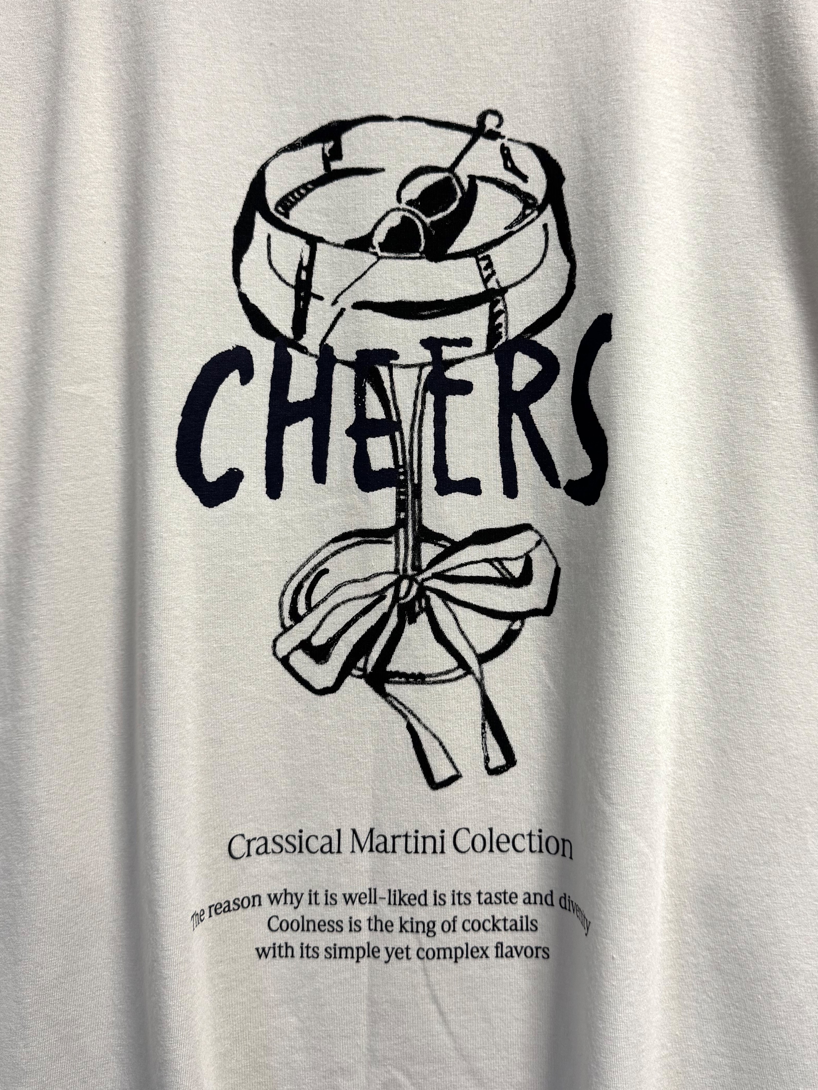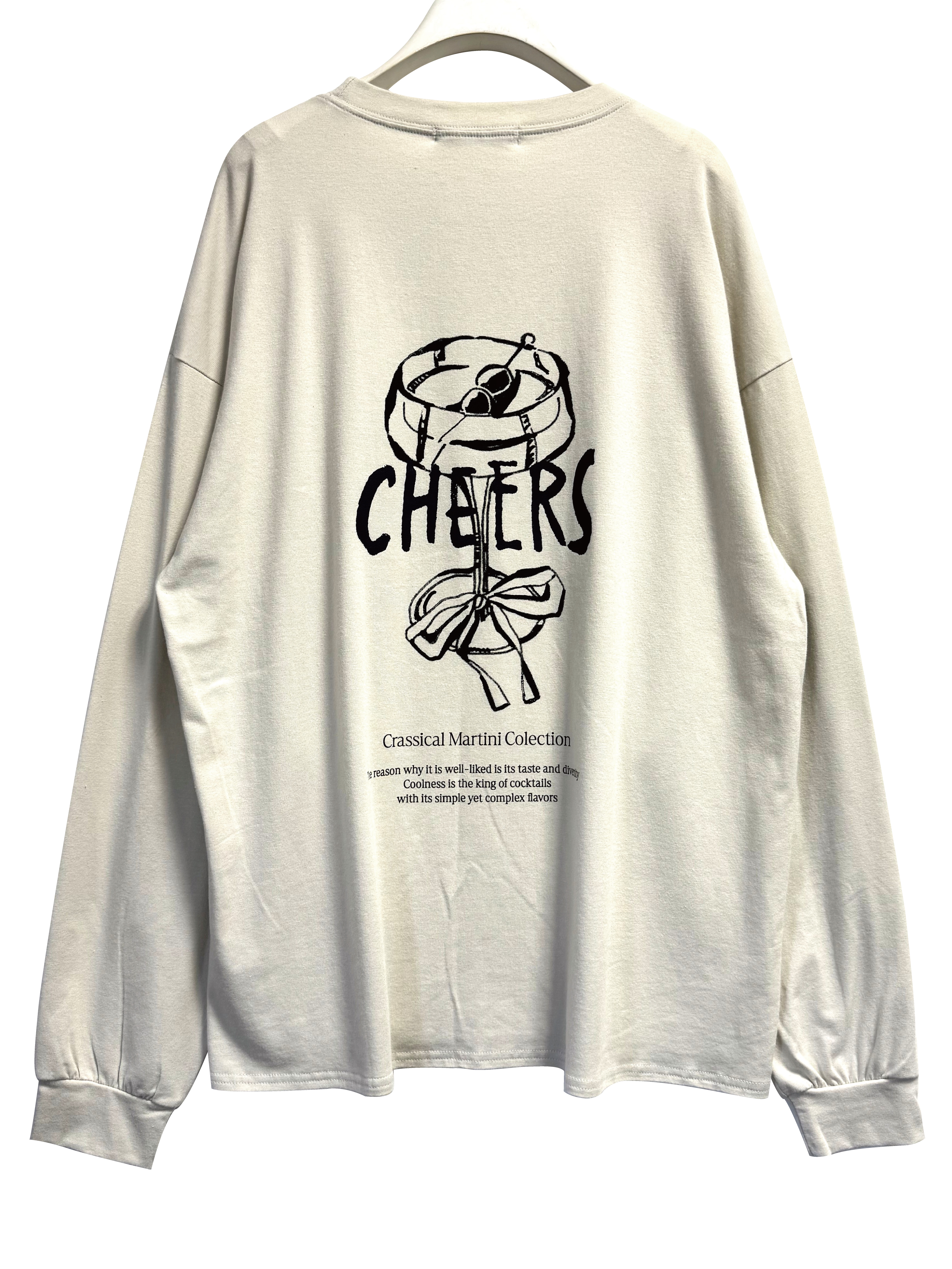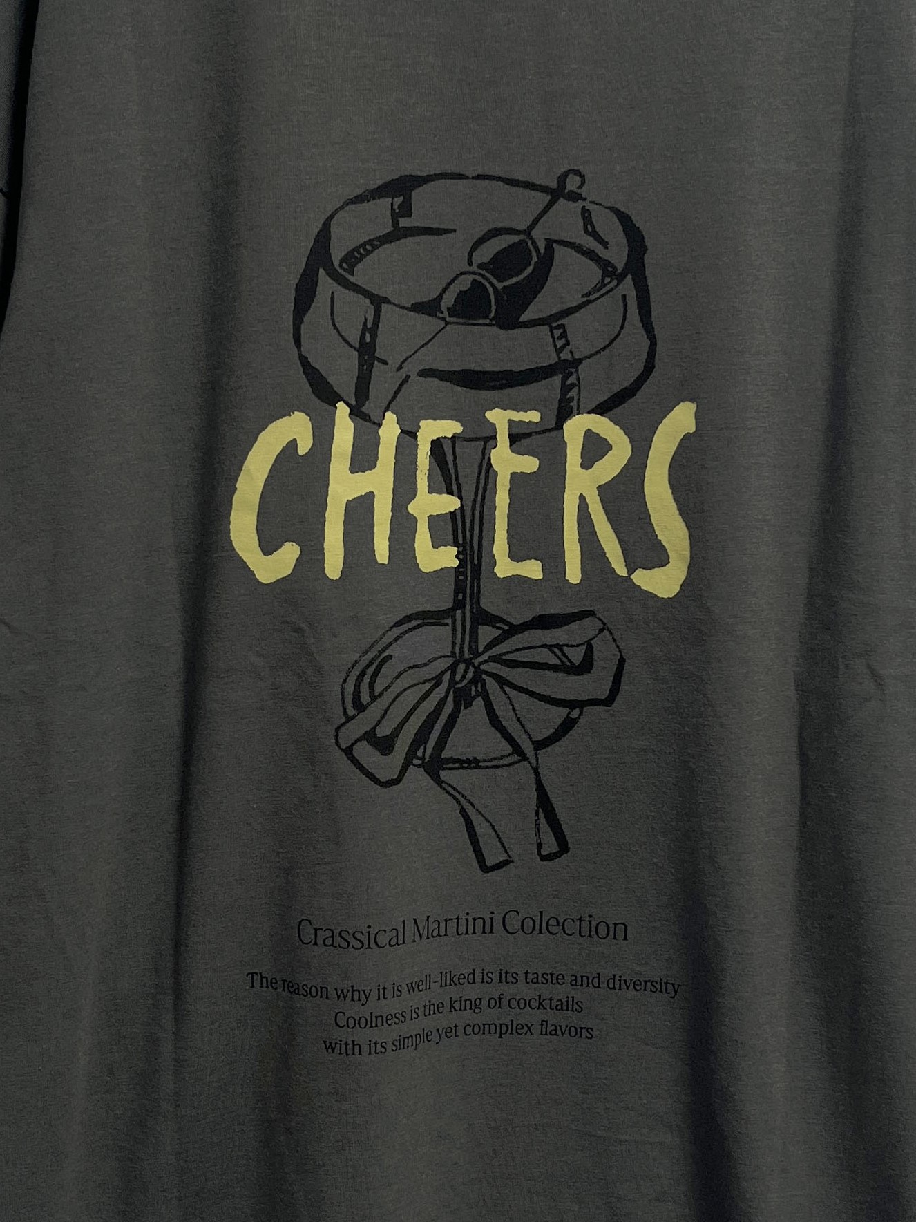 カクテルグラスと“CHEERS”のロゴが印象的な、遊び心のあるバックプリントロンT。