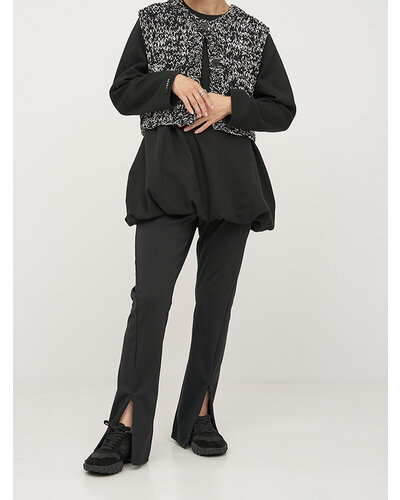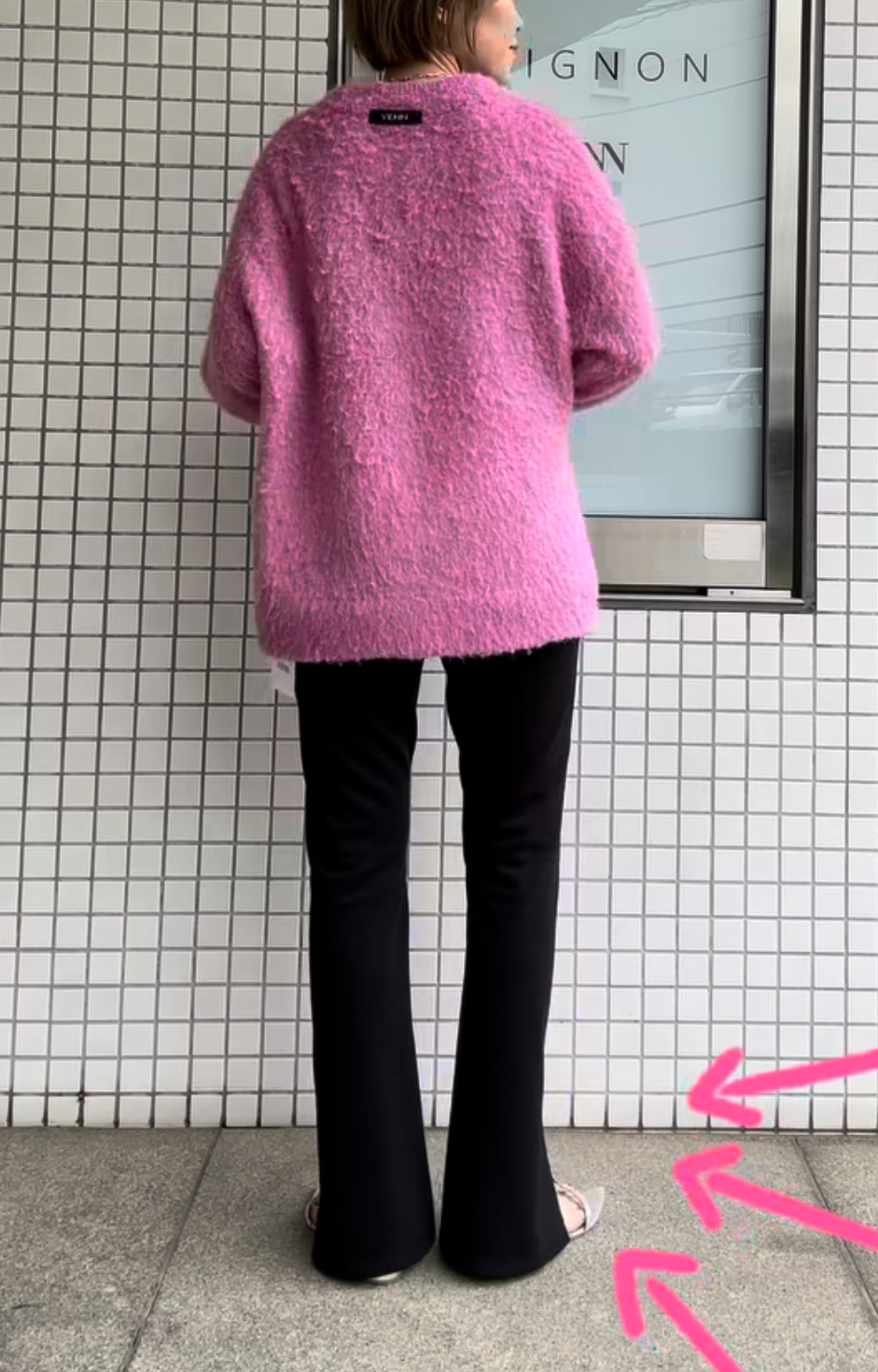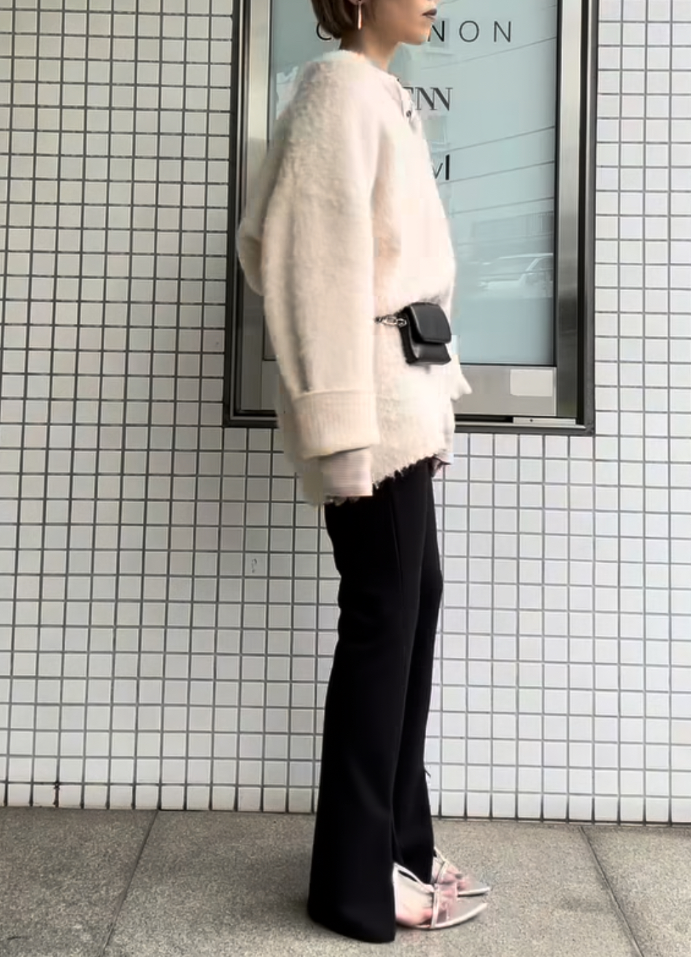 膝から裾にかけてやや広がるフレアラインで、フロントのスリットを開けるとセミフレアシルエットのパンツになります。