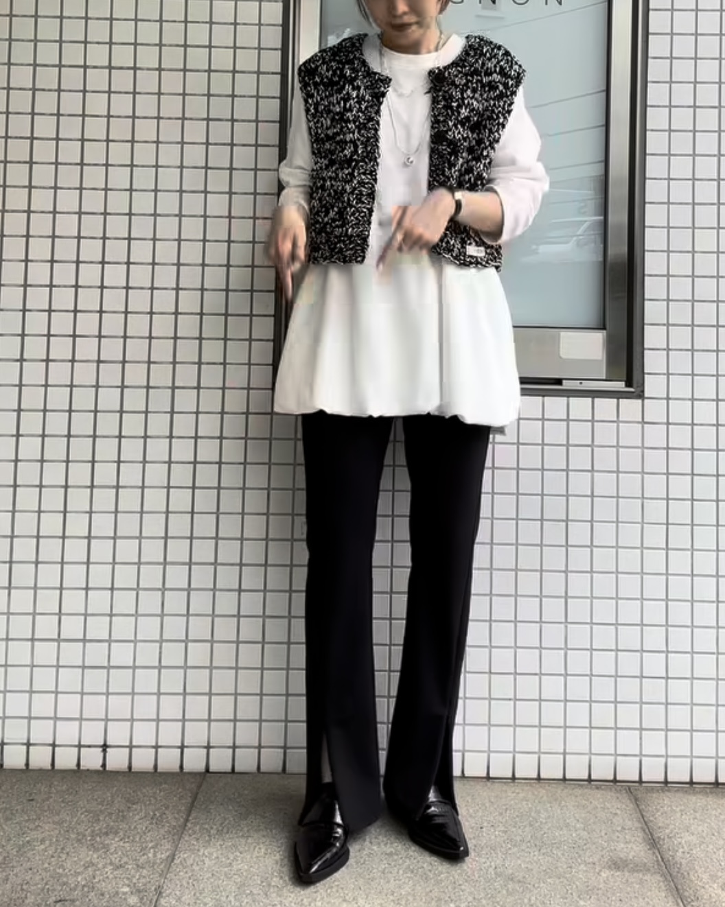 同素材のスカートとのレイヤードスタイルも、より暖かくおしゃれな着こなしとしておすすめです。