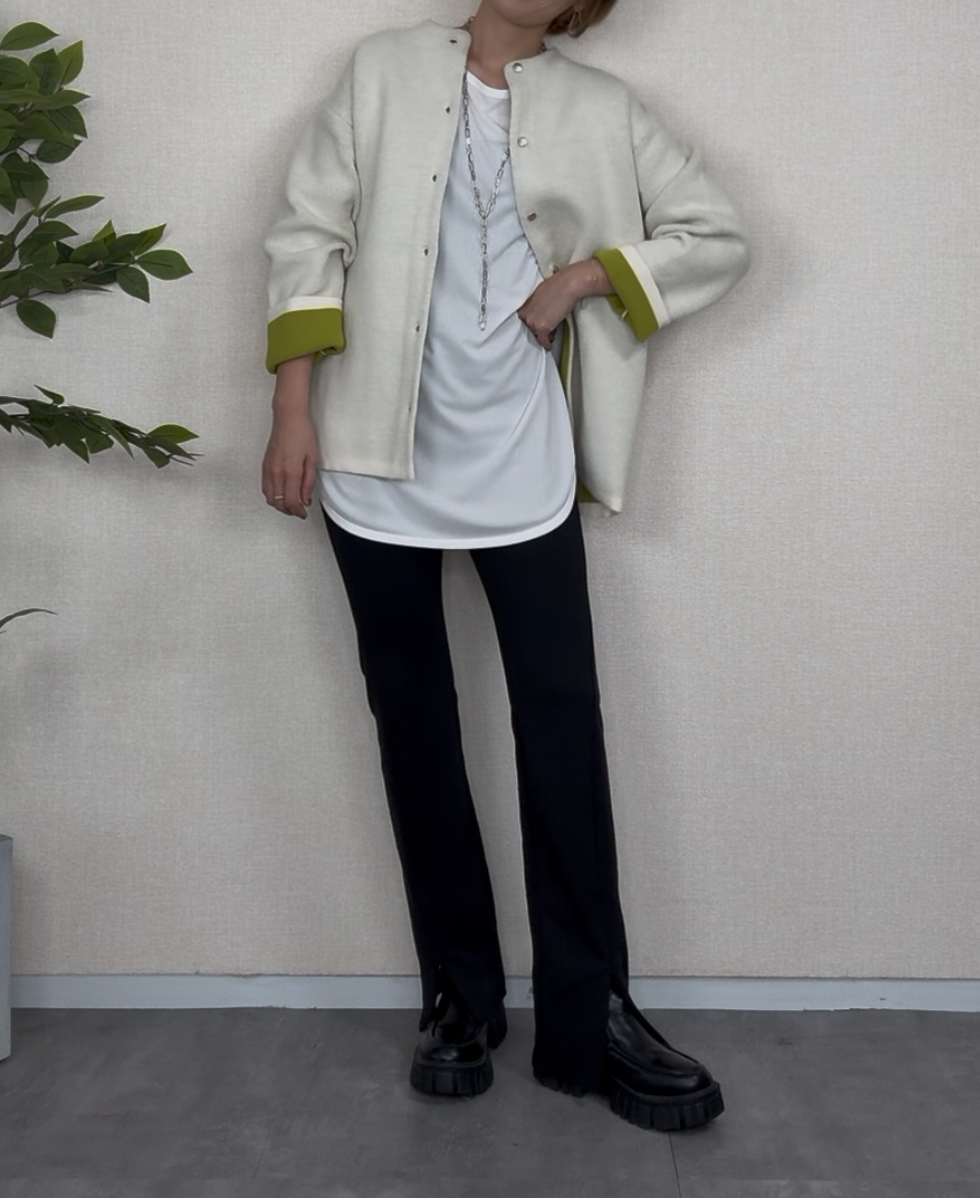 同素材のスカートとのレイヤードスタイルも、より暖かくおしゃれな着こなしとしておすすめです。