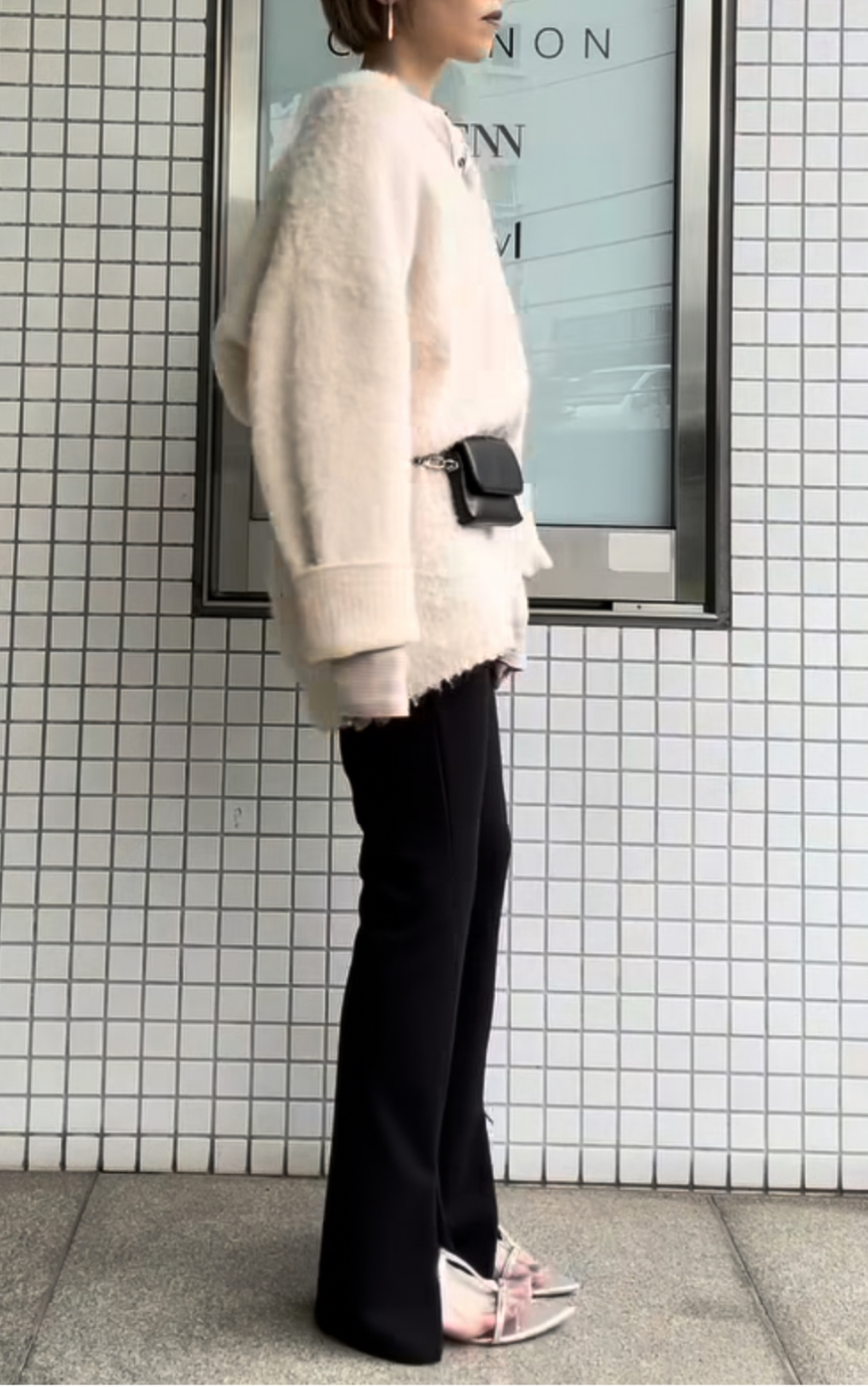 膝から裾にかけてやや広がるフレアラインで、フロントのスリットを開けるとセミフレアシルエットのパンツになります。