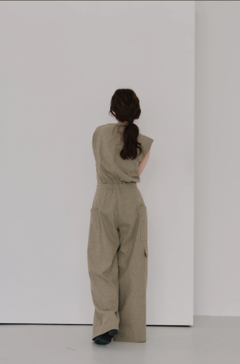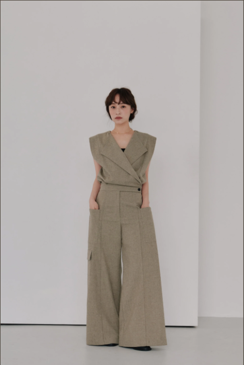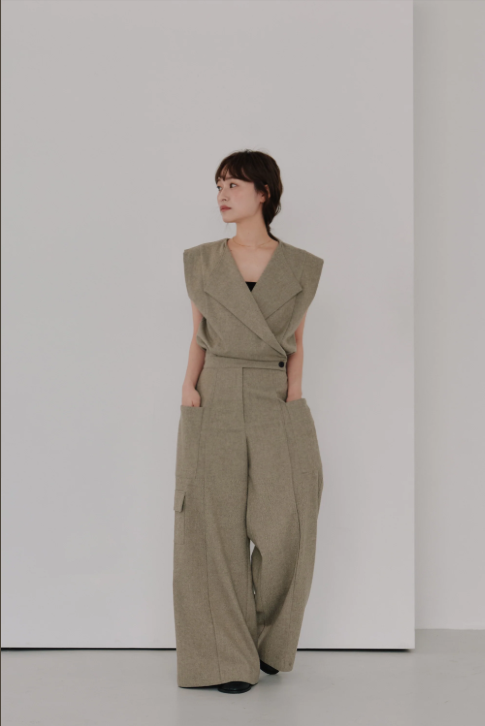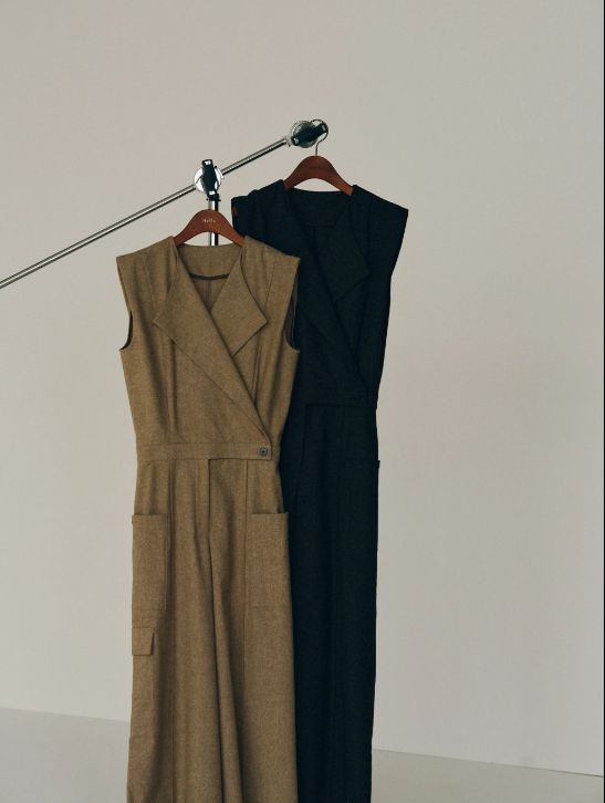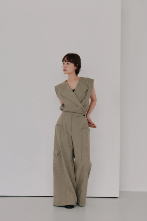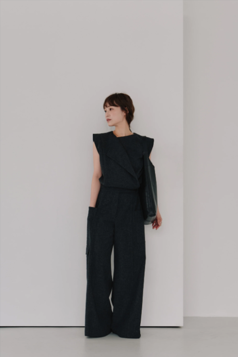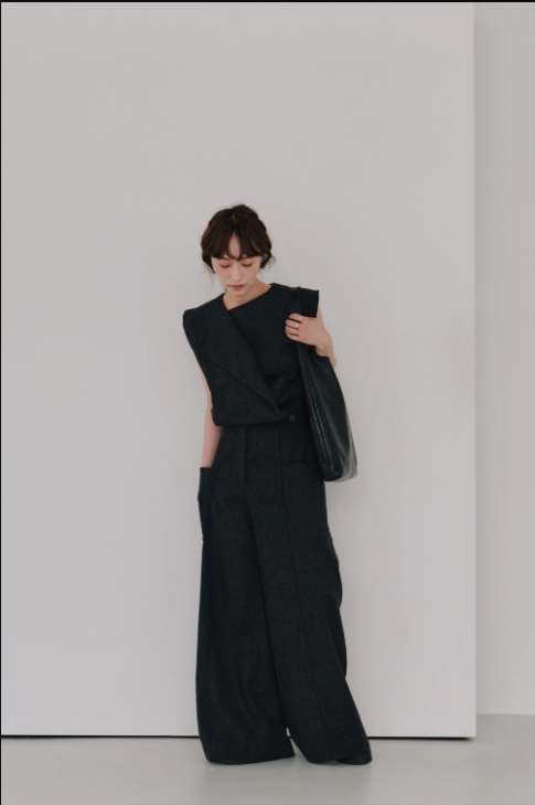 フロントのカシュクールデザインが印象的なウールジャンプスーツ。