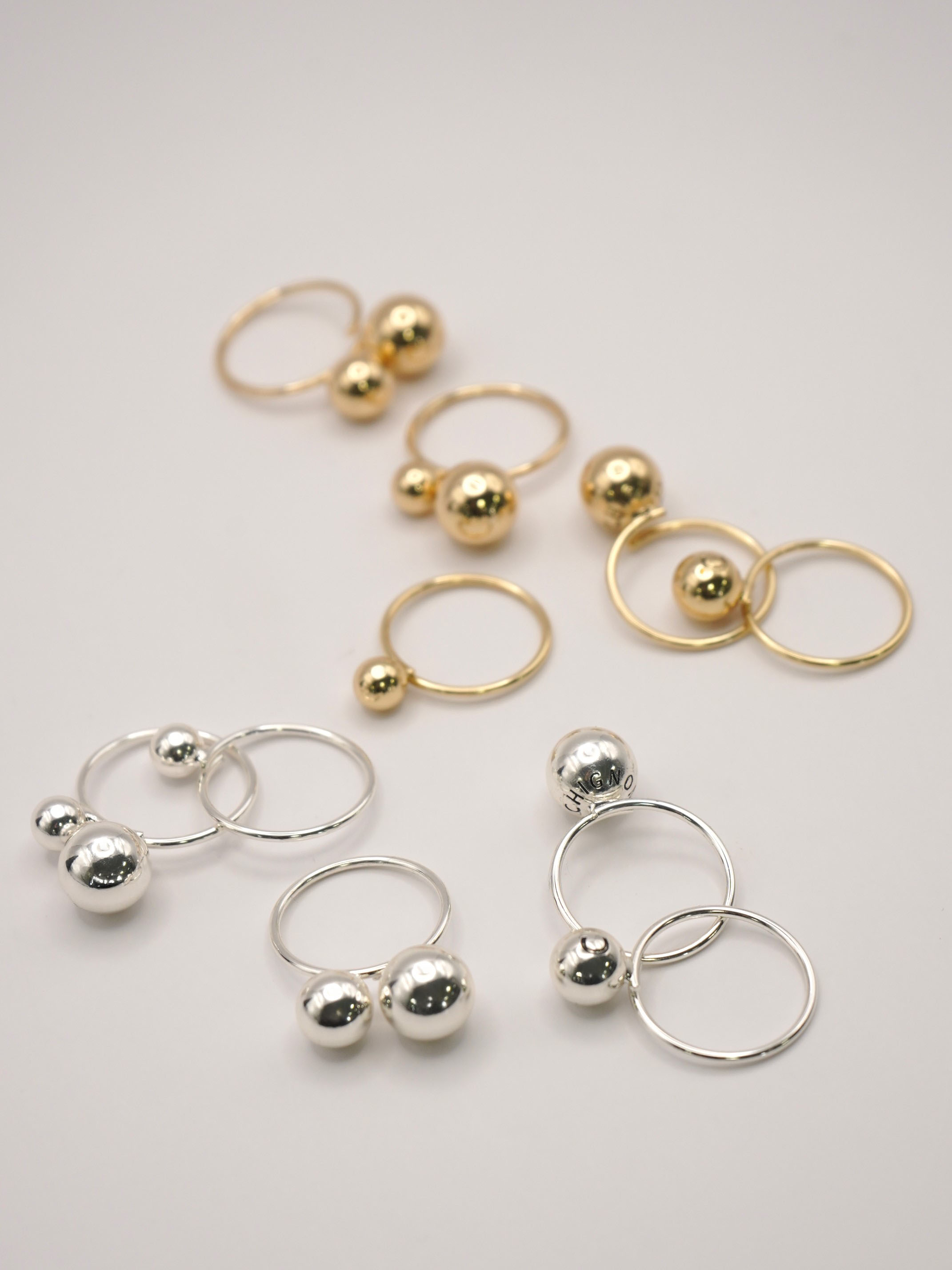 1粒大リングには「CHIGNON」、1粒中リングには「C」の黒文字刻印を入れているので、ちらっと見えるロゴが遊び心をくすぐるオリジナルアイテムとなっております。