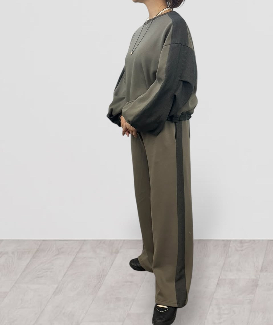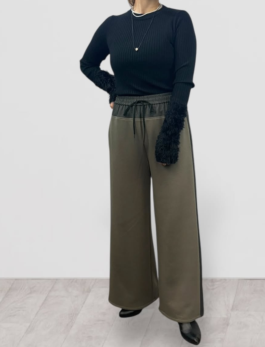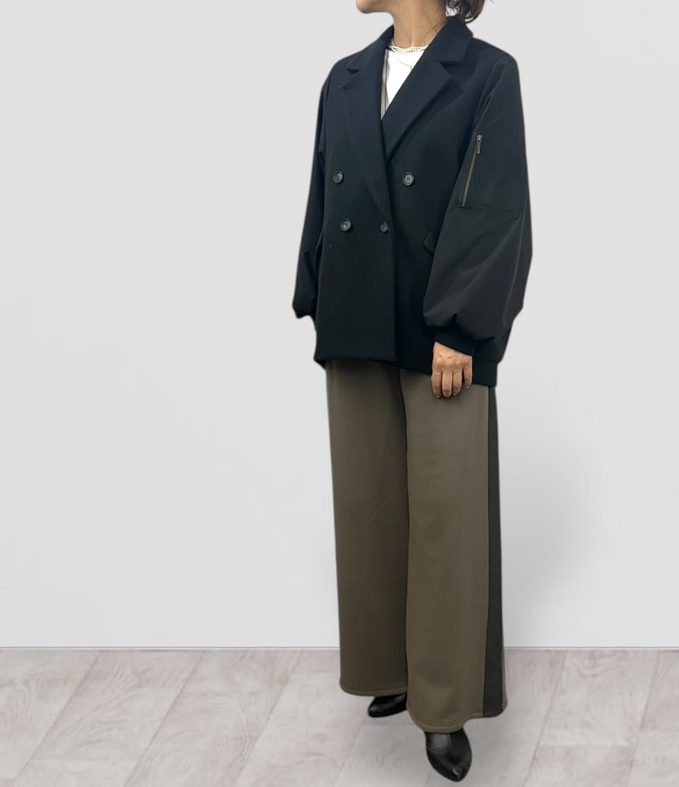 ・ウール湖サージの上に裏起毛ジャージを重ね着したようなウエストとサイドラインがポイント