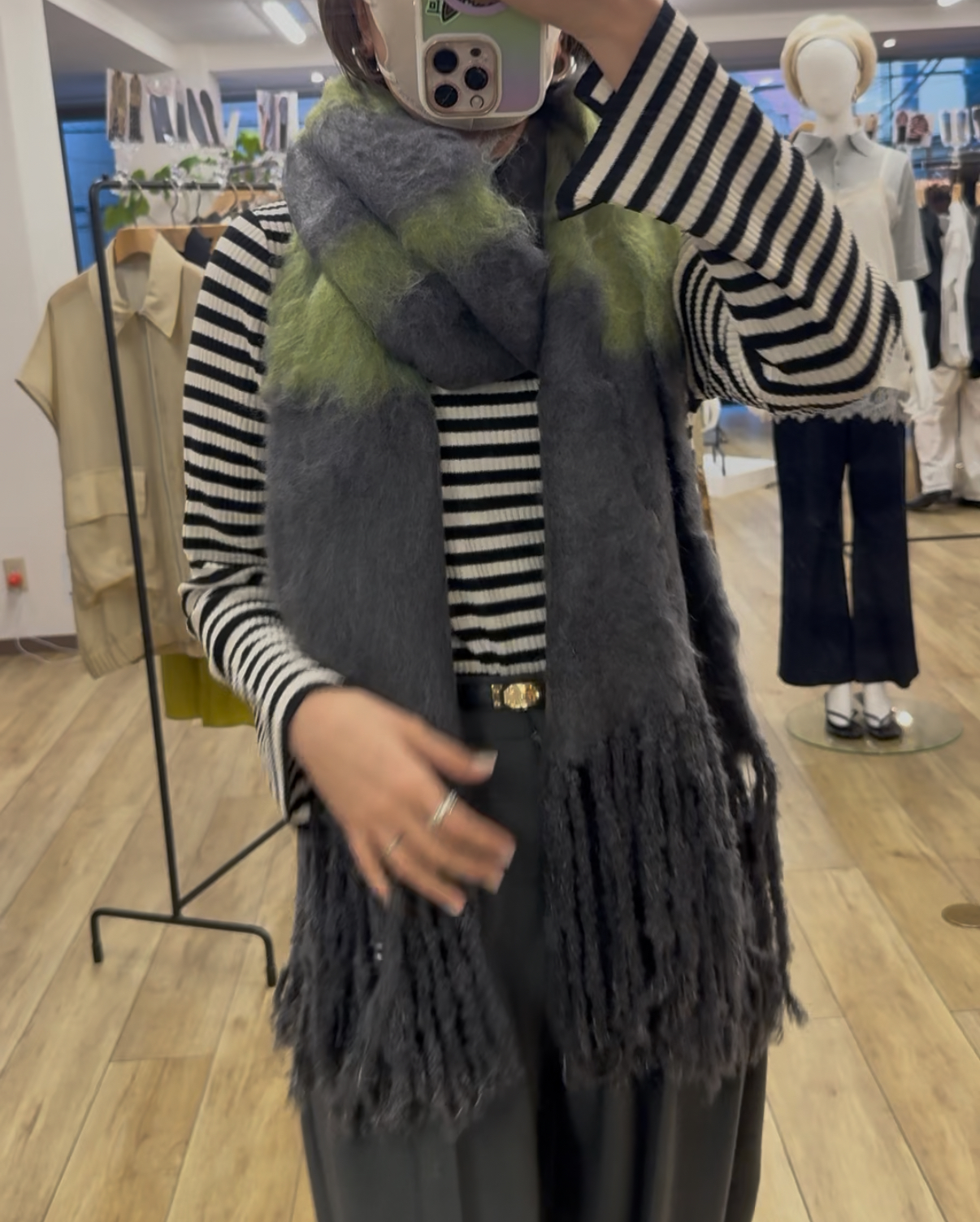 大判ですが厚すぎず軽い為、スタイリングに取り入れやすい1枚です。