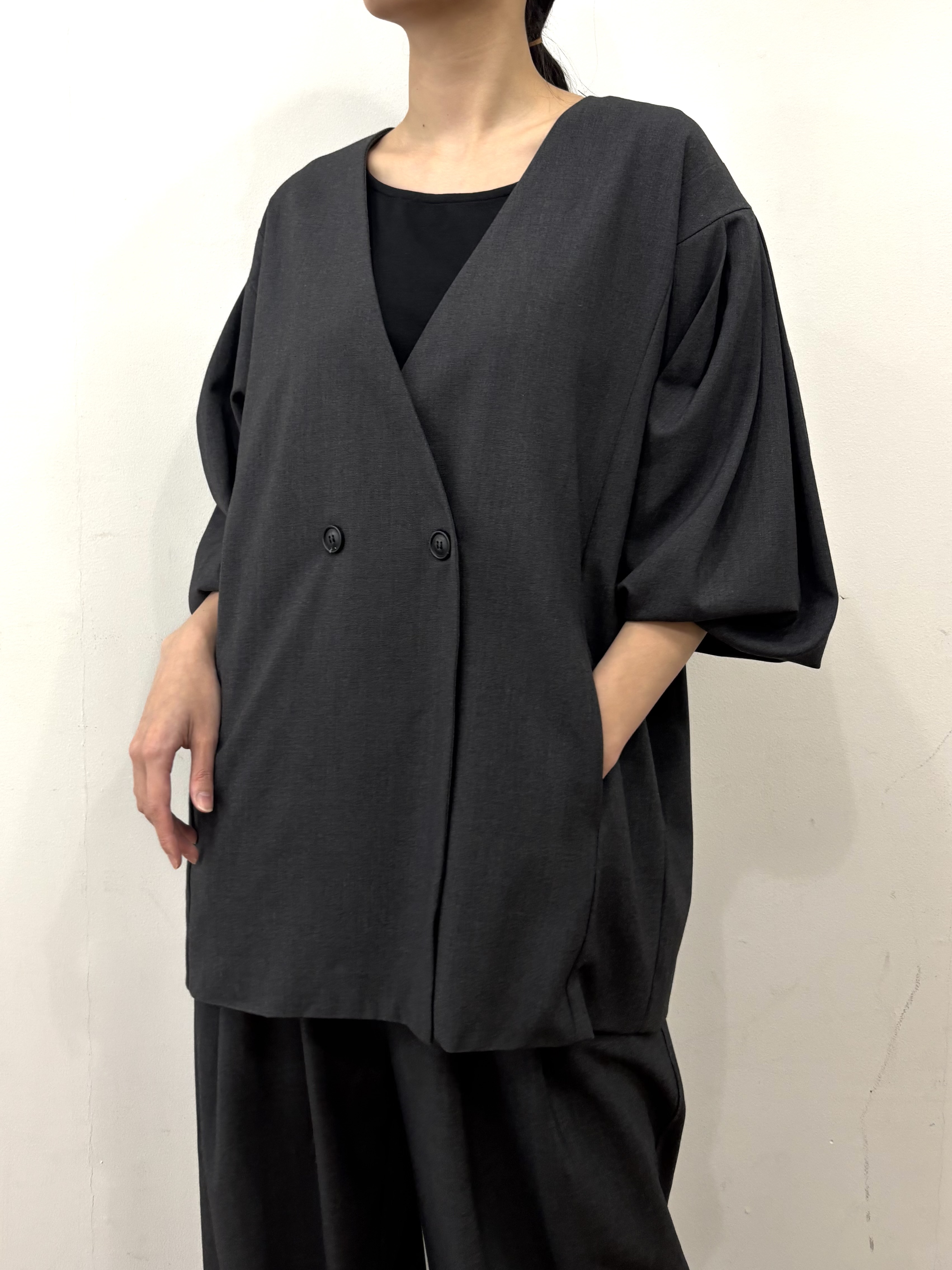 袖部分にタックをとってあり、たっぷりボリューム感のあるお袖が特徴のジャケット。