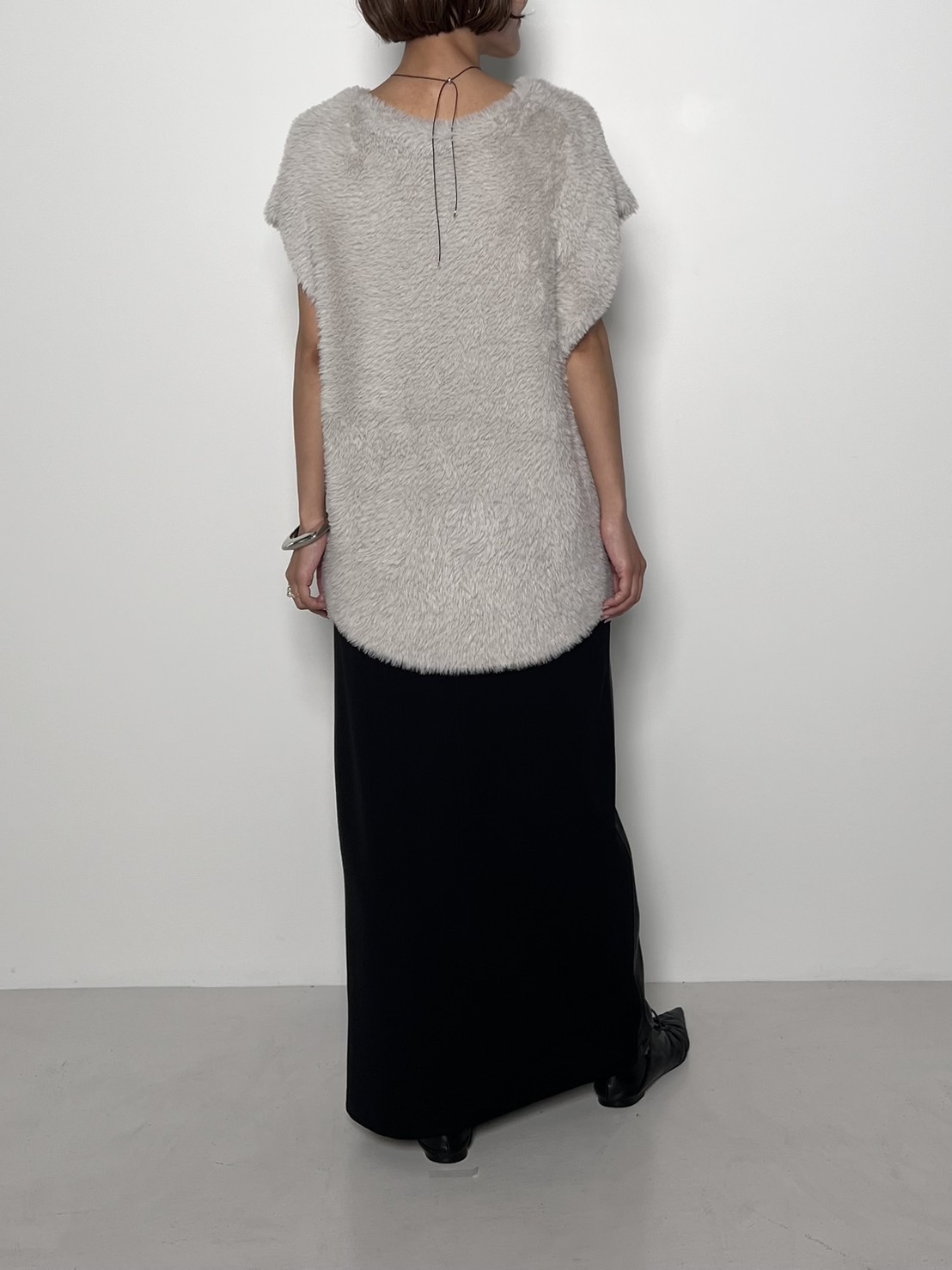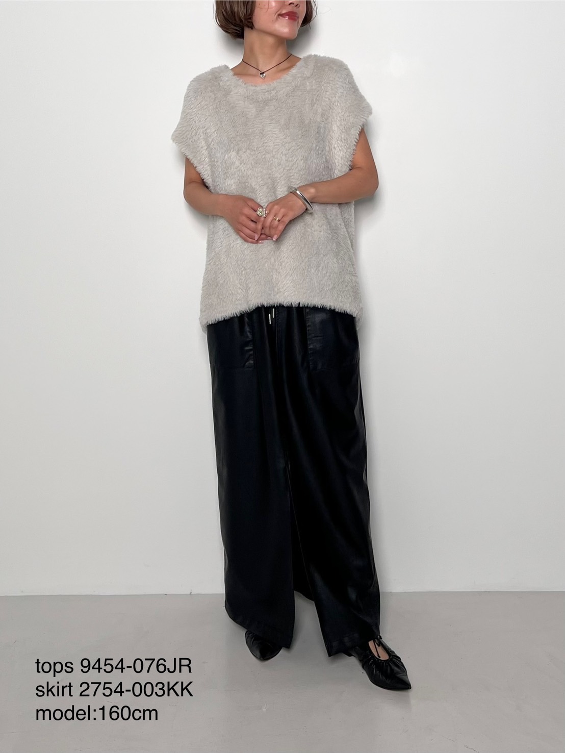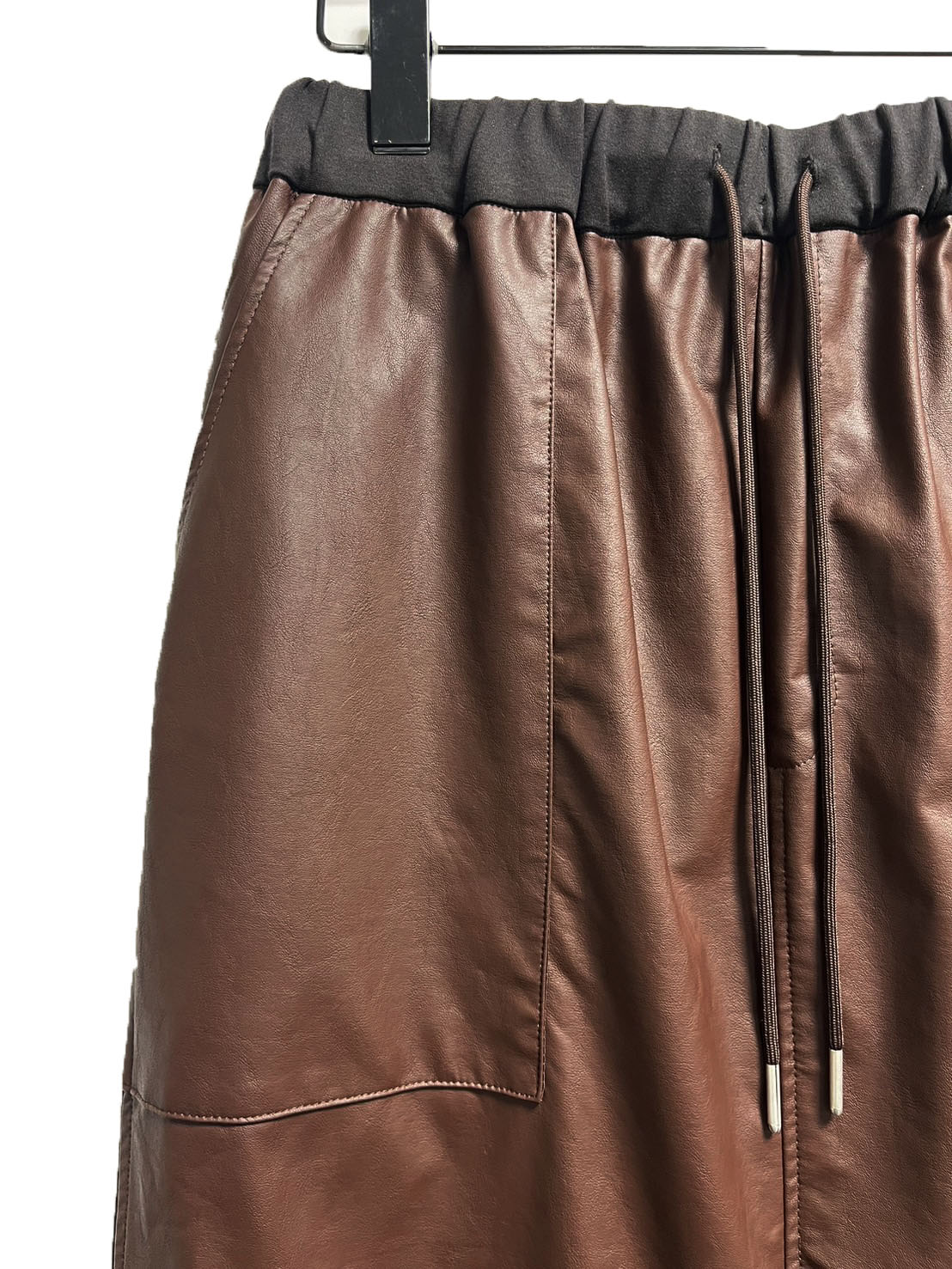 異素材使いのナロースカートです。シンプルなベイカースカートのデザインですが、フロントはフェイクレザー、後ろはカットソー素材の、大胆な異素材使いになっております。後ろがカットソーのため、フェイクレザーのボトム特有の座りにくさがありません。まっすぐなラインのすっきりしたシルエットですが、タイトになりすぎないサイズ感に拘りました。フェイクレザー素材は、リアルレザーのようなシボ感のある風合いになっております。