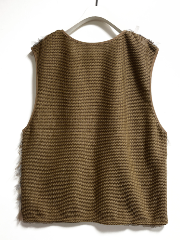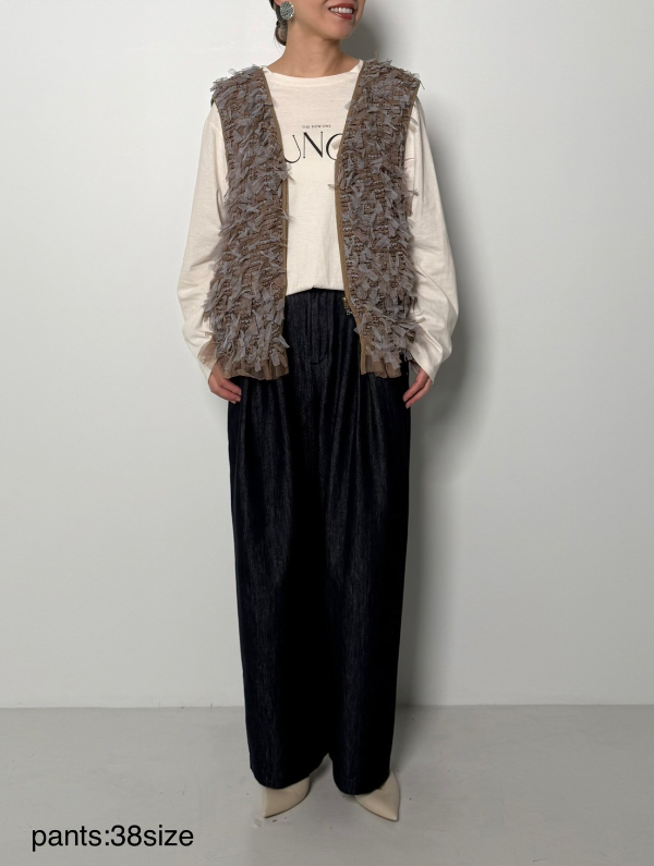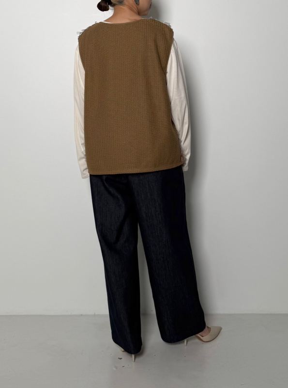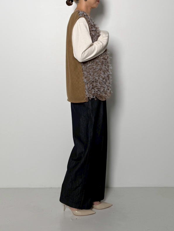 チュールレースとニット風カットソーをドッキングさせたベストです。