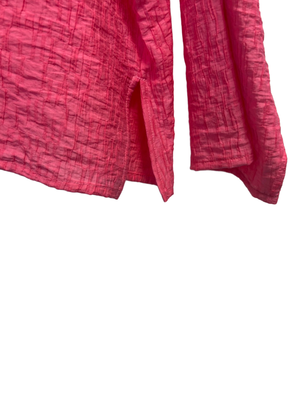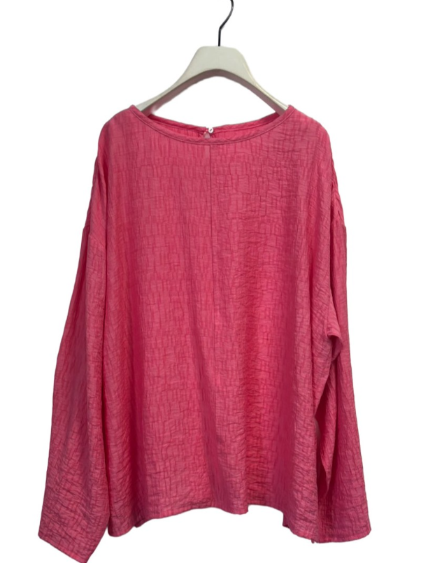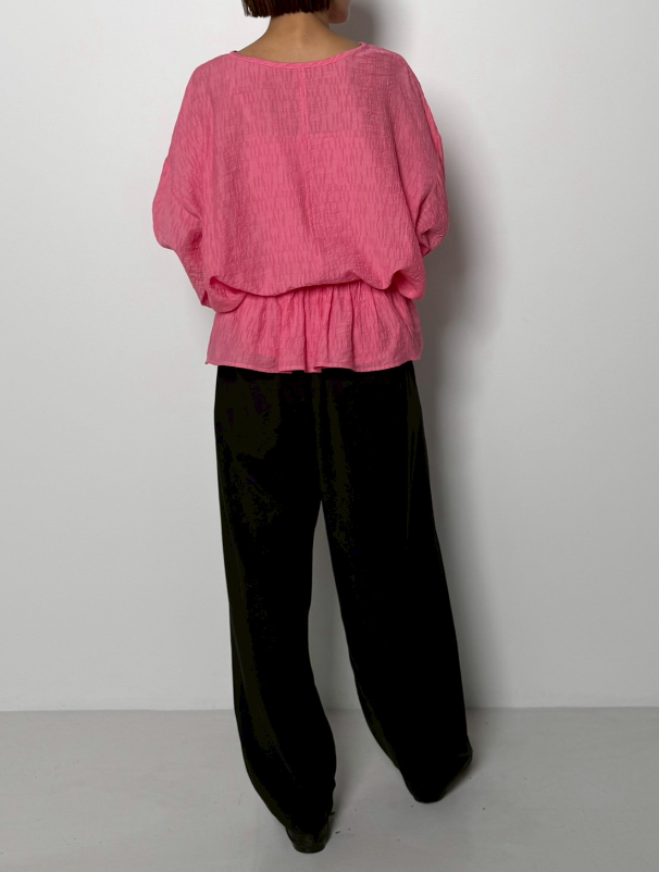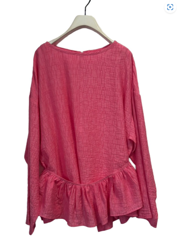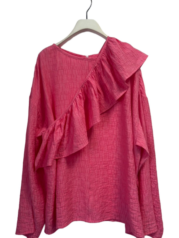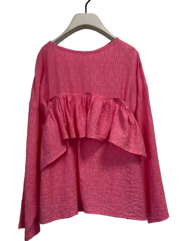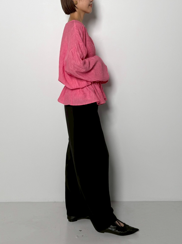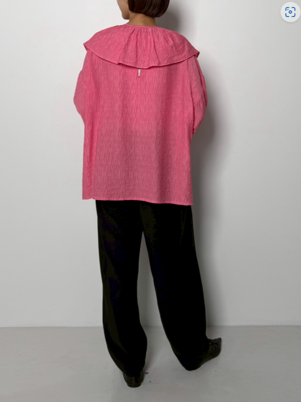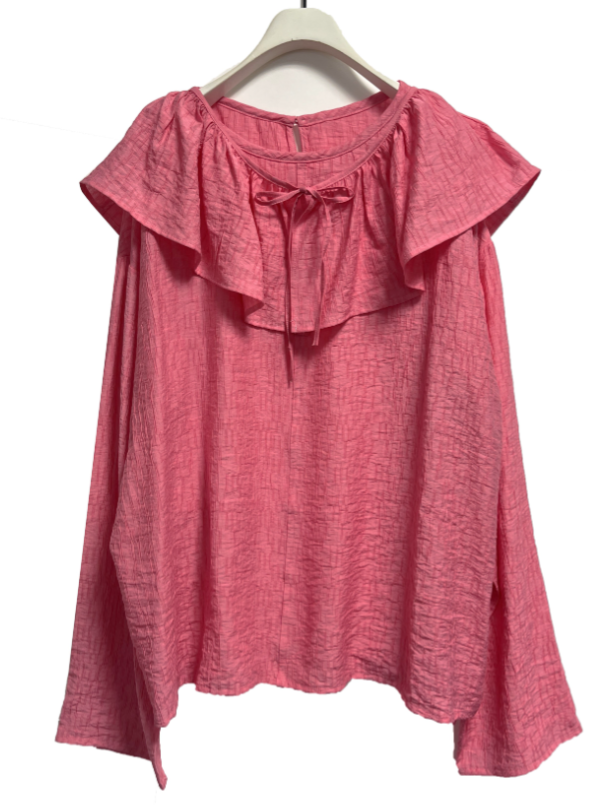 凹凸感のある楊柳 をしようした、フリルの衿付のTブラウス。