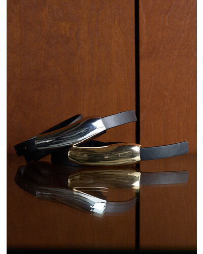 ニュアンスのある丸みを帯びたバー状のメタルプレートをフロントに配し、ベーシックな着こなしをモダンにアップデート。