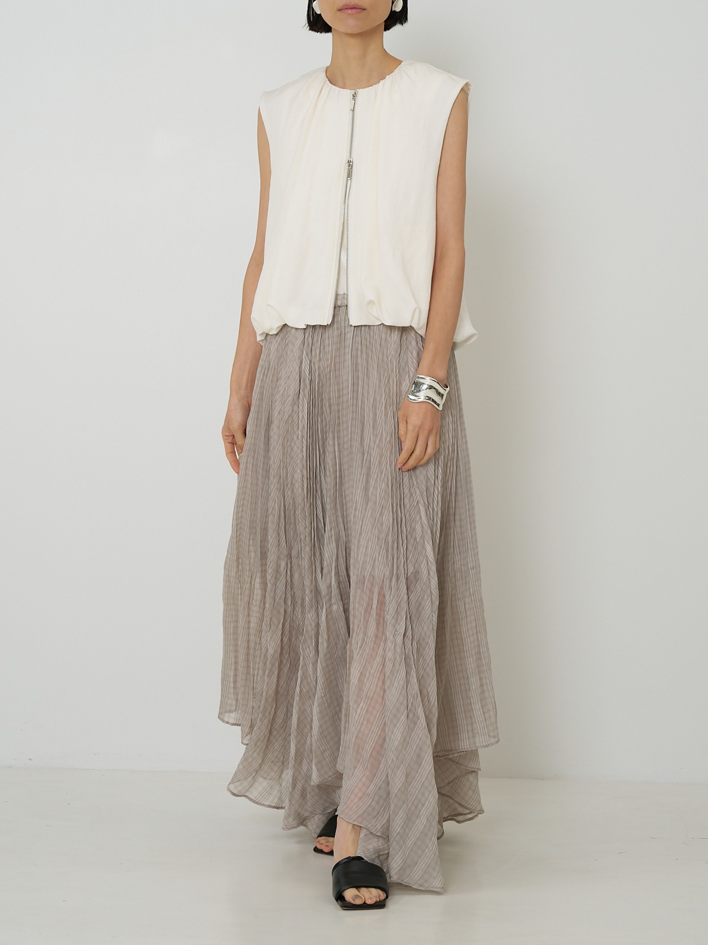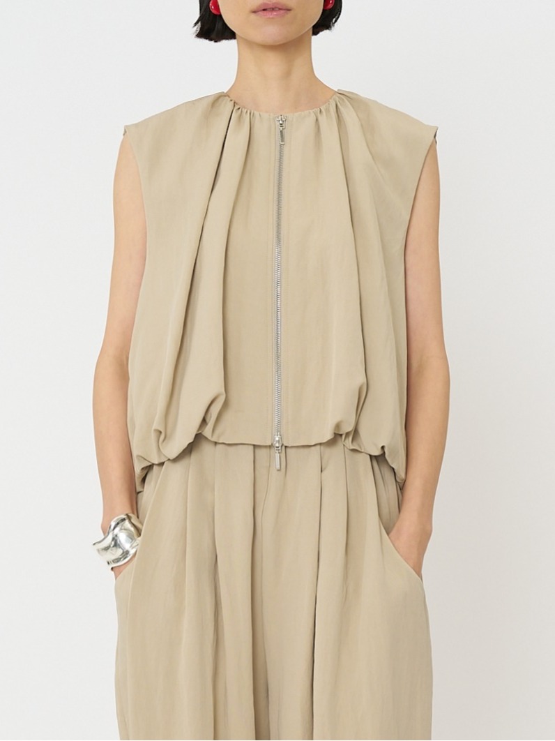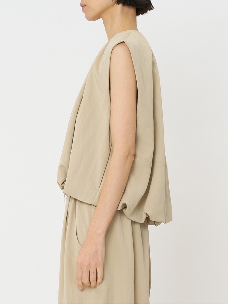 計算されたタックアンドギャザーでまとめたバルーンシルエットが映える、ショートレングスベストです。