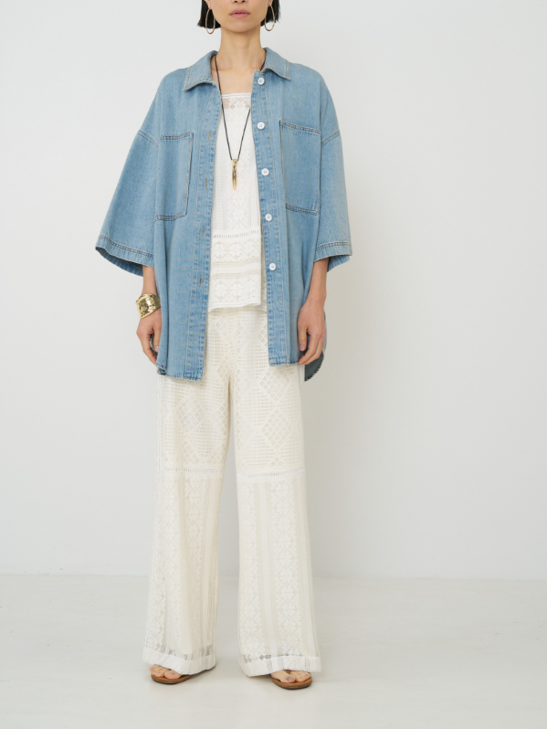 三種類のレースをパッチワークさせて作ったクラフト感あふれるデザインワイドパンツ。