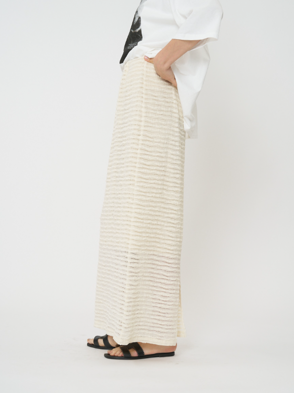 クラフト感のあるジャカードレースを横づかいし、ボーダー調の畝が効いたストレッチ性の高いレーススカートに仕立てました。伸びの良い生地で動きやすく、スタイルアップ効果も抜群。足元の透け感が軽やかで、シンプルなスタイリングに華やかさをプラスしてくれます。