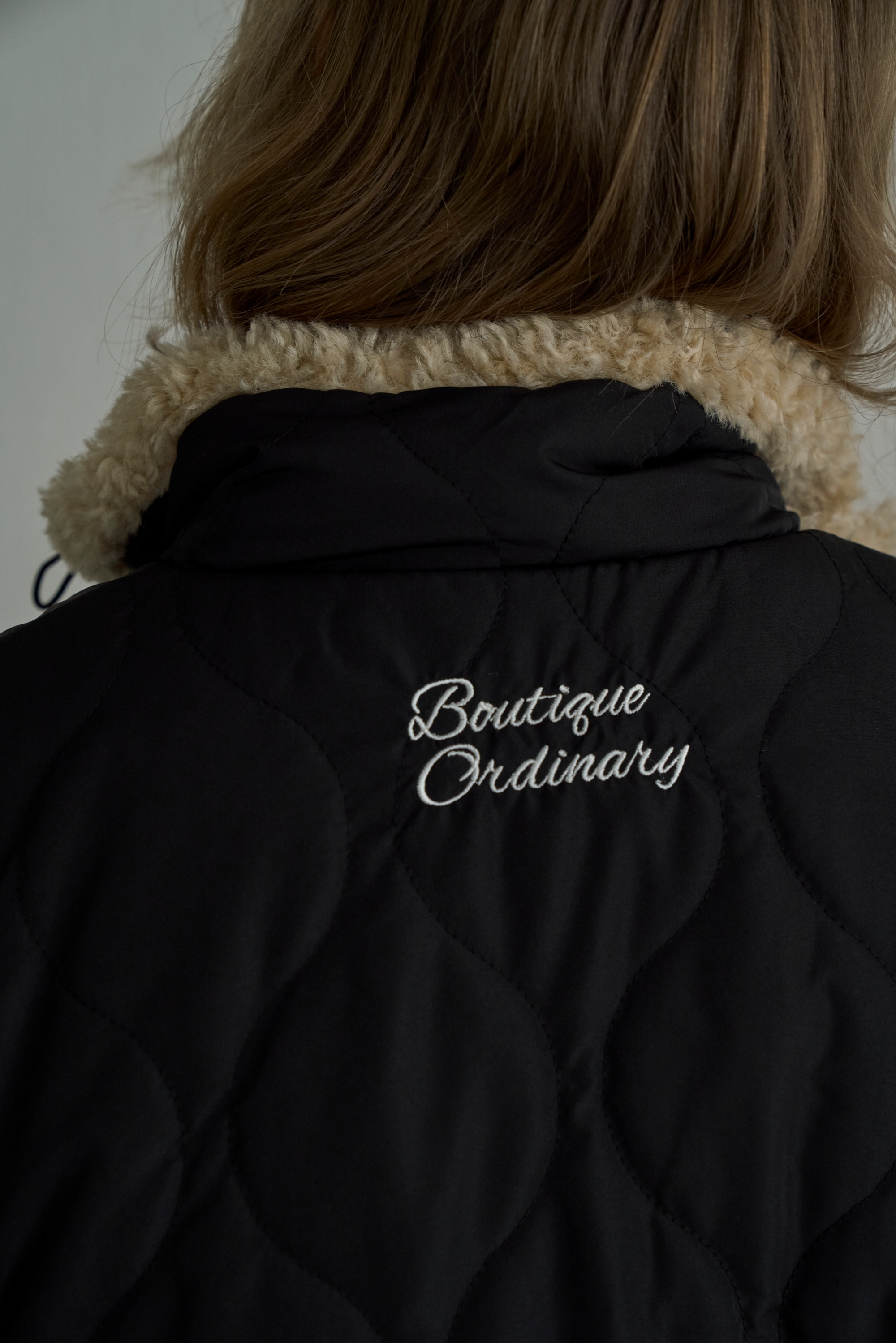 キルティング面バックスタイルに配したボア同色のブランドロゴ刺繍がアクセントになっています。