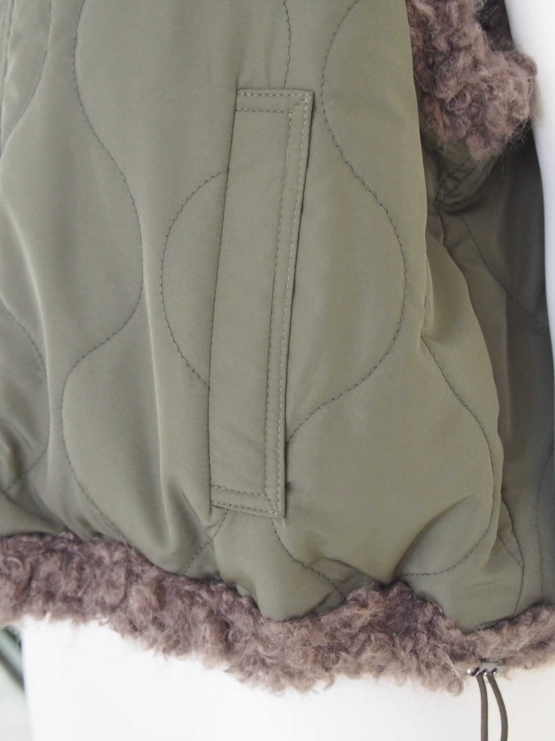 片面はヘチマ柄キルティングにボアトリミングを施したミリタリーテイスト、もう片面は全面ファーで大人っぽく上品な雰囲気に仕上げました。