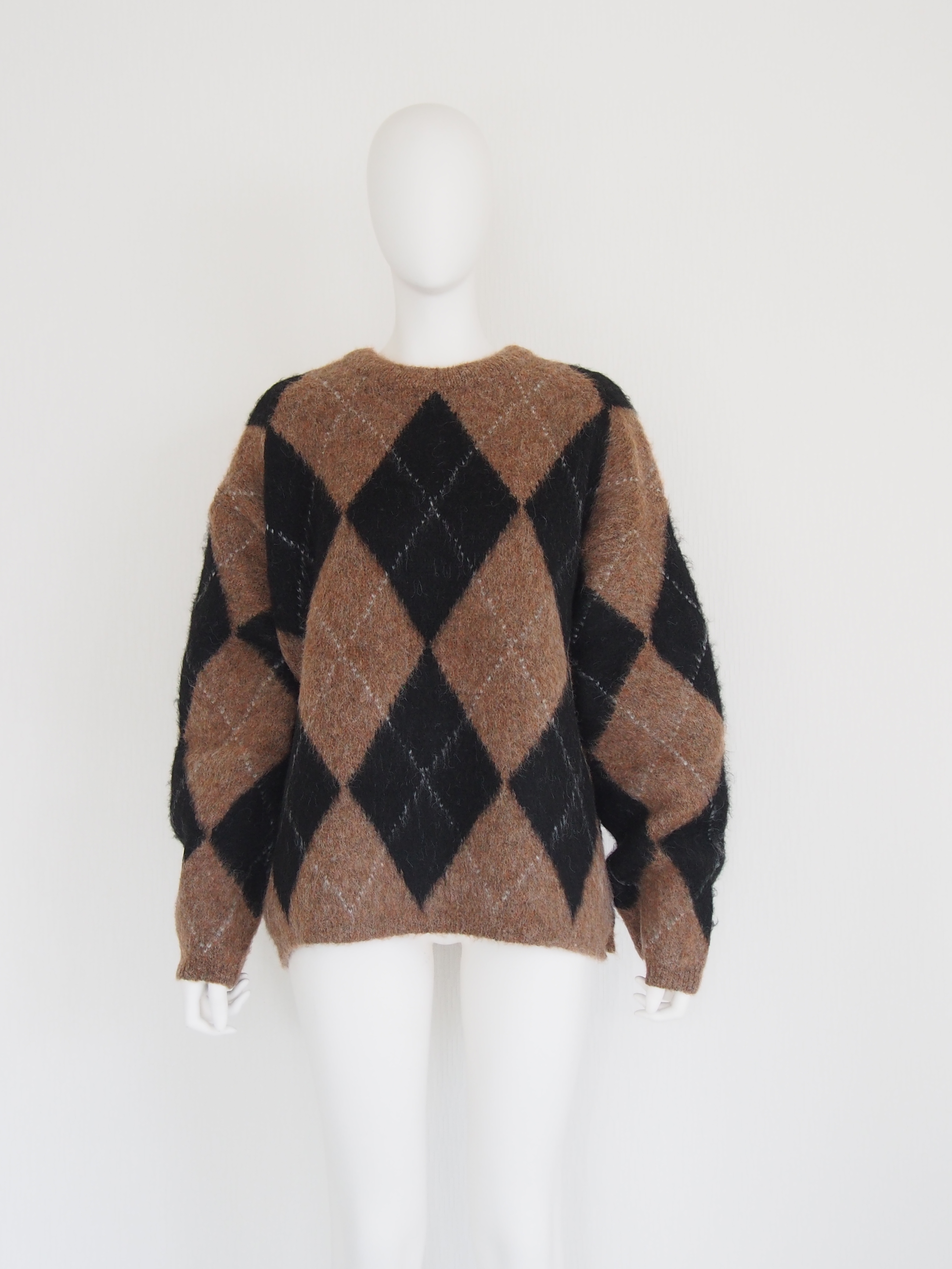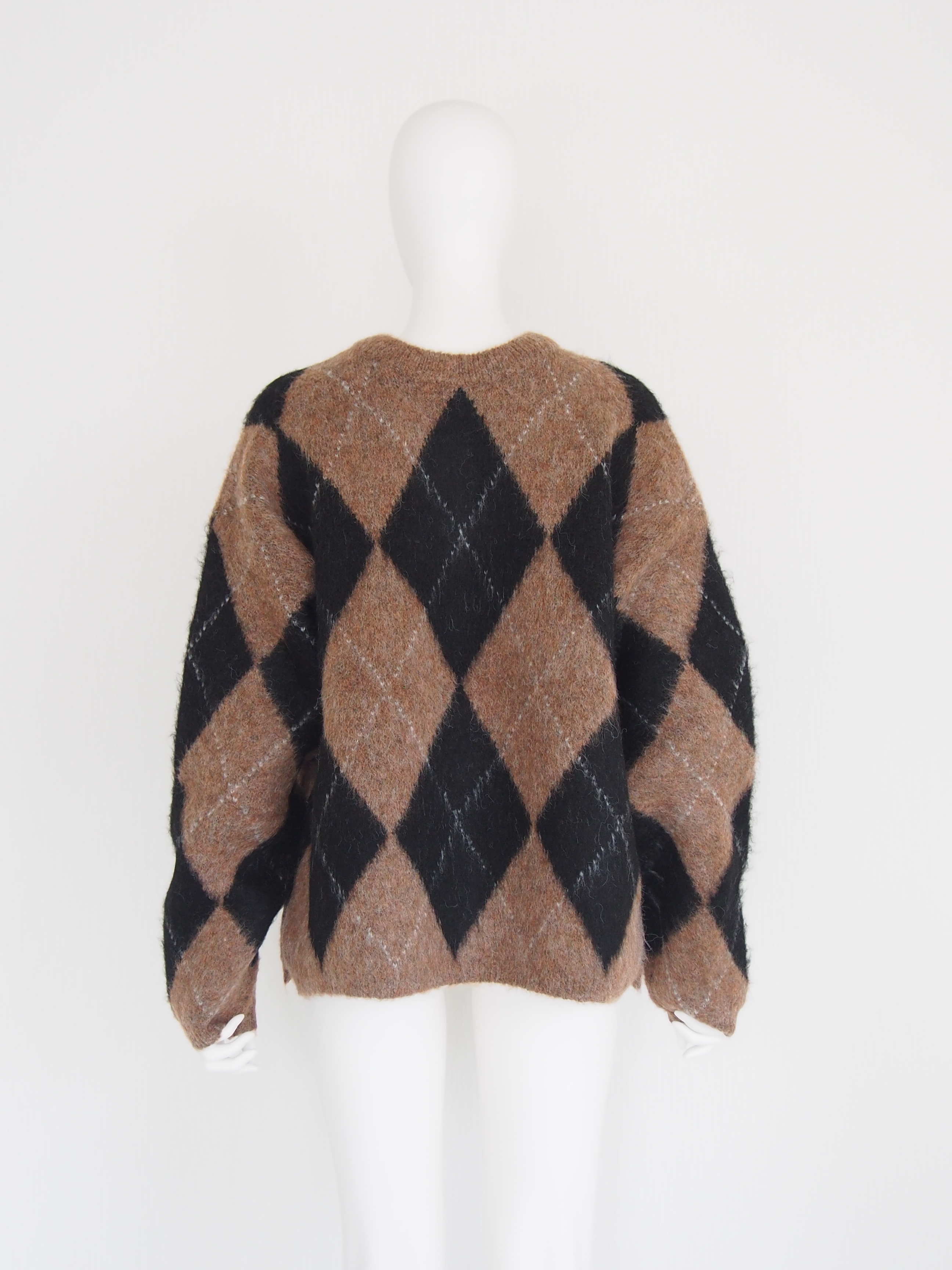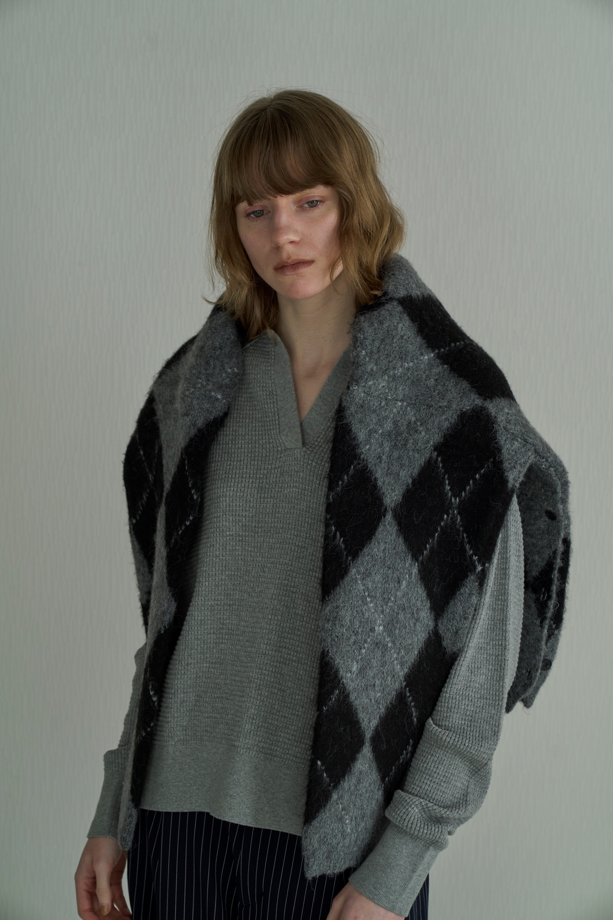 アクリル混の糸を5ゲージのアーガイル柄ジャガードで編み上げた存在感あるニット素材。