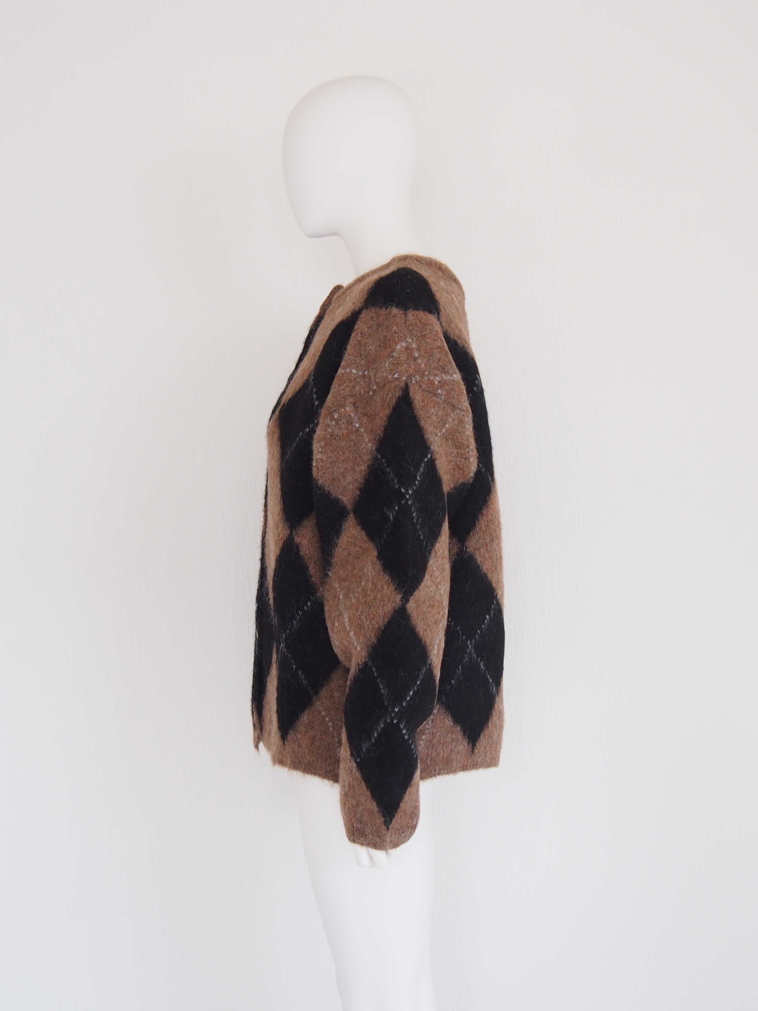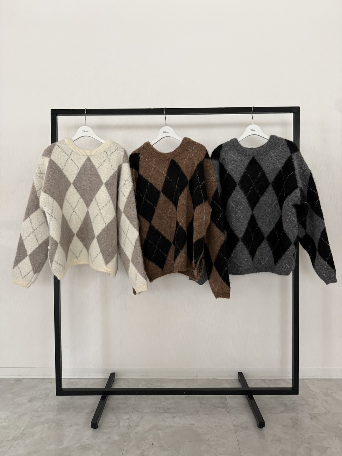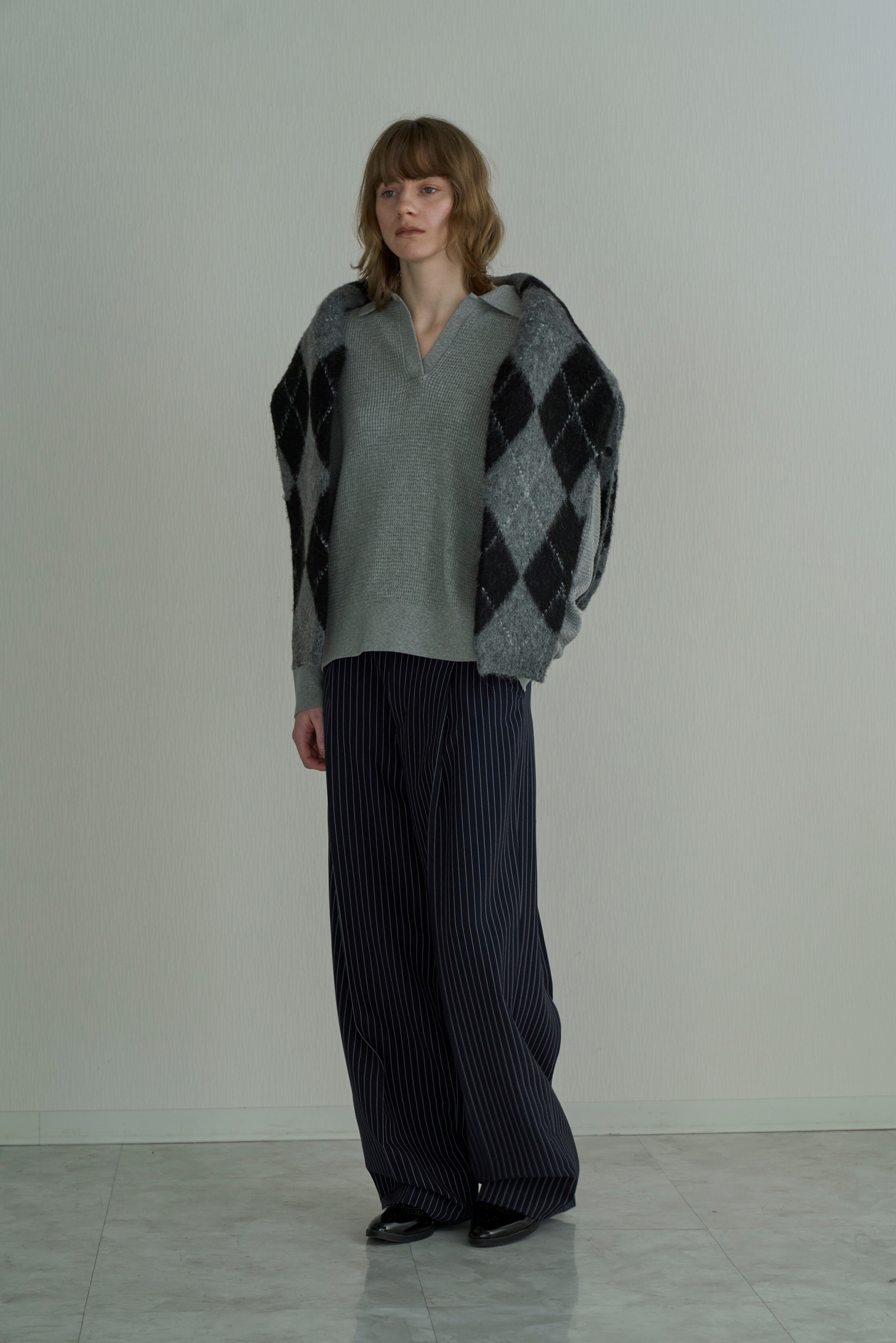 アクリル混の糸を5ゲージのアーガイル柄ジャガードで編み上げた存在感あるニット素材。