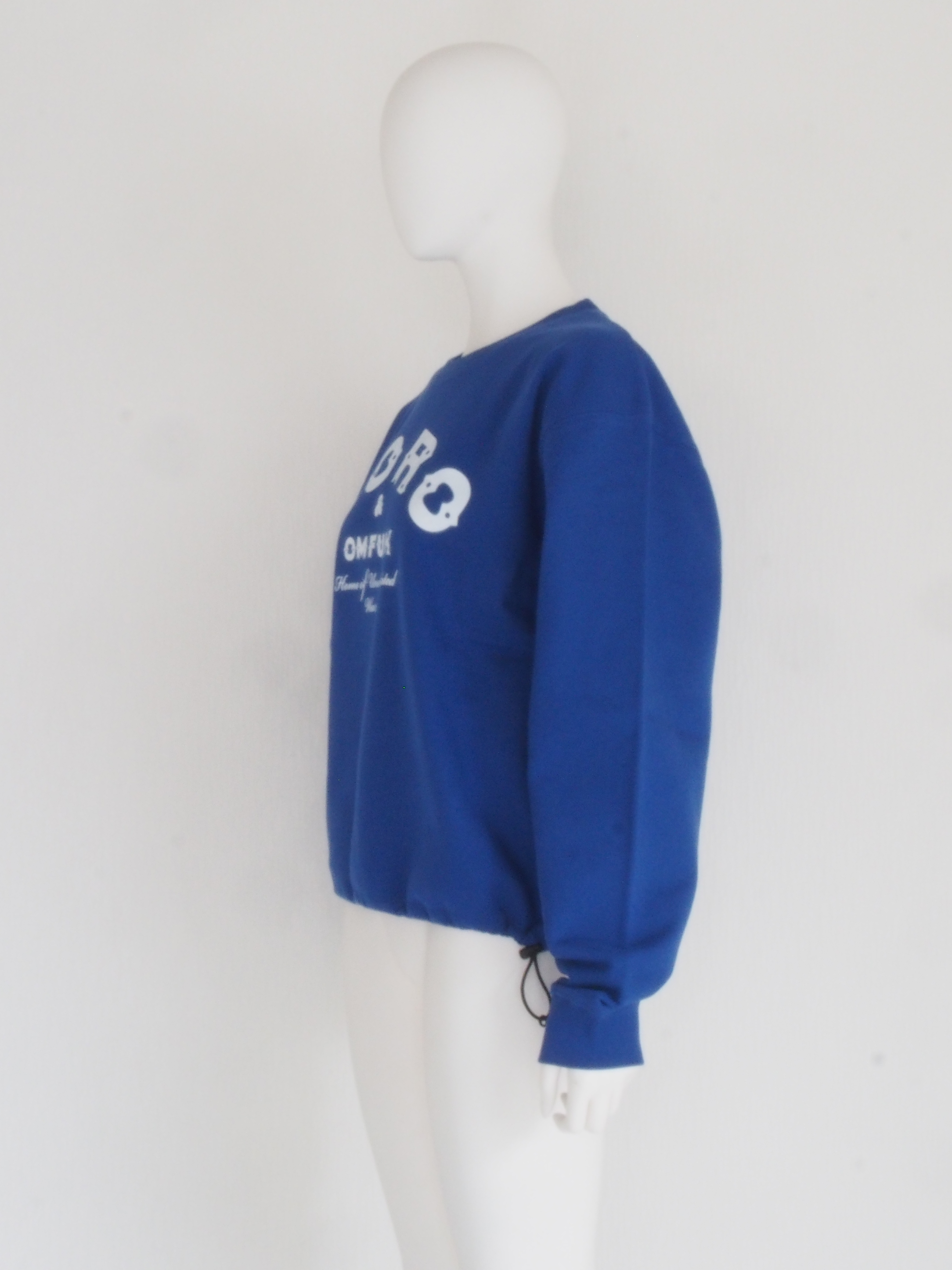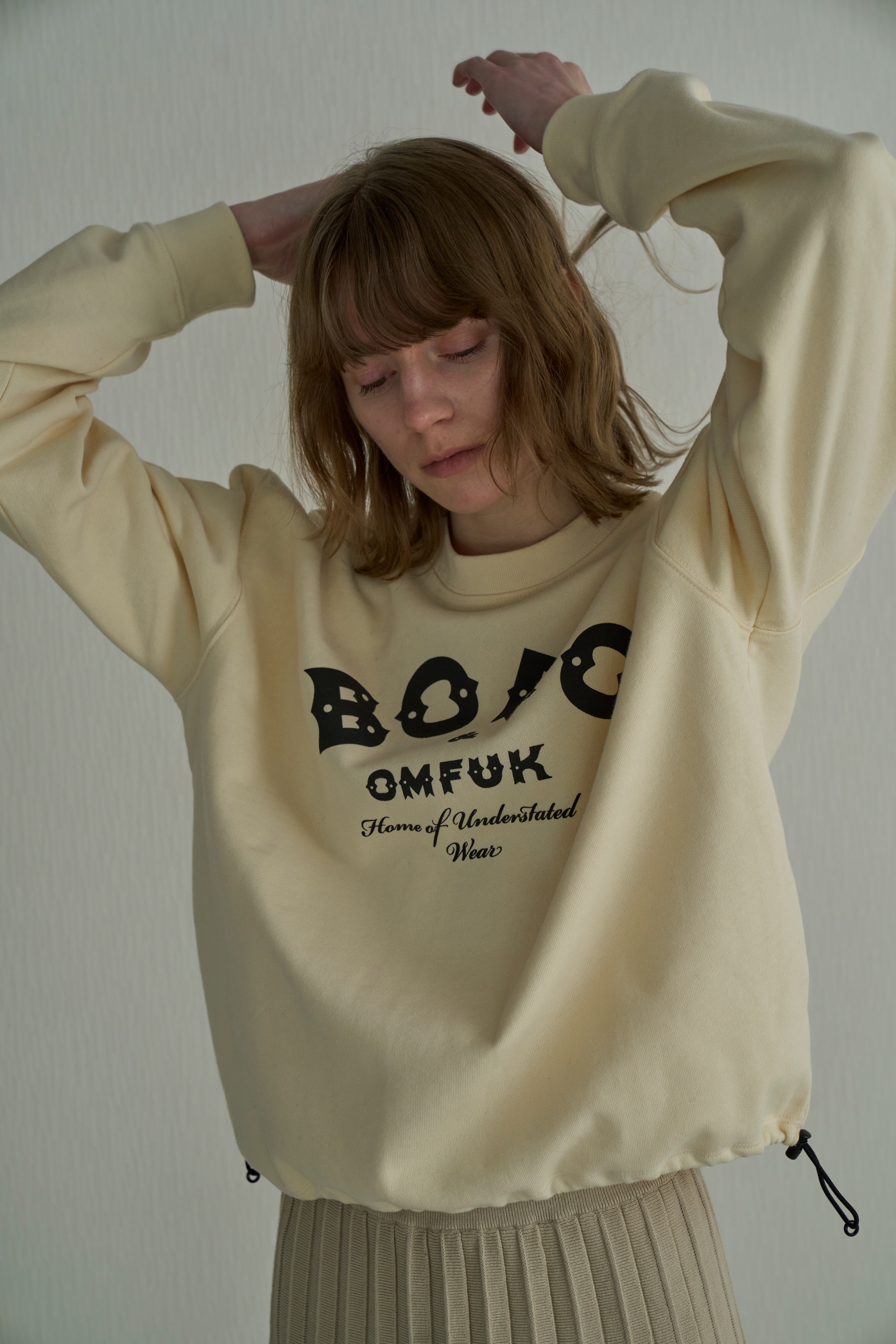程よくゆとりのあるサイジングの裏毛トレーナーの裾にスピンドルを通したリメイク風アイテム。