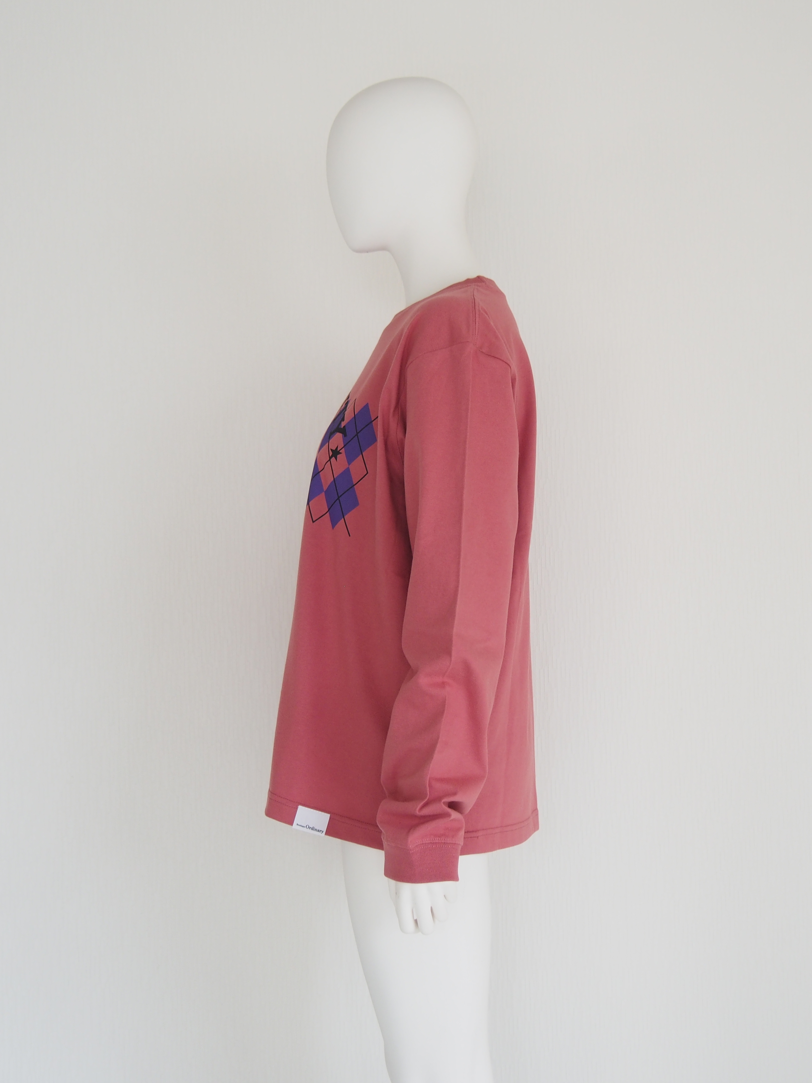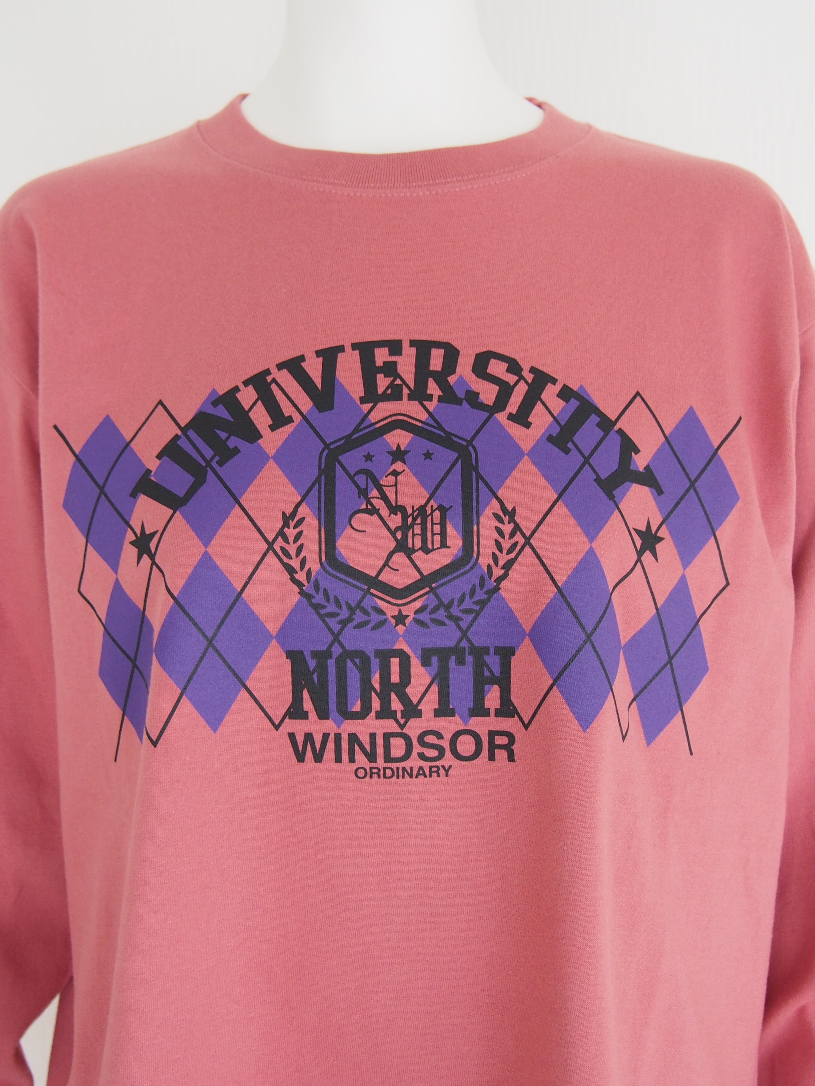 アーガイル柄とカレッジモチーフを組み合わせたグラフィックが印象的なロングスリーブTシャツ。