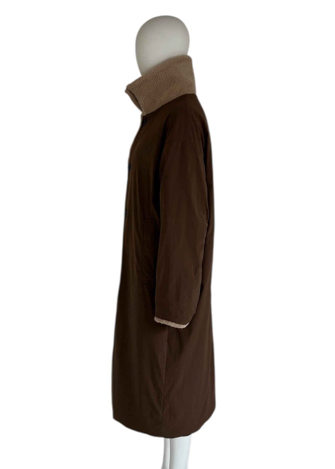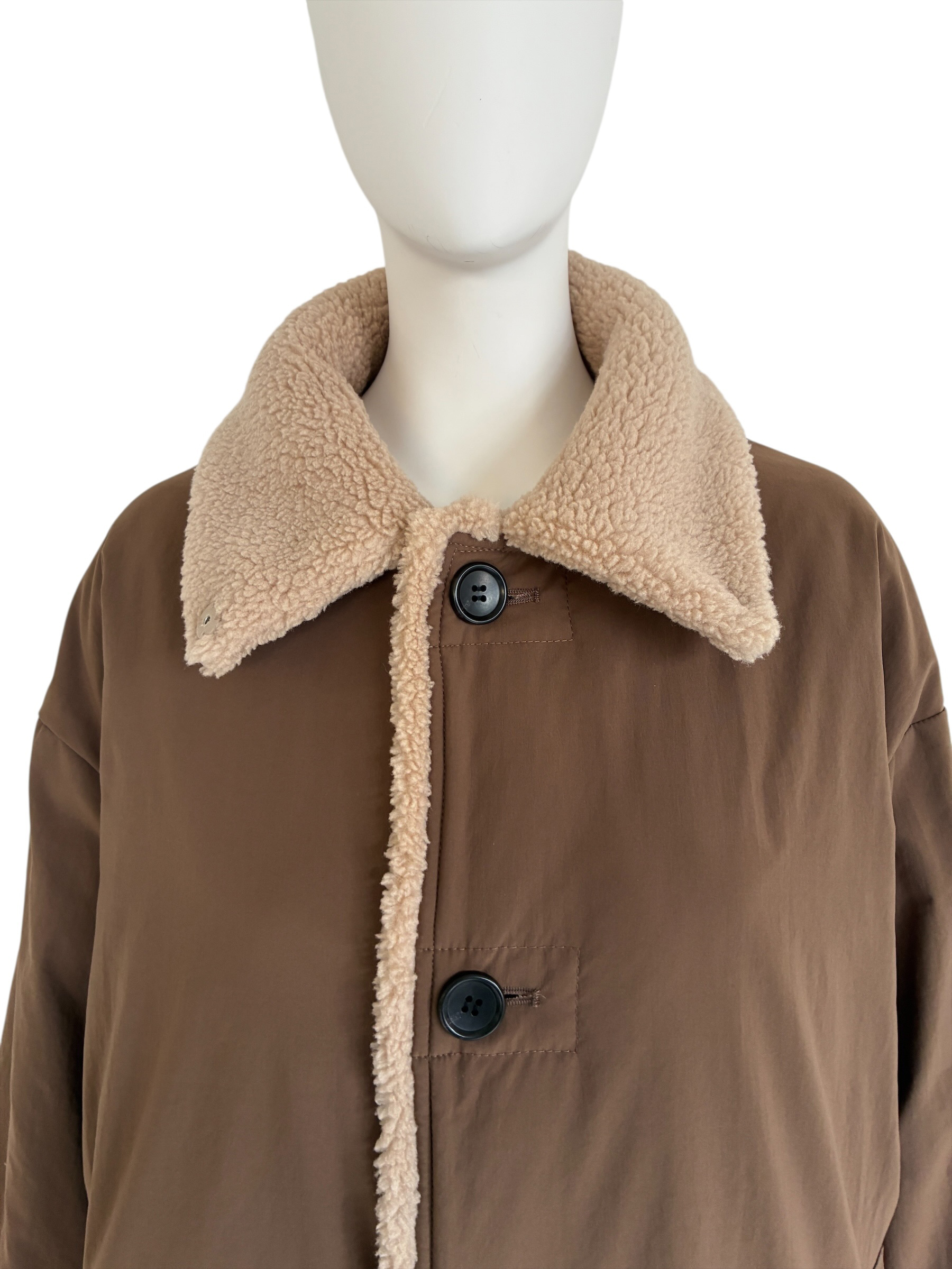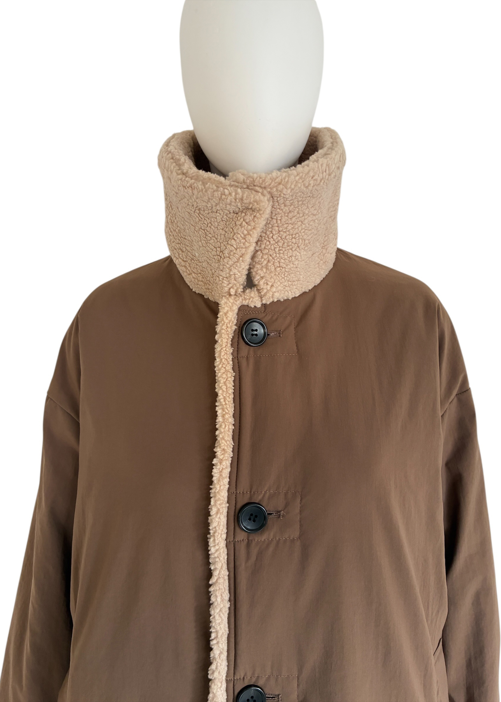 襟・前端・袖口にボアをあしらった、リバーシブル仕様のダウンコート。