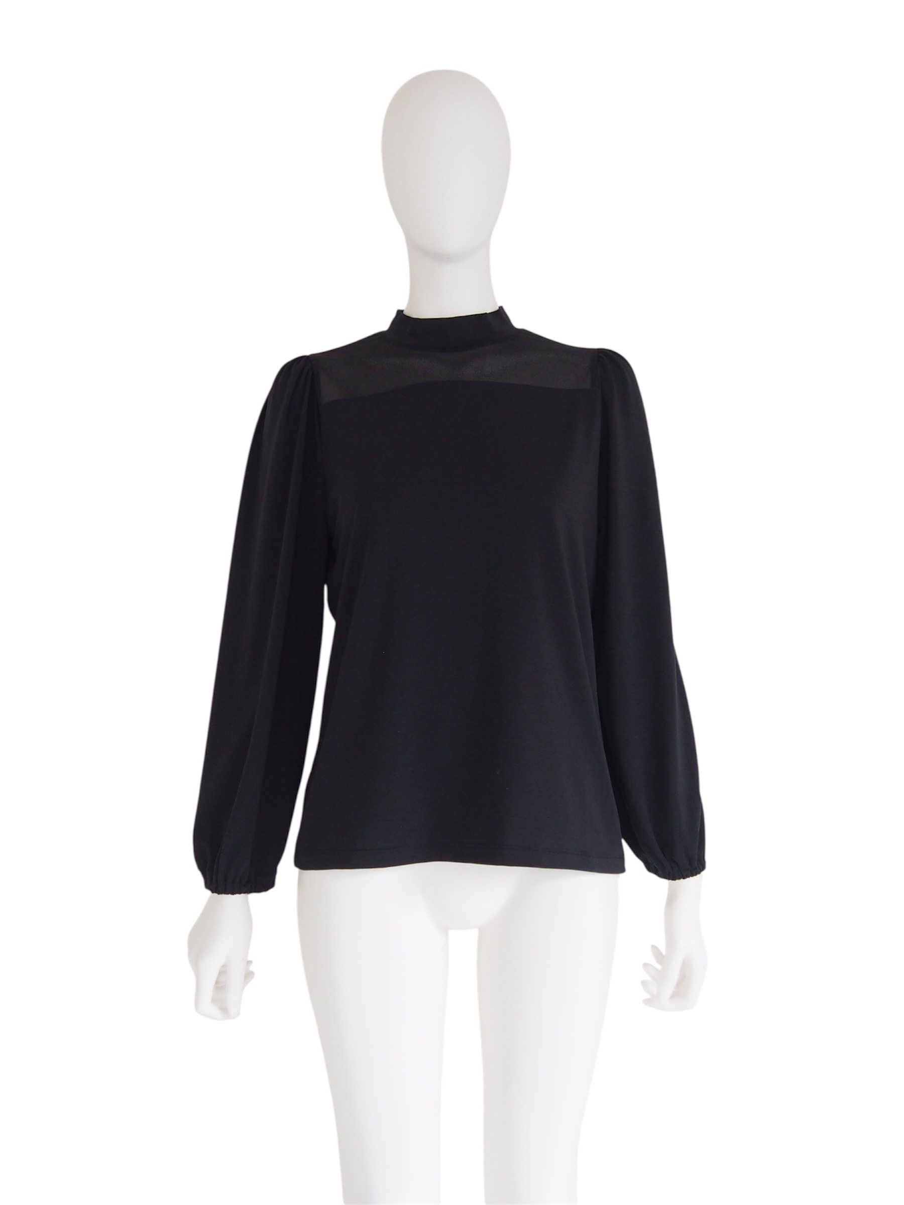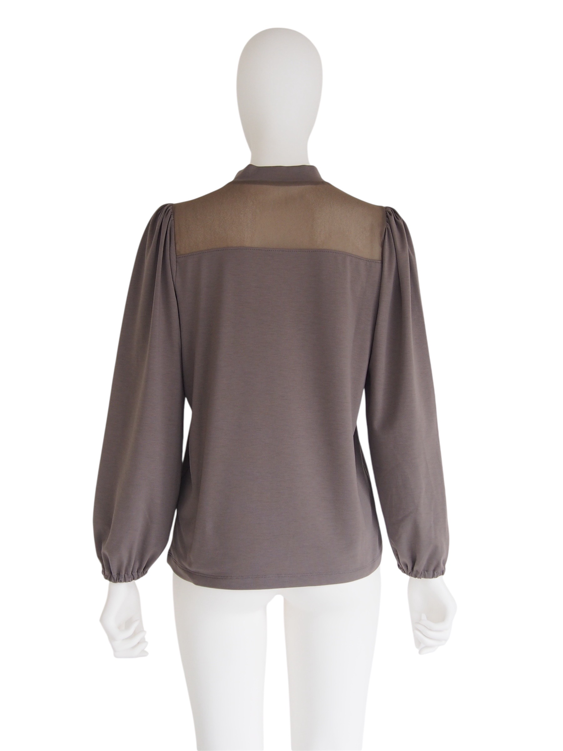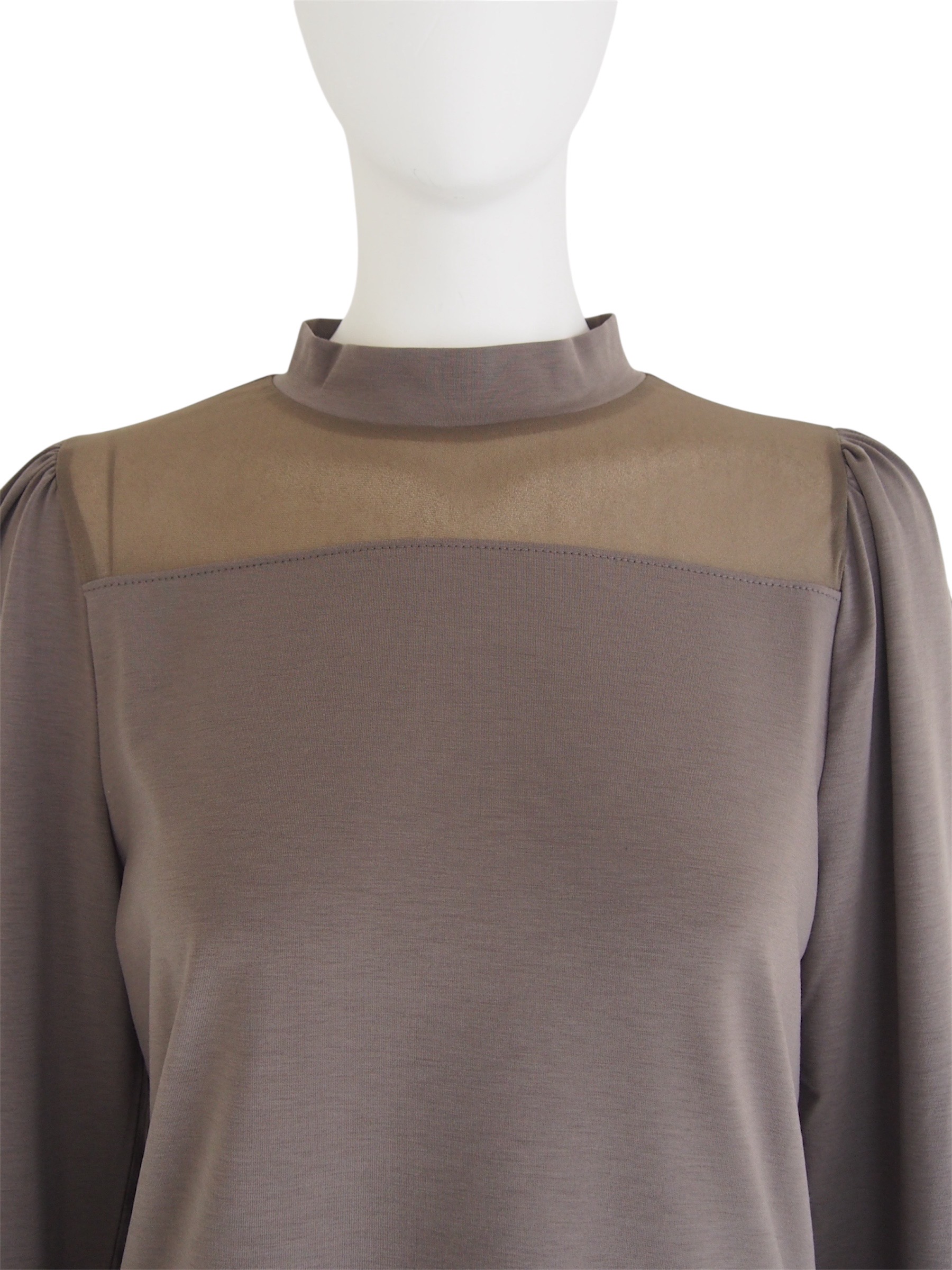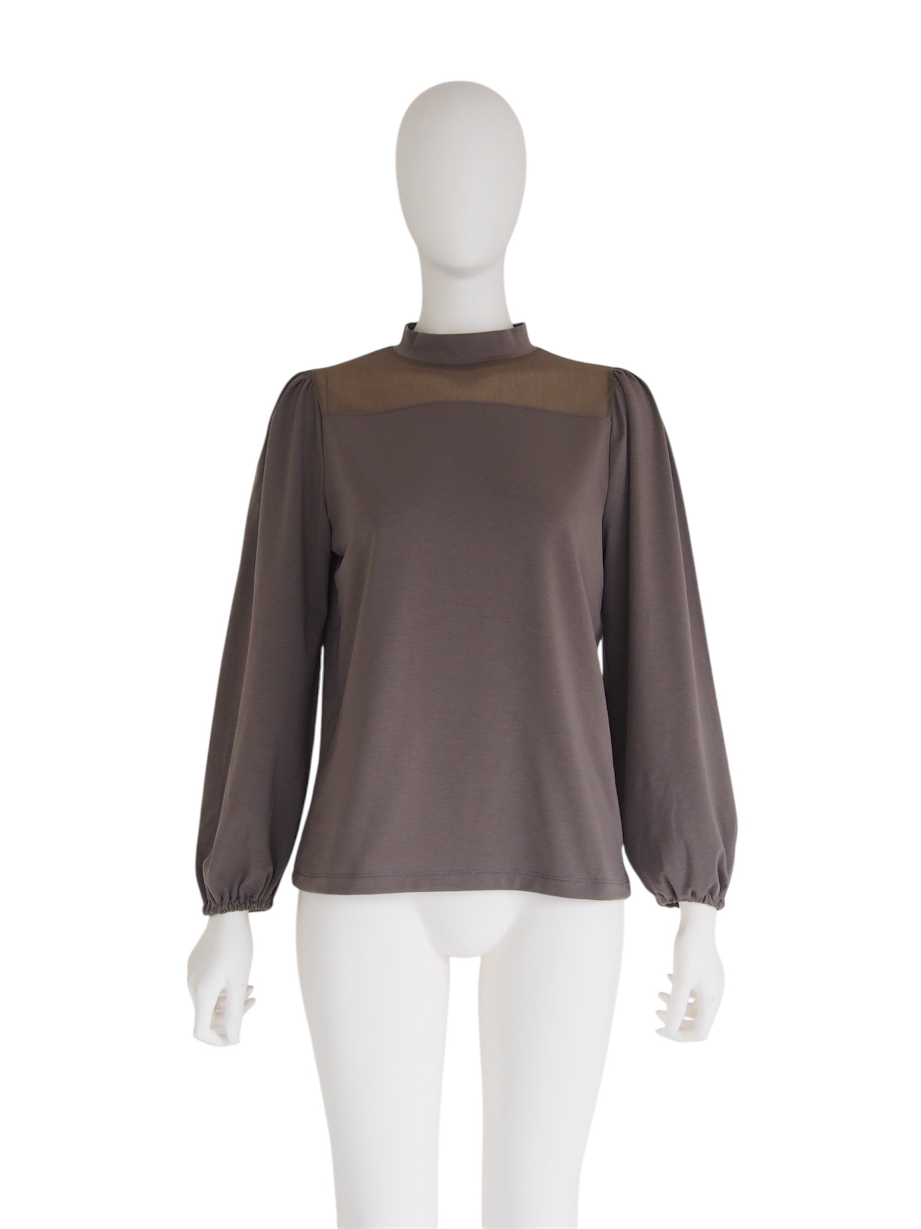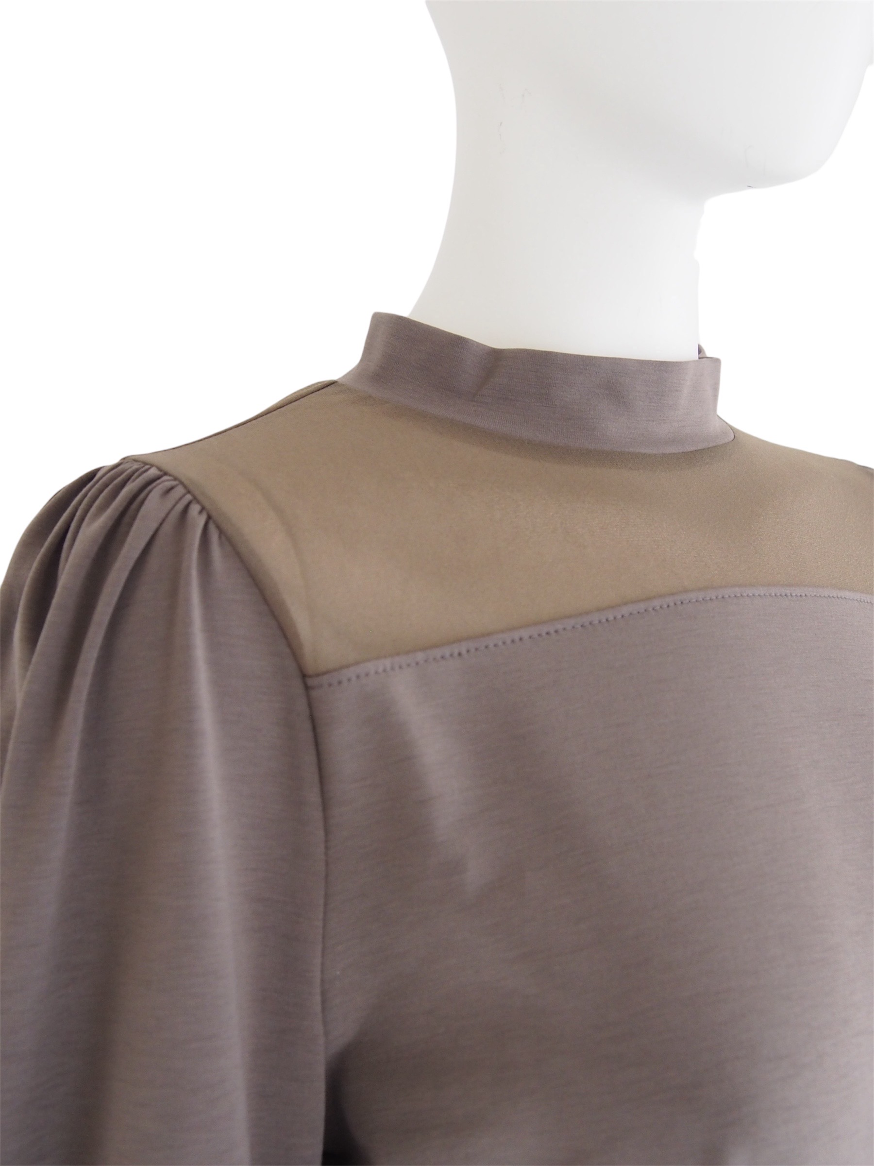 デコルテ部分には繊細なシアー素材を切り替え、上品なアクセントをプラスしています。