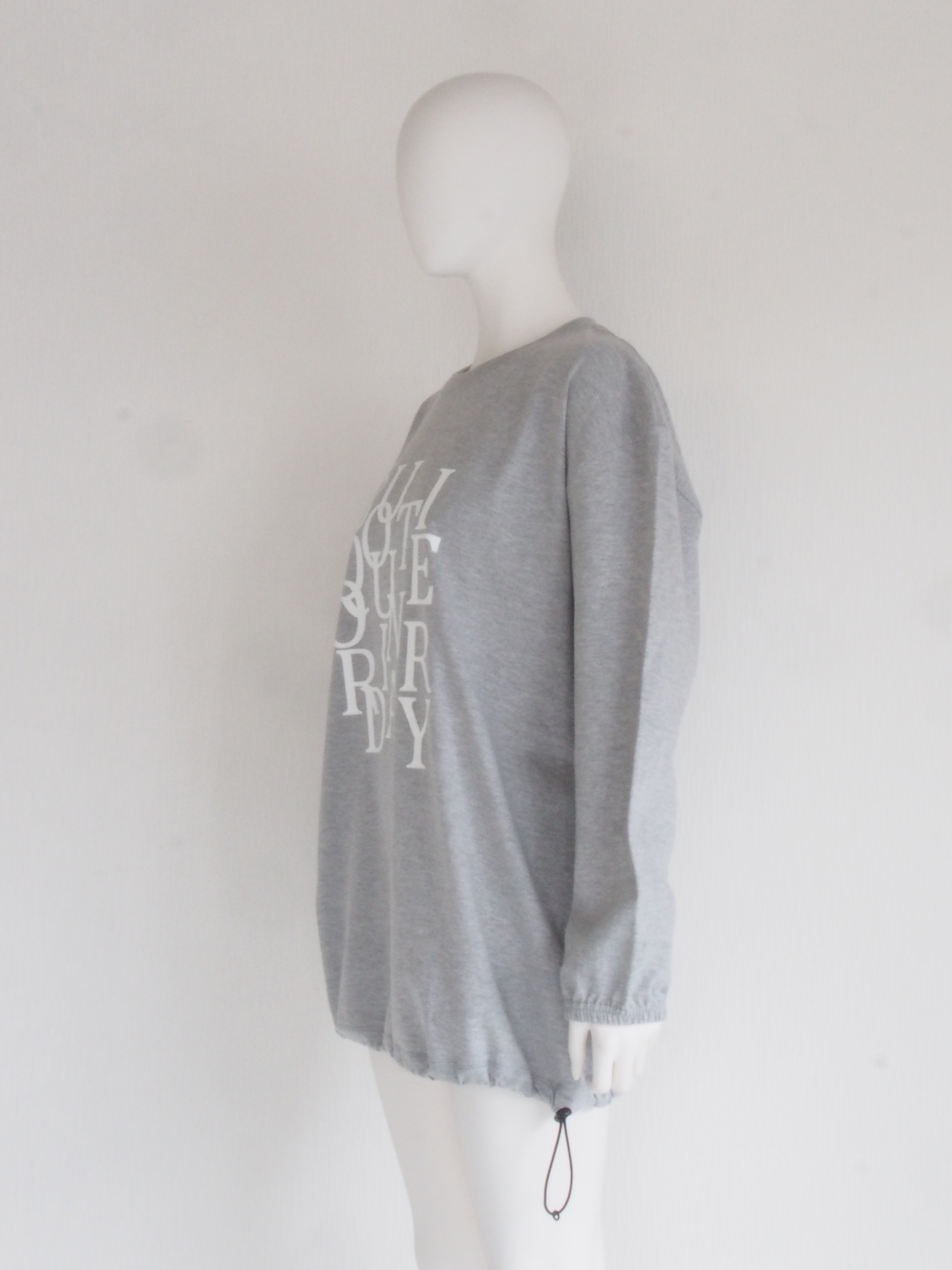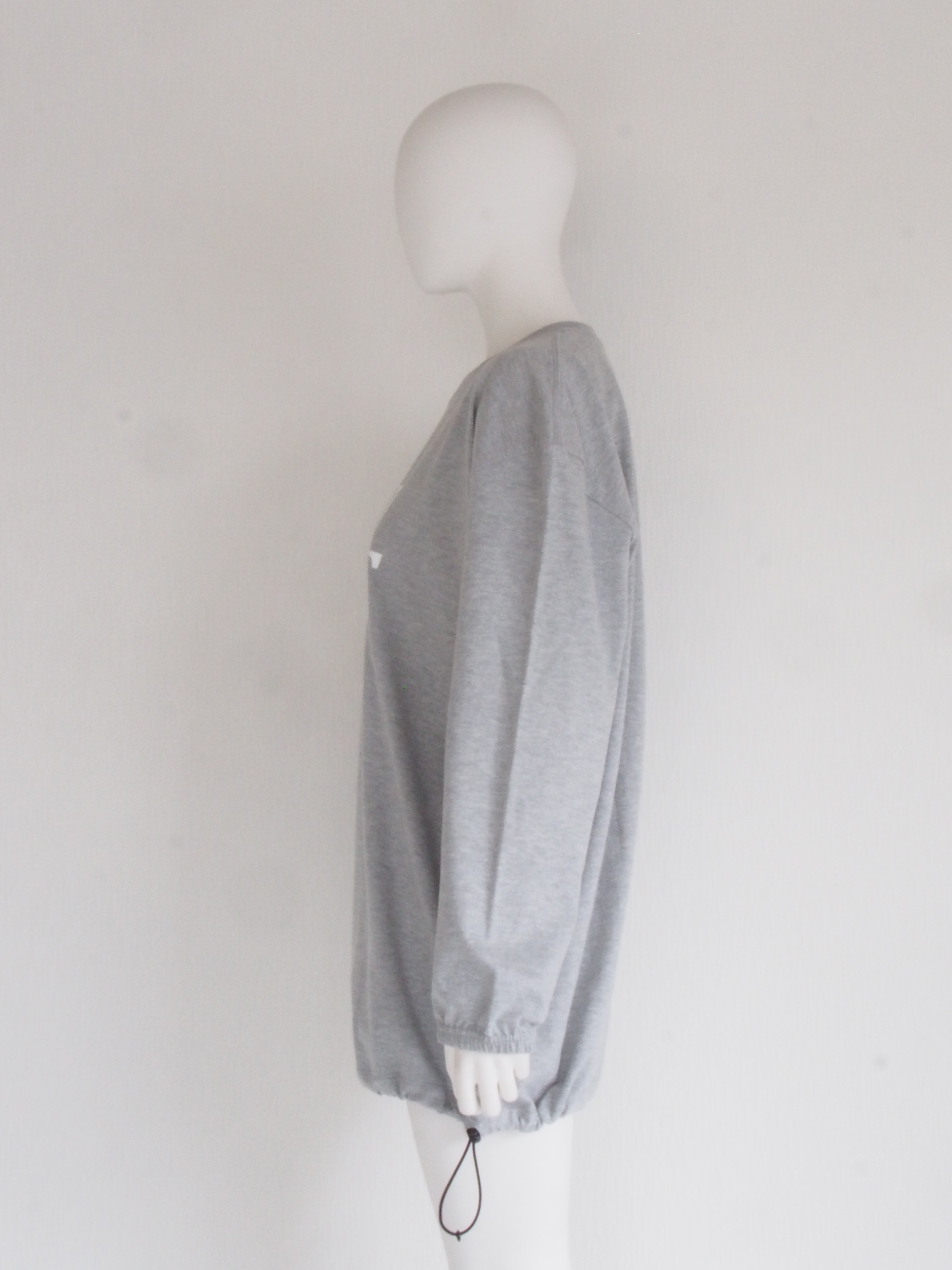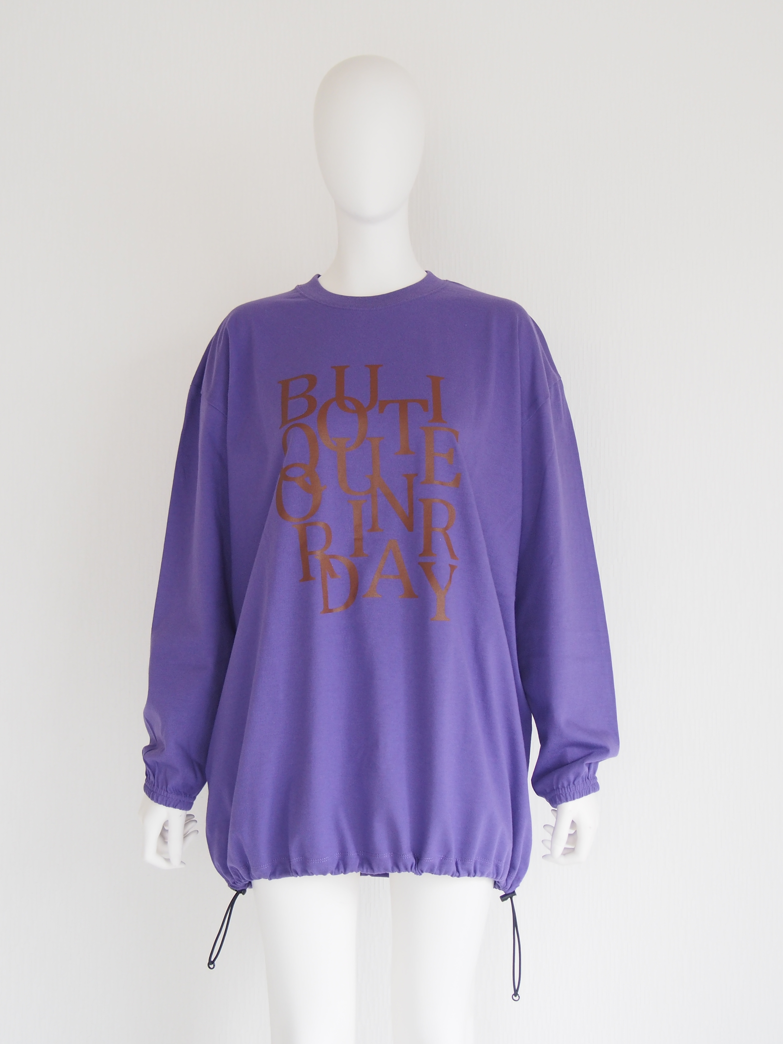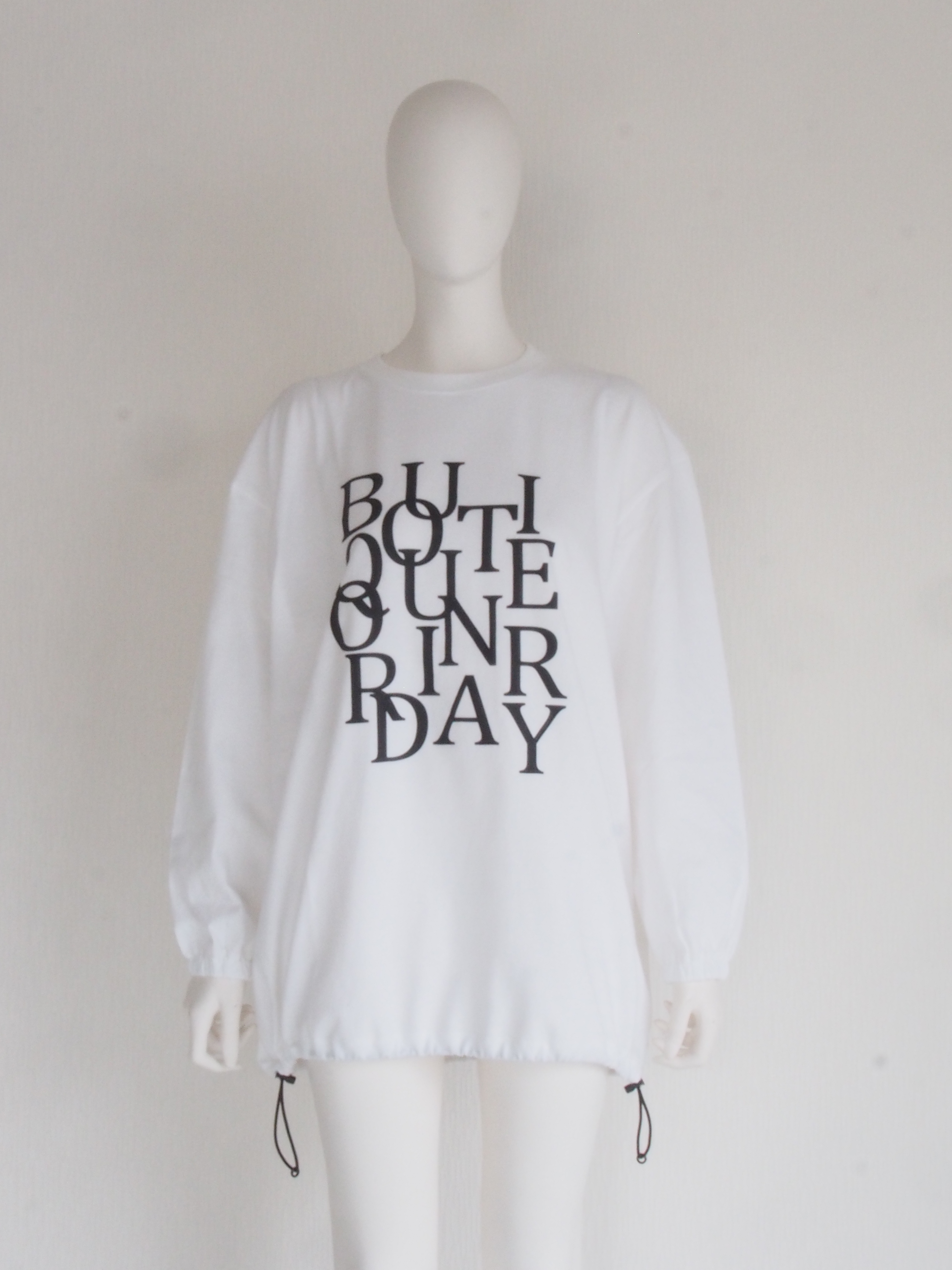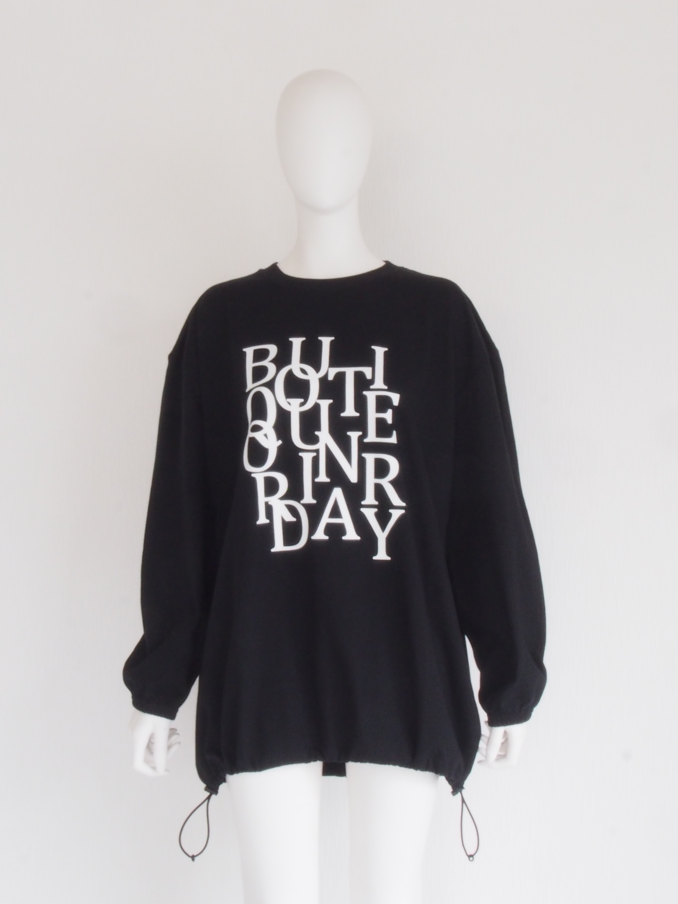 オーバーサイズのロングスリーブTシャツの裾にスピンドルを通した、リメイク風デザインのアイテム。