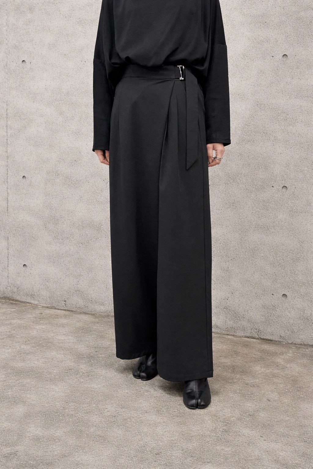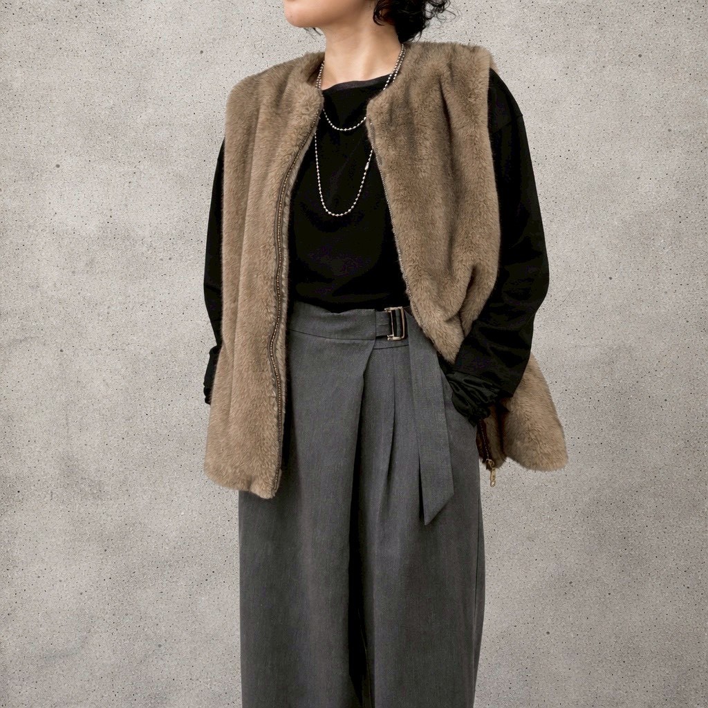 サイドのベルトデザインがアクセントになったラップパンツです。後ろウエストはゴムになっており、リラックスした着用感です。前の合わせ部分でボタンが三段階に調整できるのも嬉しいポイント。