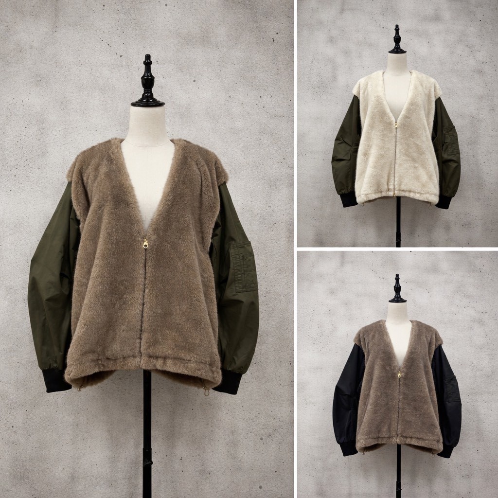 MA-1のディティールを取り入れた袖と肌触りの良いタッチのエコファーのドッキングミリタリーブルゾンです。