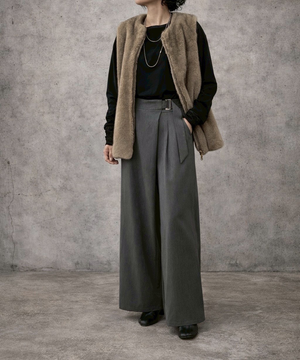 ボリュームある素材を使用していますが、ノーカラーの深めのVネックでですっきりと着用いただけます。