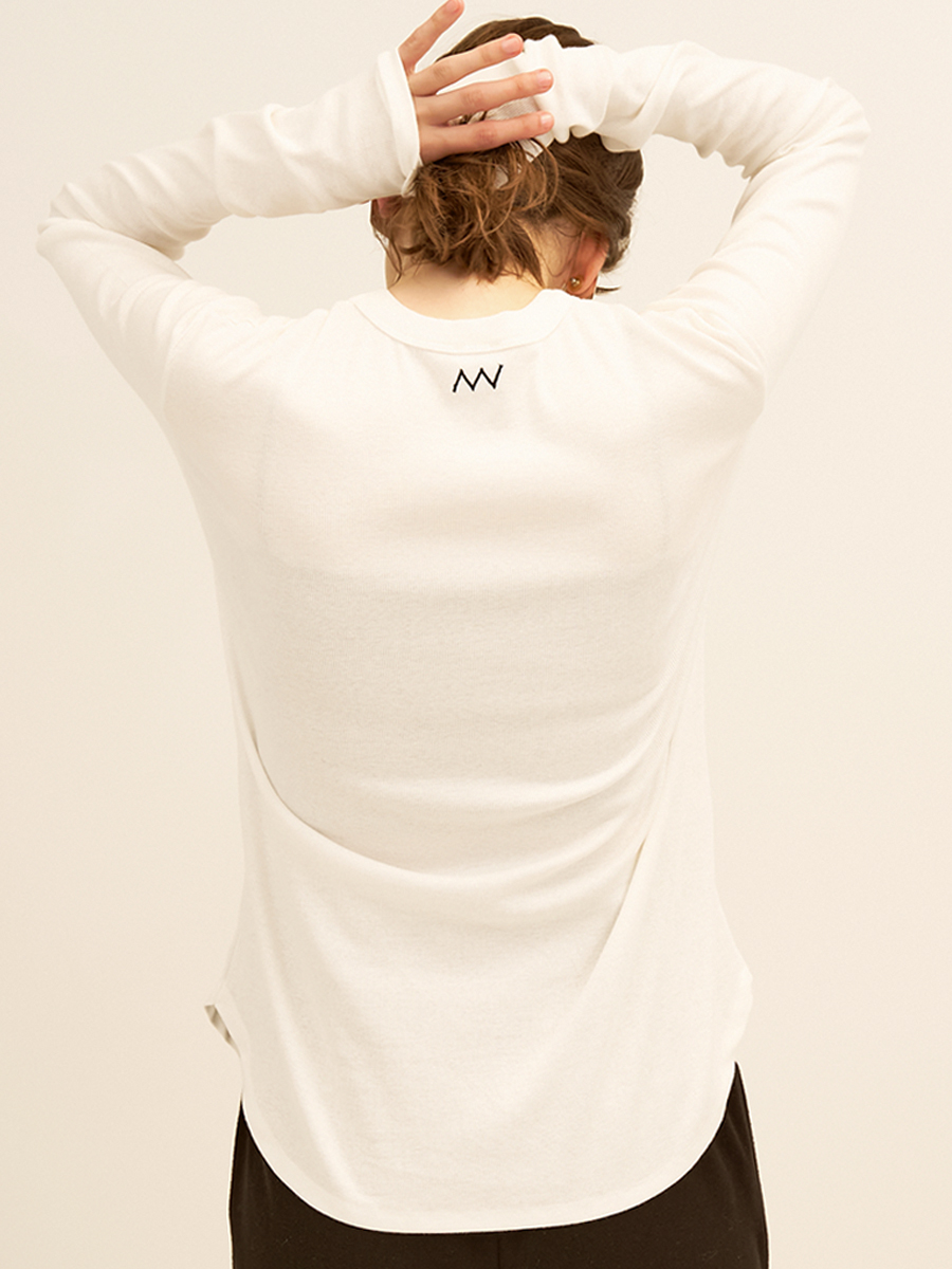 繊細な綿素材のリブ生地を使用。通常の糸と比較して格段に毛羽が少なく、シルクのような光沢や滑らかさがでるというのが特徴のコンパクトヤーンを使用したリブ生地を採用、上品な滑らかさのあるコットンリブは肌さわりも良くおすすめです。 程よく体に沿うようにデザインされているので、レイヤードのインナーにも最適です。 後衿ぐりに施したワンポイント刺繍もほどよいアクセントに。 衿ぐりはあえて狭く設定、ニットやシャツの下に着たときに衿ぐりからTシャツを覗かせるスタイリングがおすすめの着こなしです。