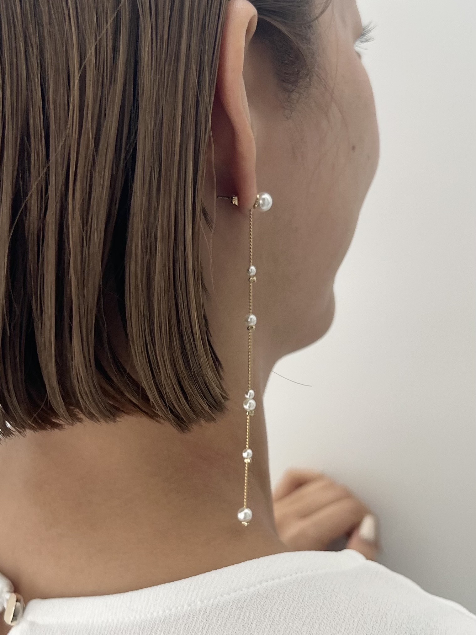 大小異なるパールが上品に揺れ動くロングパールチェーンピアスは、着けるだけで女性らしい華やかな耳元に◎マルチWAY仕様なので、パールチェーンを1本ずつにしたり、片耳のみにチェーンをまとめてアシンメトリーにしたり、パールピアスのみ着けたりと様々な着け方を楽しめます。